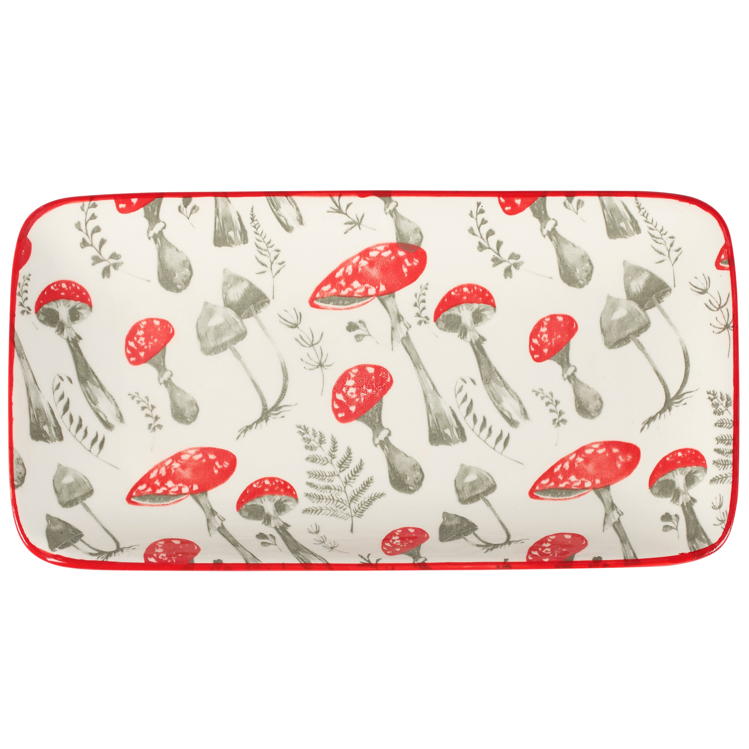 A durable stoneware platter from ourĀ Cottagecore Collection displaying a wild mushroom pattern on the inside of the platter with red accent on the rim. Our rectangular Red Mushroom platter is conveniently microwave, oven, dishwasher, and food safe for easy use. A piece of rustic tableware perfect for nature-themed tablescapes.