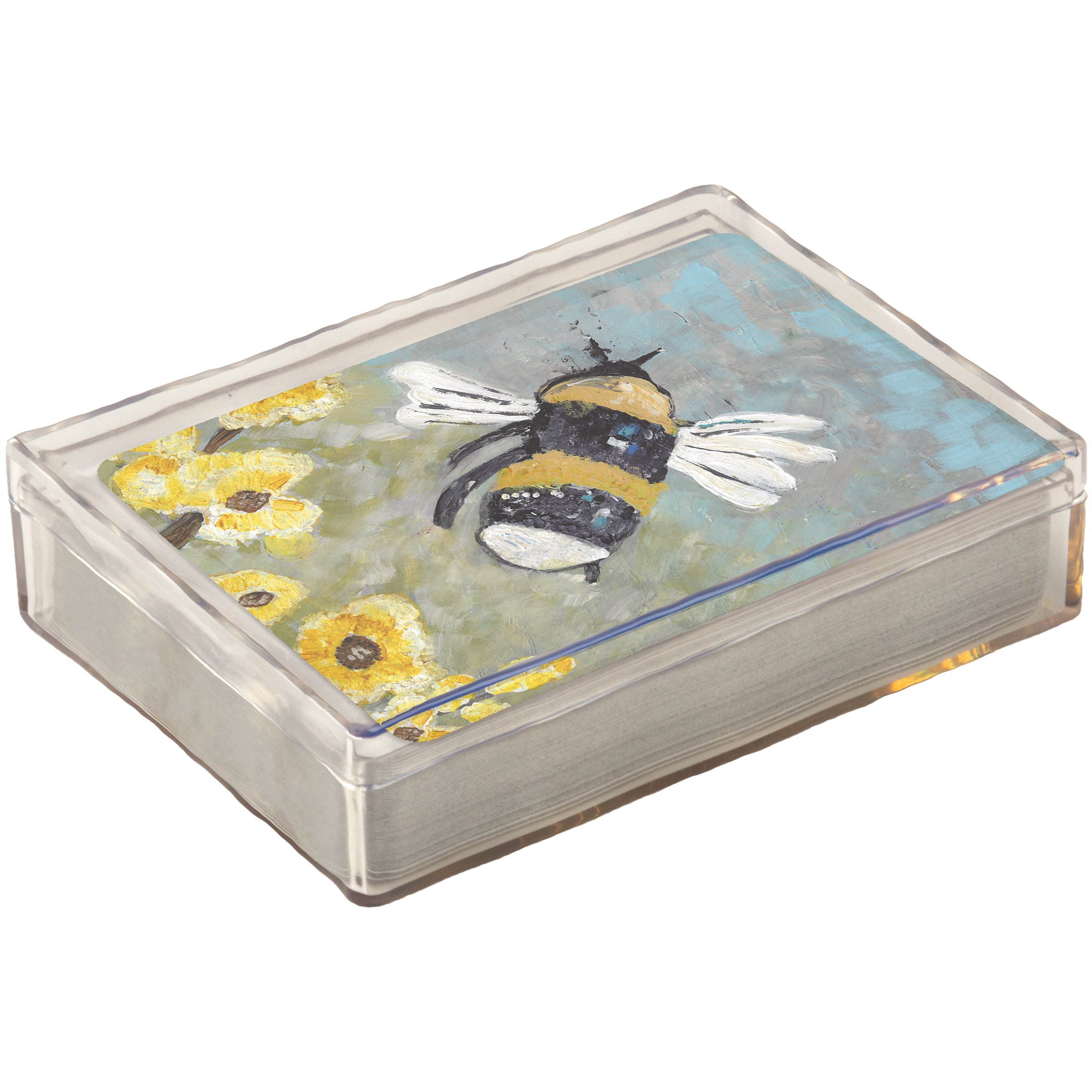 A 54-card playing deck from our Friendship Heart Gallery Collection displaying hand painted art of a bumble bee buzzing around yellow flowers on each card. Design is replicated from original art created at the Friendship Heart Gallery in downtown Lancaster, PA that supports artists with intellectual disabilities and autism. Our Bumblebee playing cards are packaged in a protective acrylic case for easy storage when not in use or traveling. A fun bee-themed accessory perfect for gifting and on the go games.