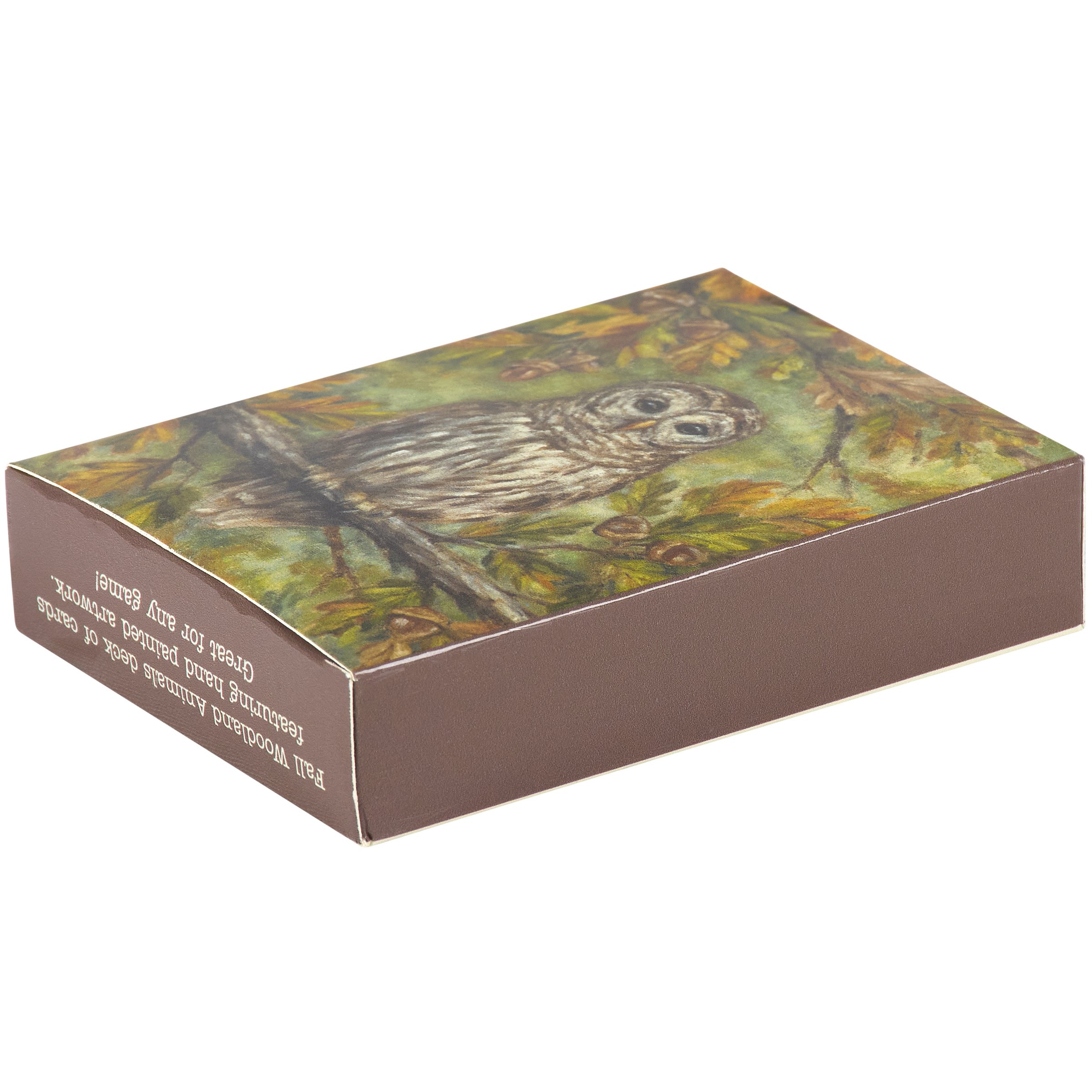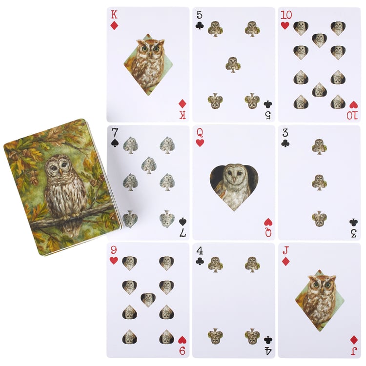 A 54-card playing deck from our Fall & Harvest Collection displaying a charming autumn scene of an owl in a tree on the back of each card. The face of each card features coordinating fall owl designs. Each fall owl design is replicated from original artwork painted onto burlap canvas, giving the art a unique depth and texture. Our Fall Owls playing cards are packaged in a protective carboard box displaying the full card art for easy storage when not in use or traveling. A fun fall themed gift perfect for on the go games.