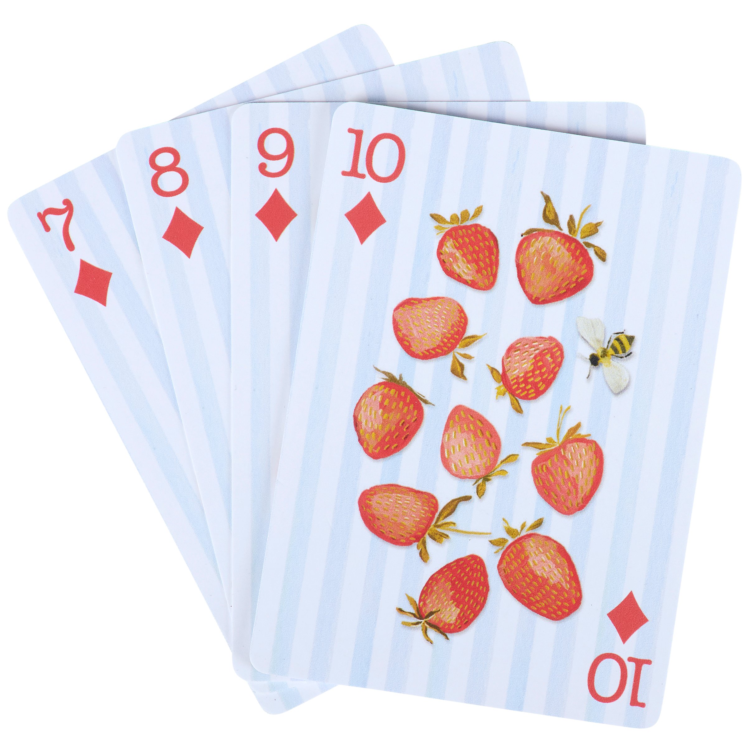 A 54-card playing deck from our Garden Collection displaying charming wild strawberry art and light blue stripe pattern on the back of each card. Face cards feature coordinating wild strawberry themed designs. Strawberry designs are replicated from original artwork hand painted in a unique watercolor style. Our Strawberries playing cards are packaged in a protective carboard box case displaying the full card art for easy storage when not in use or traveling. A stylish strawberry-themed gift perfect for on the go games.