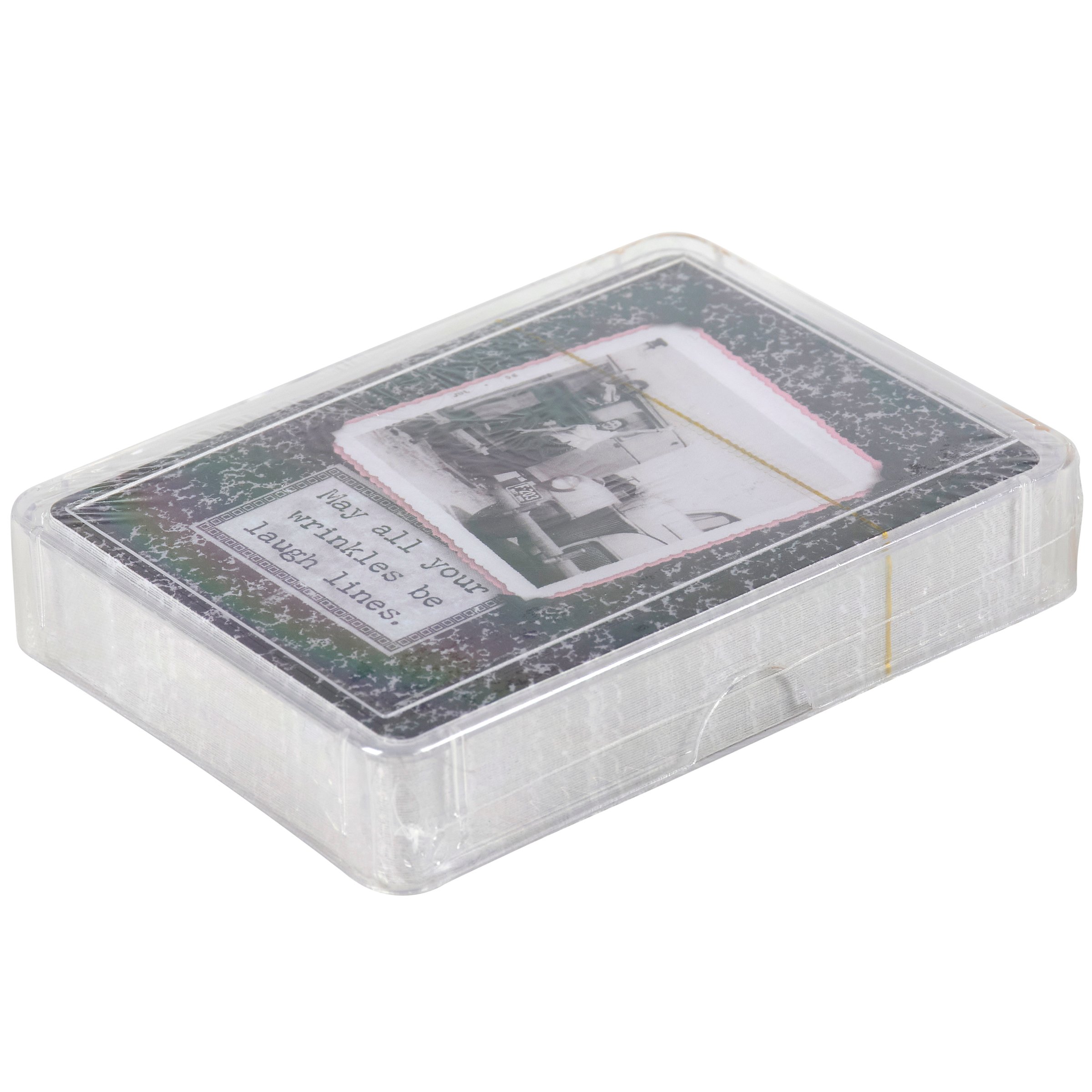 A 54-card playing deck featuring a variety of vintage photography and snappy sentiments on both sides of the cards. Cards are packaged in a protective acrylic case.