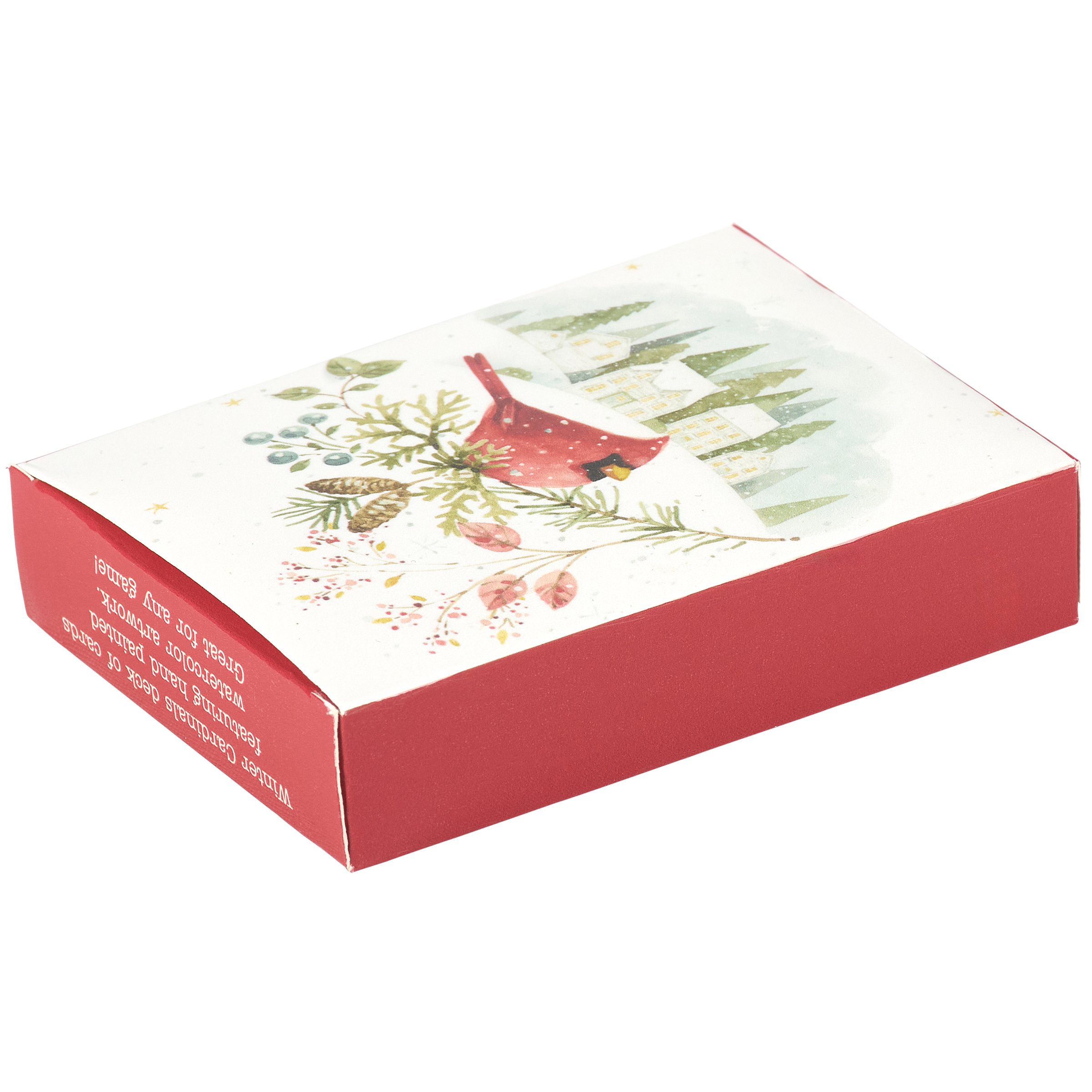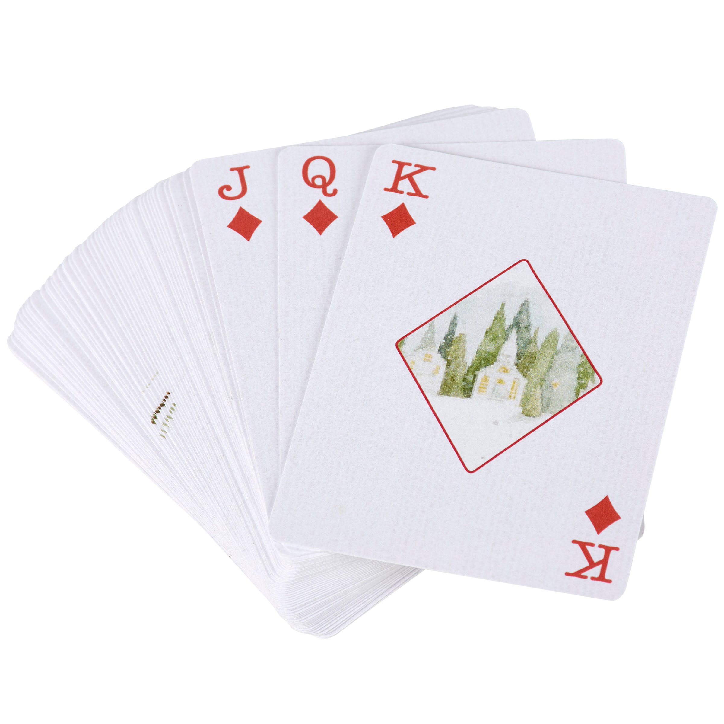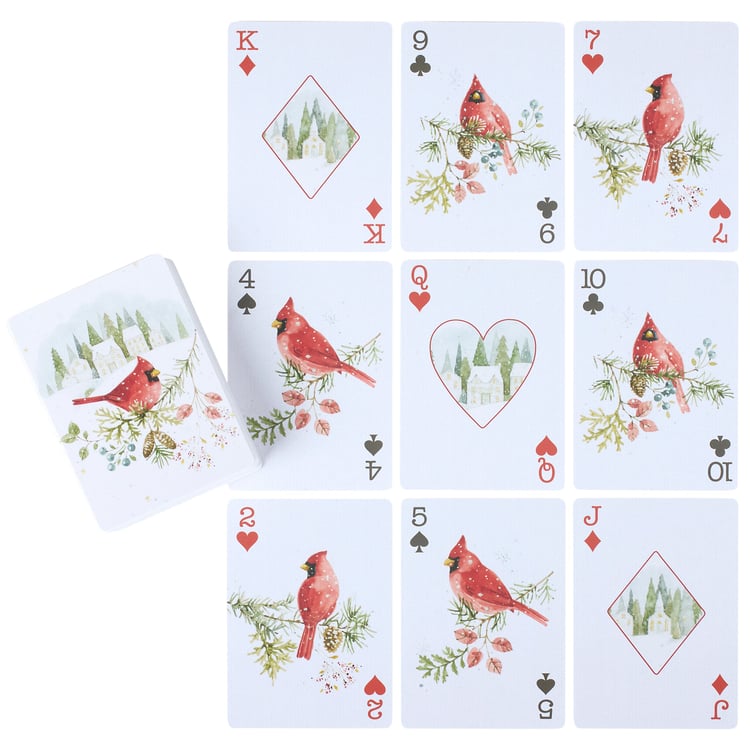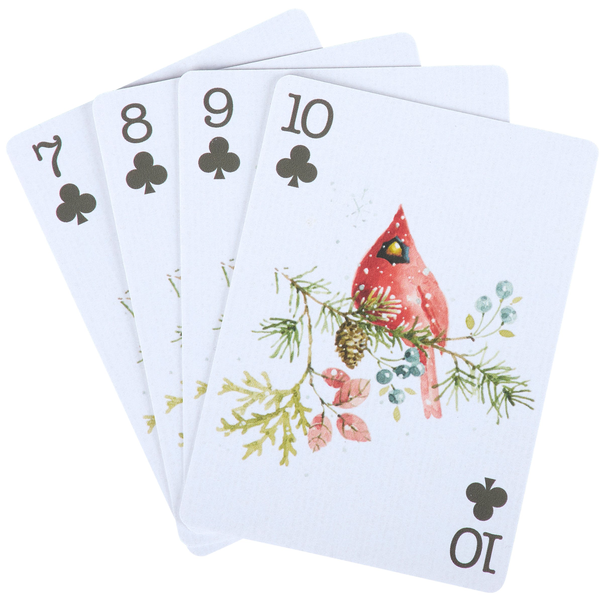 A 54-card playing deck from our Christmas Collection displaying a charming winter scene of a cardinal perched on a branch on the back of each card. The face of each card features coordinating winter cardinal designs. Each Winter cardinal design is replicated from original art hand painted in a delicate watercolor style. Our Winter Cardinals playing cards are packaged in a protective carboard box displaying the full card art for easy storage when not in use or traveling. A cardinal themed Christmas gift perfect for on the go games.