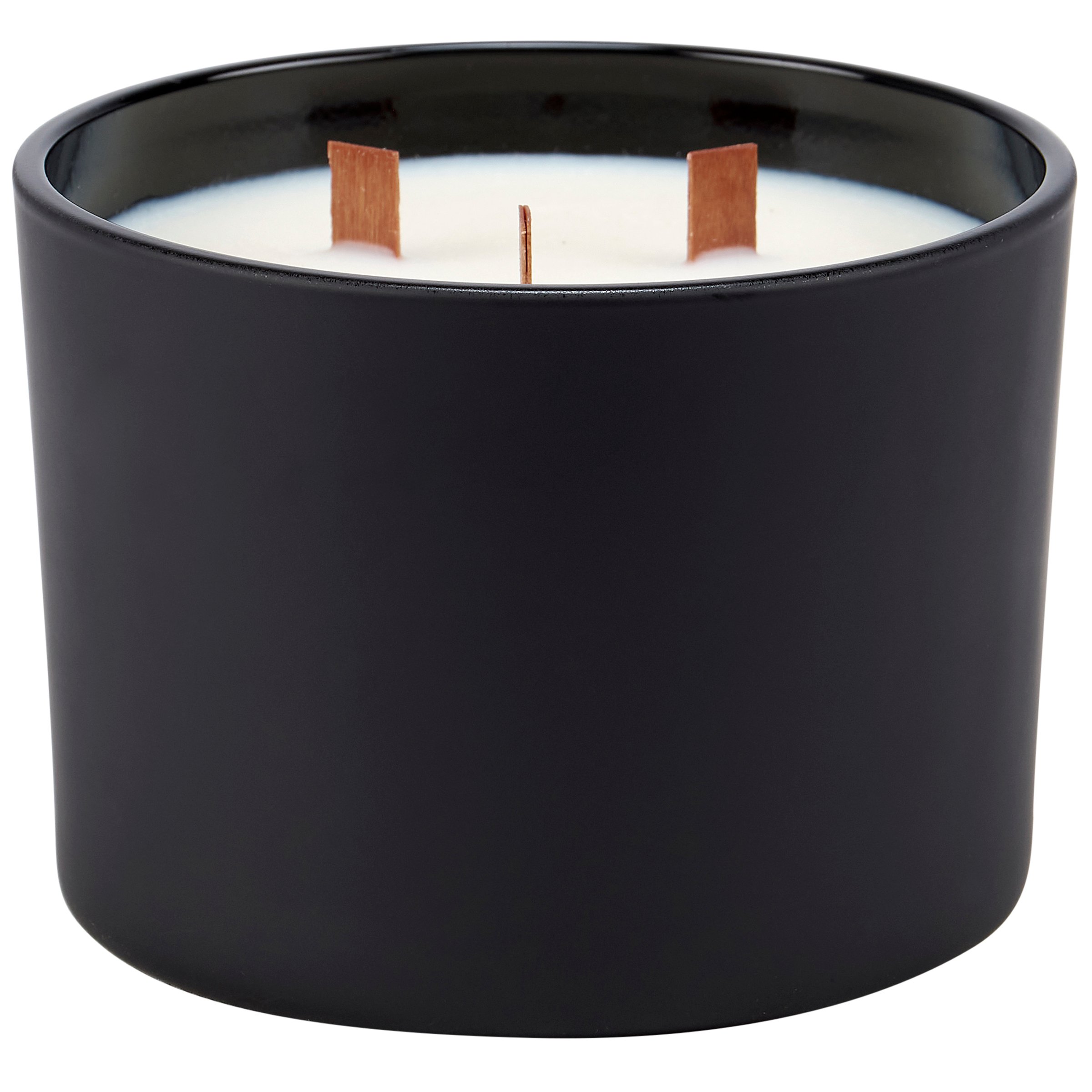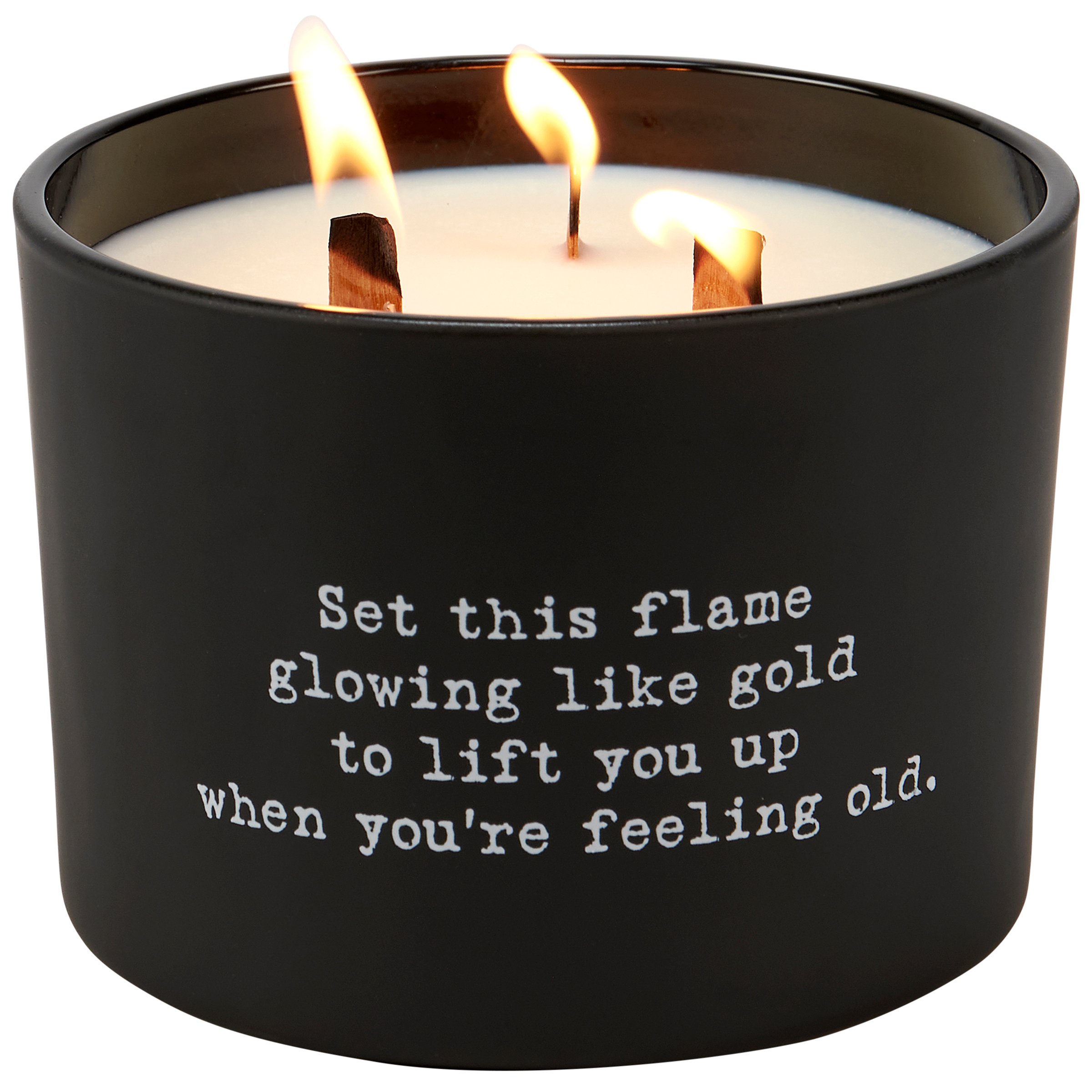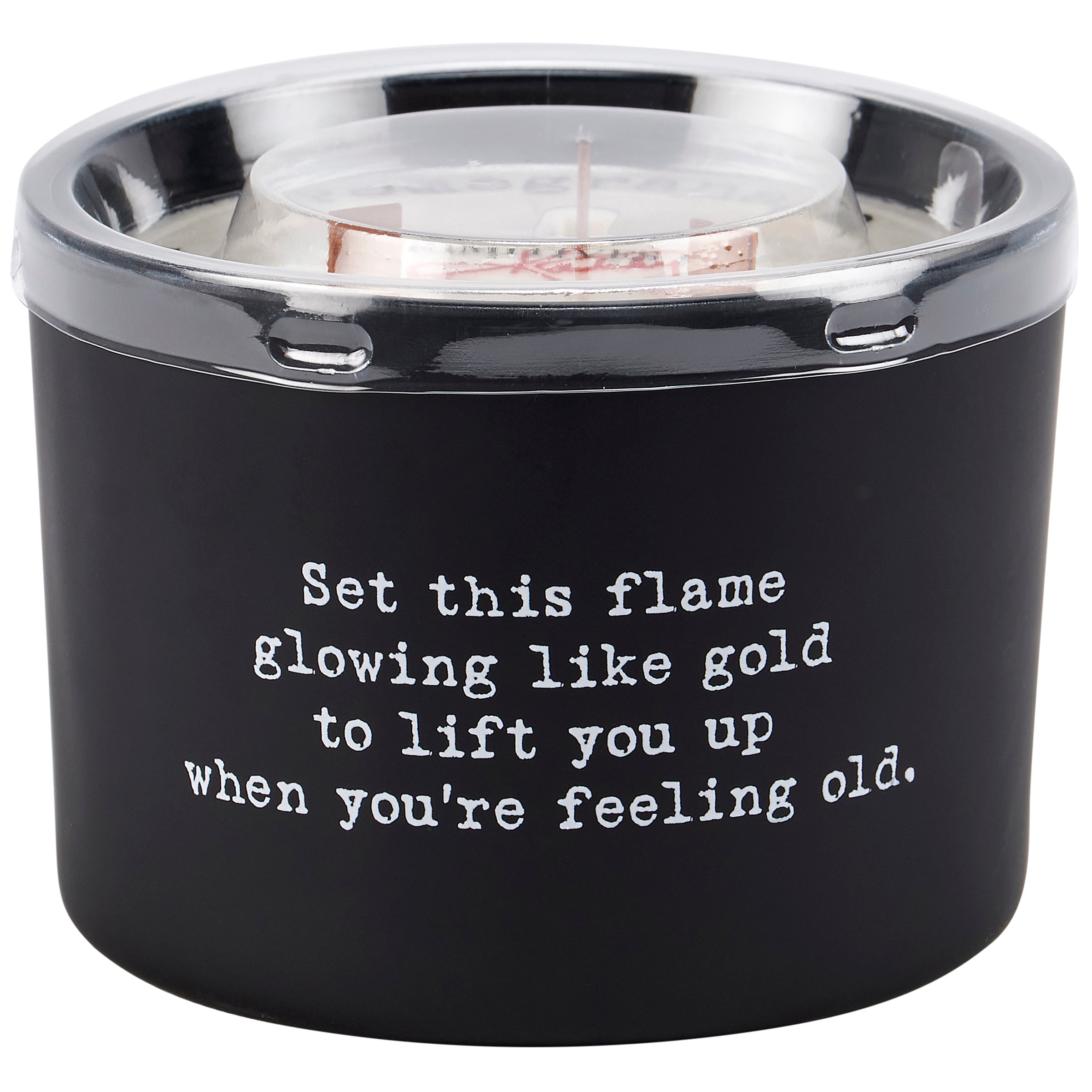 A candle from our Box Sign Style Collection displaying an age-themed poem in a typewriter style on matte black glass that reads "Set this flame glowing like gold to lift you up when you're feeling old." Poetry candle features soy-based wax and 3 wooden wicks with 26 hours of burn time activating a refreshing Pomegranate scent. Our Age poetry candle includes a dust cover and plastic lid for protection and enhanced appearance on store displays. A fun age-themed gift perfect for an everyday home accent.