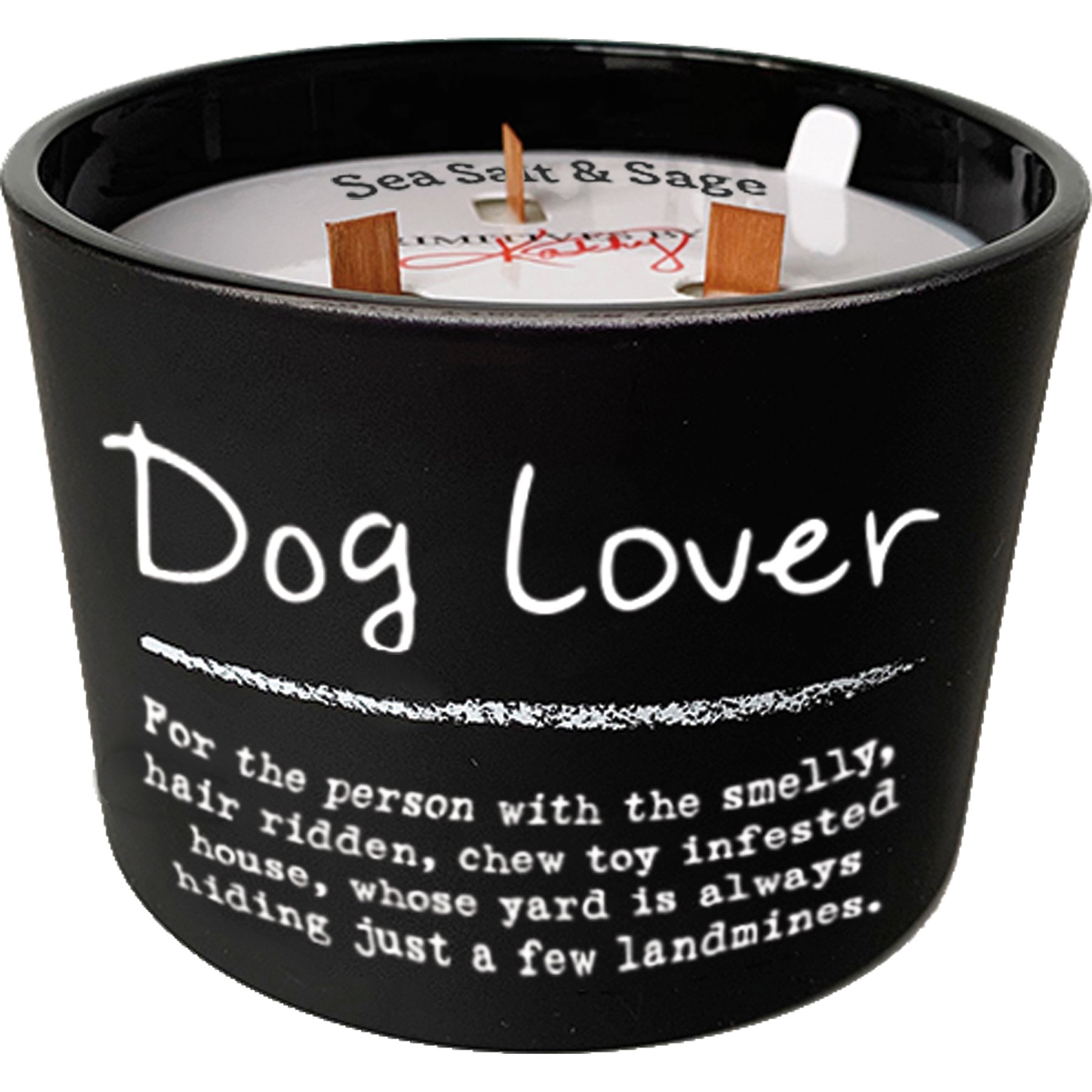 A matte black glass vessel holds this soy-based wax candle which features a refreshing sea salt & sage scent and "Dog Lover For The Person With The Smelly, Hair Ridden, Chew Toy Infested House, Whose Yard Is Always Hiding Just A Few Land Mines." sentiment. The smart sentiment on the front makes this item a perfect and easy gift that feels tailor-made for the dog lovers in your life. Our Dog Lover candle contains three wooden wicks for a total of 26 hours of burn time. Includes a plastic wax cover for protection and a polished look. Part of our best-selling Pet Collection.