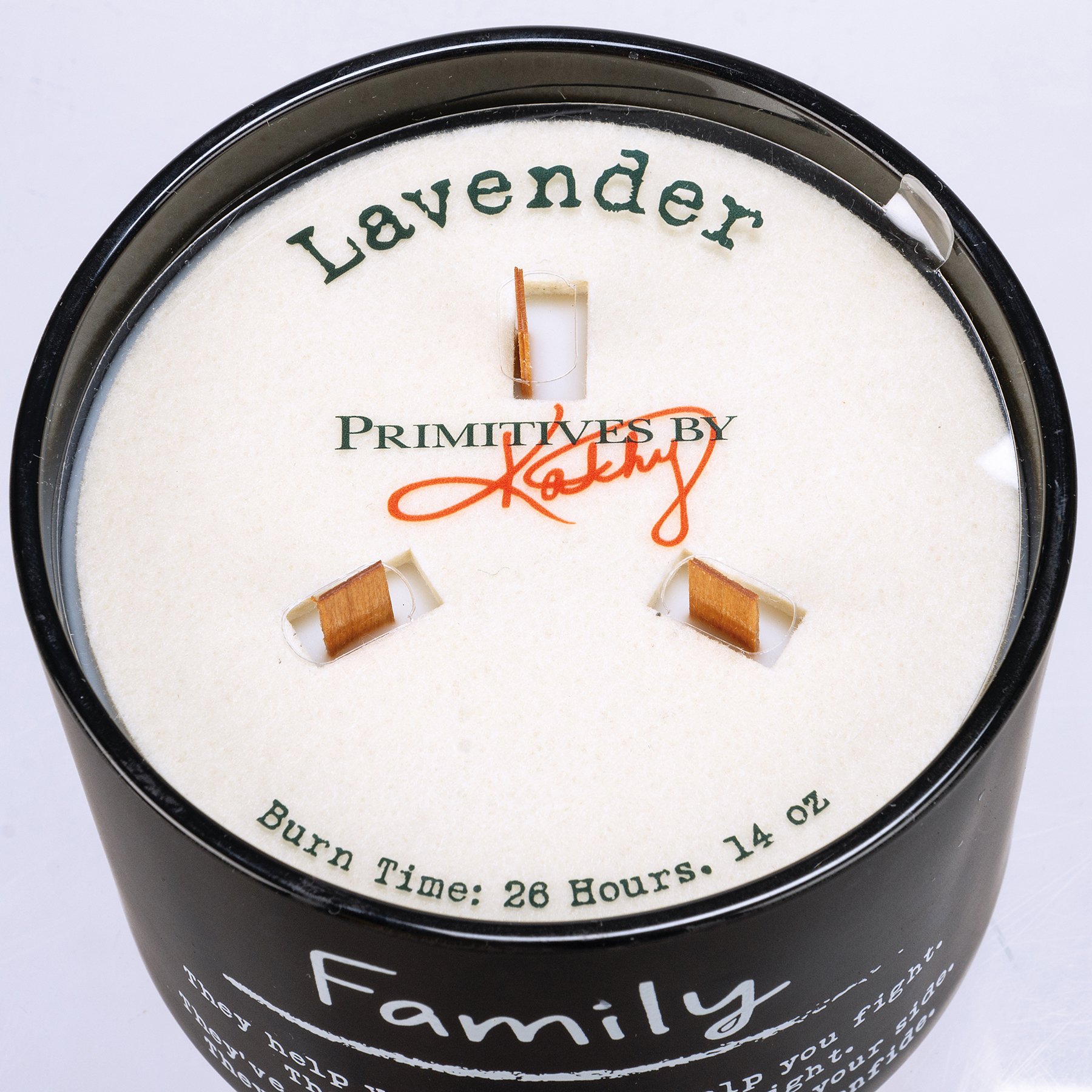 A matte black glass vessel holds this soy-based wax candle featuring a refreshing lavender scent with "Family They Help You Fly, They Help You Fight. They Help You See The Light. They've Got Your Back, They're On Your Side. They're Always There For You To Confide." sentiment. This 14 oz. candle makes a perfect gift. Our Family jar candle contains three wooden wicks for a total of 26 hours of burn time. Includes a plastic wax cover for protection and a polished look.