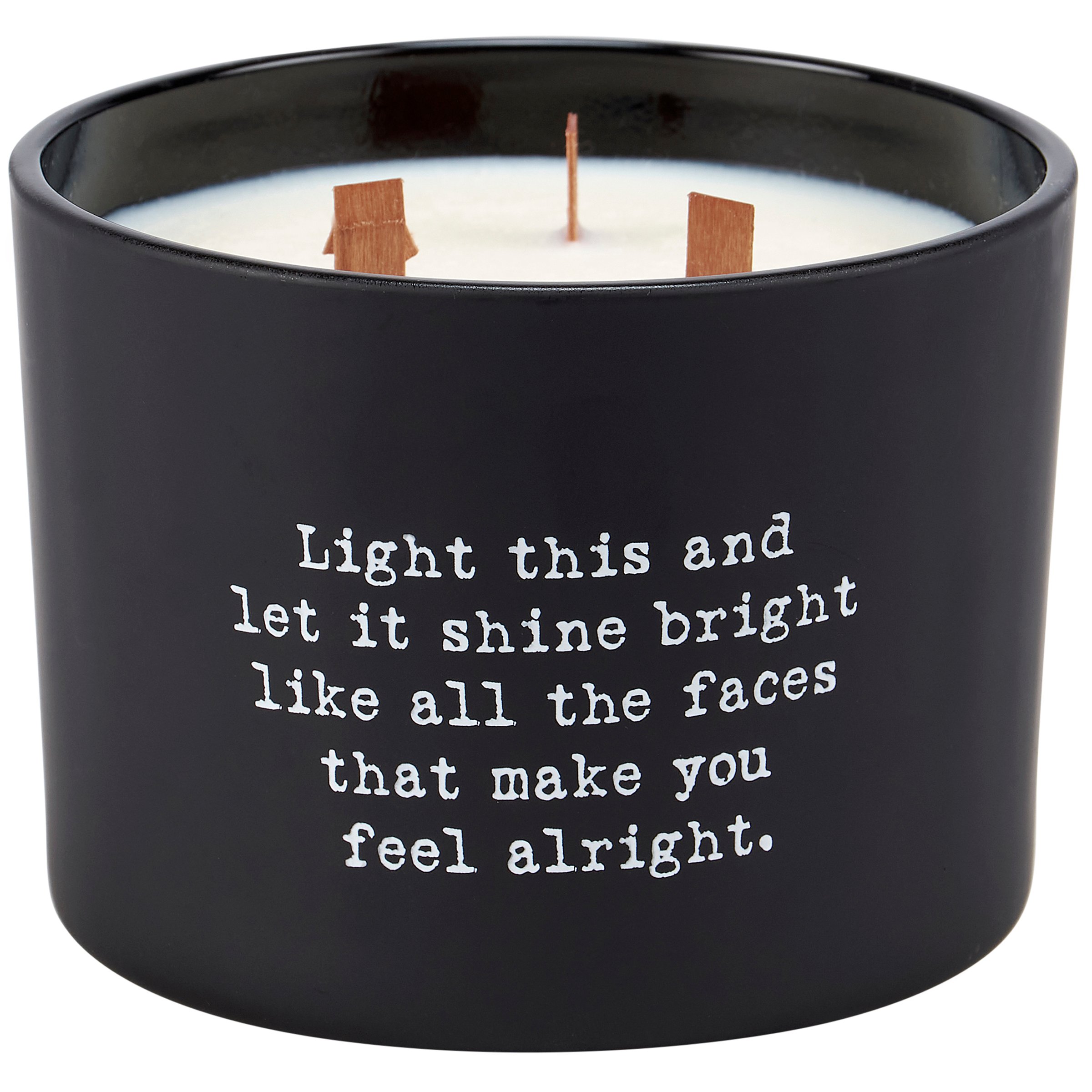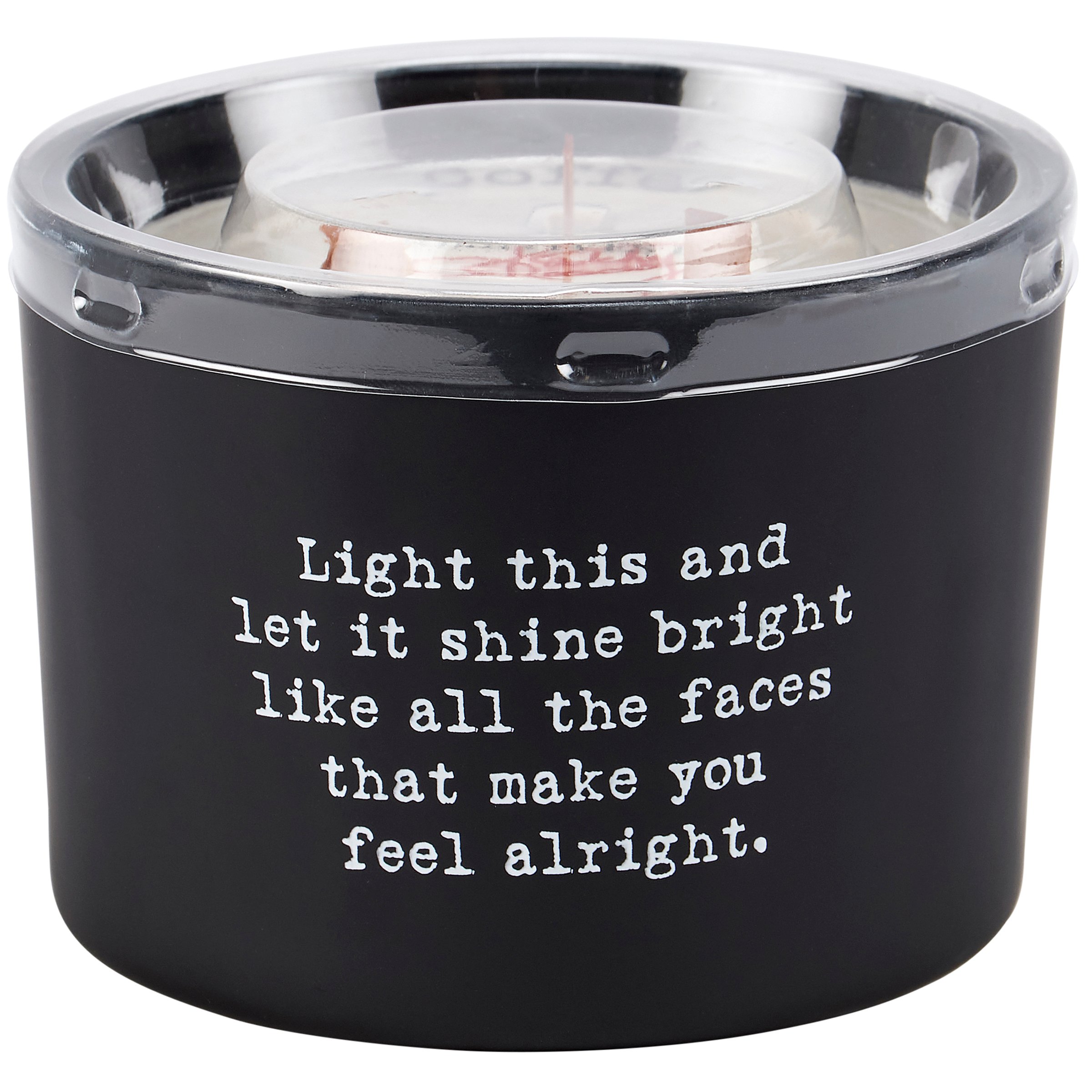 A candle from our Box Sign Style Collection displaying an inspirational friend inspired poem in a typewriter style on matte black glass that reads "Light this and let it shine bright like all the faces that make you feel alright." Poetry candle features soy-based wax and 3 wooden wicks with 26 hours of burn time activating a refreshing Coffee scent. Our Friends poetry candle includes a dust cover and plastic lid for protection and enhanced appearance on store displays. An inspirational gift perfect for an everyday home accent.