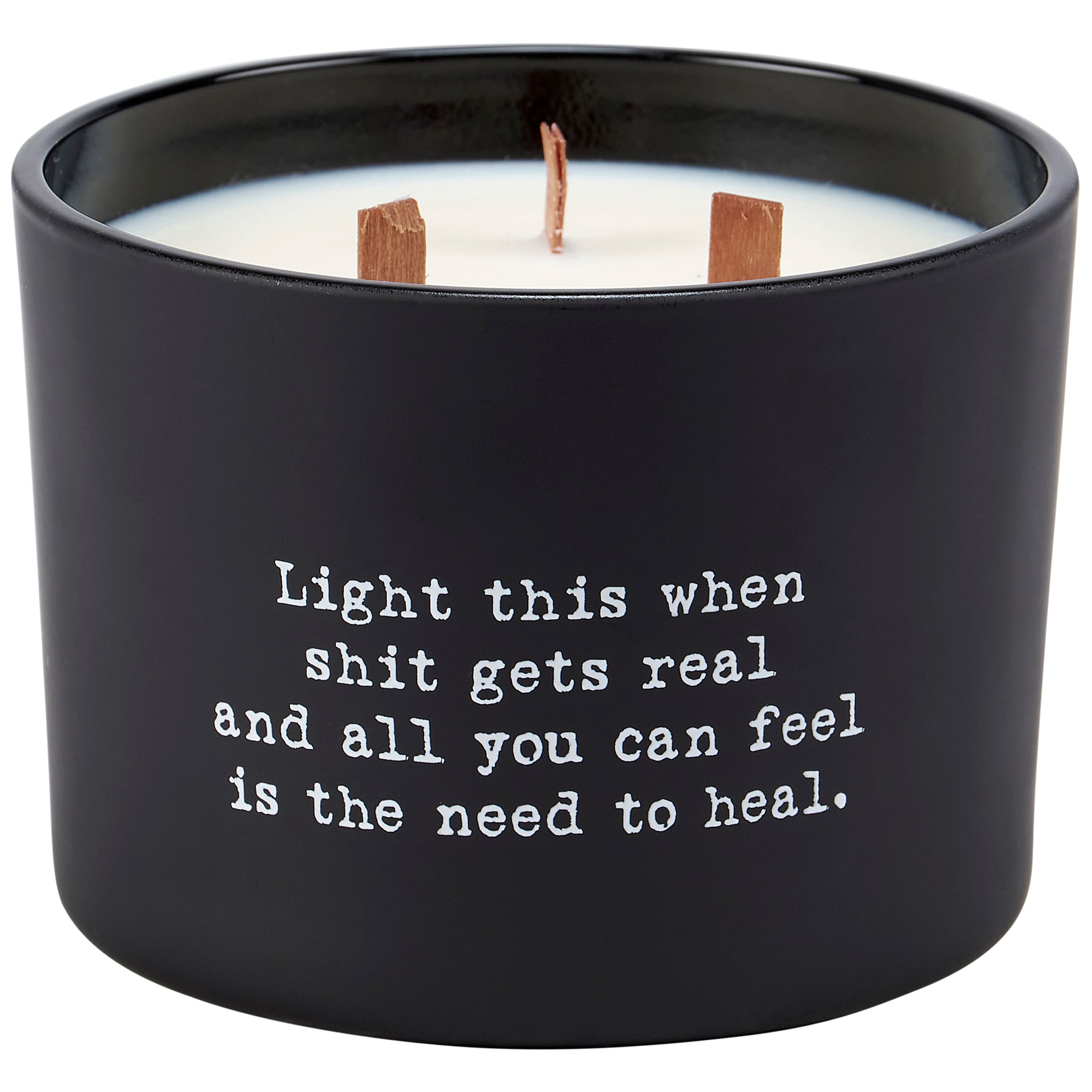 A candle from our Box Sign Style Collection displaying a fun inspirational poem in a typewriter style on matte black glass that reads "Light this when shit gets real and all you can feel is the need to heal." Poetry candle features soy-based wax and 3 wooden wicks with 26 hours of burn time activating a refreshing Coconut scent. Our Heal poetry candle includes a dust cover and plastic lid for protection and enhanced appearance on store displays. An inspirational gift perfect for an everyday home accent.