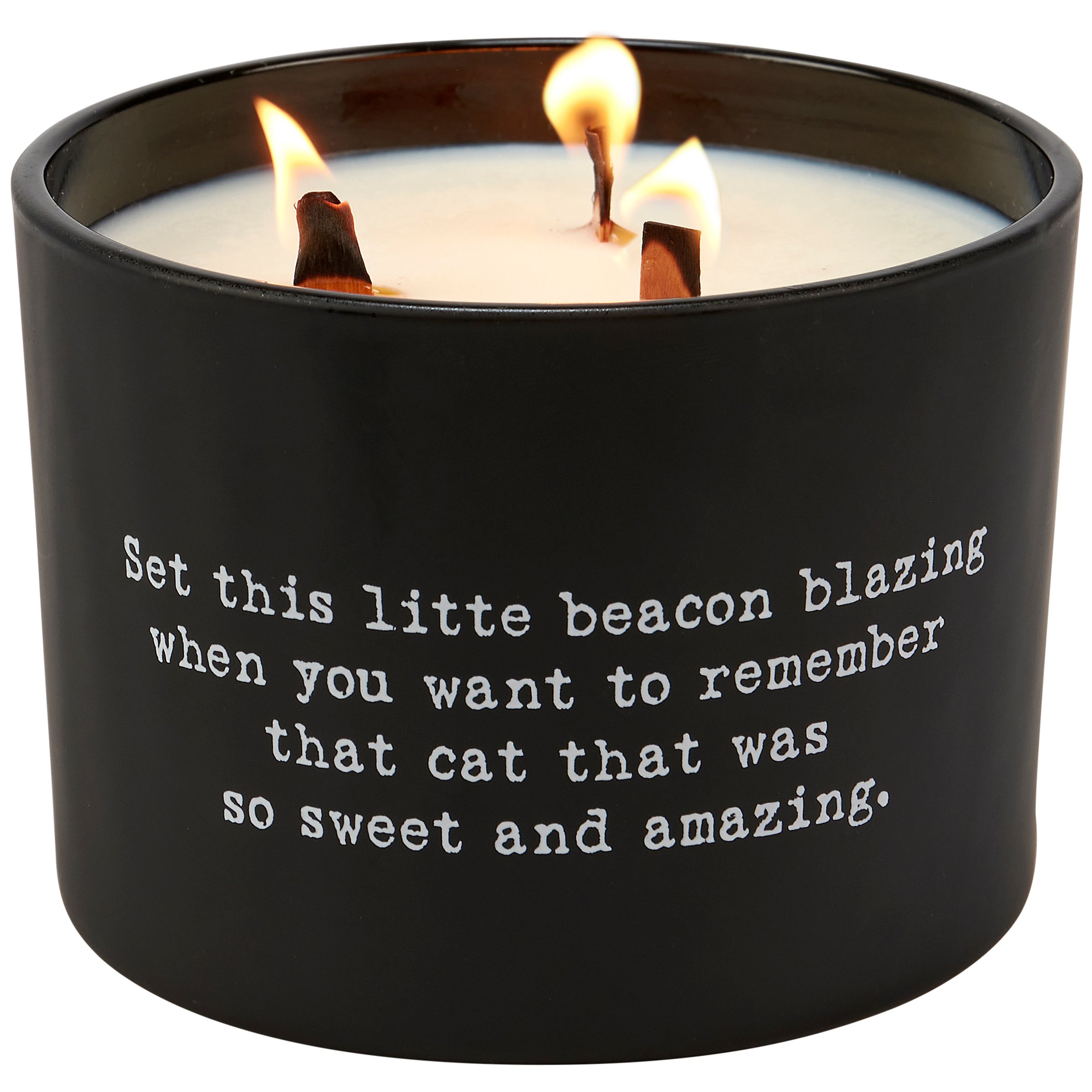 A candle from our Box Sign Style Collection displaying a bereavement inspired pet poem in a typewriter style on matte black glass that reads "Set this little beacon blazing when you want to remember that cat that was so sweet and amazing." Poetry candle features soy-based wax and 3 wooden wicks with 26 hours of burn time activating a calming French Vanilla scent. Our Sweet Cat poetry candle includes a dust cover and plastic lid for protection and enhanced appearance on store displays. A heartwarming pet-themed gift perfect for an everyday home accent.