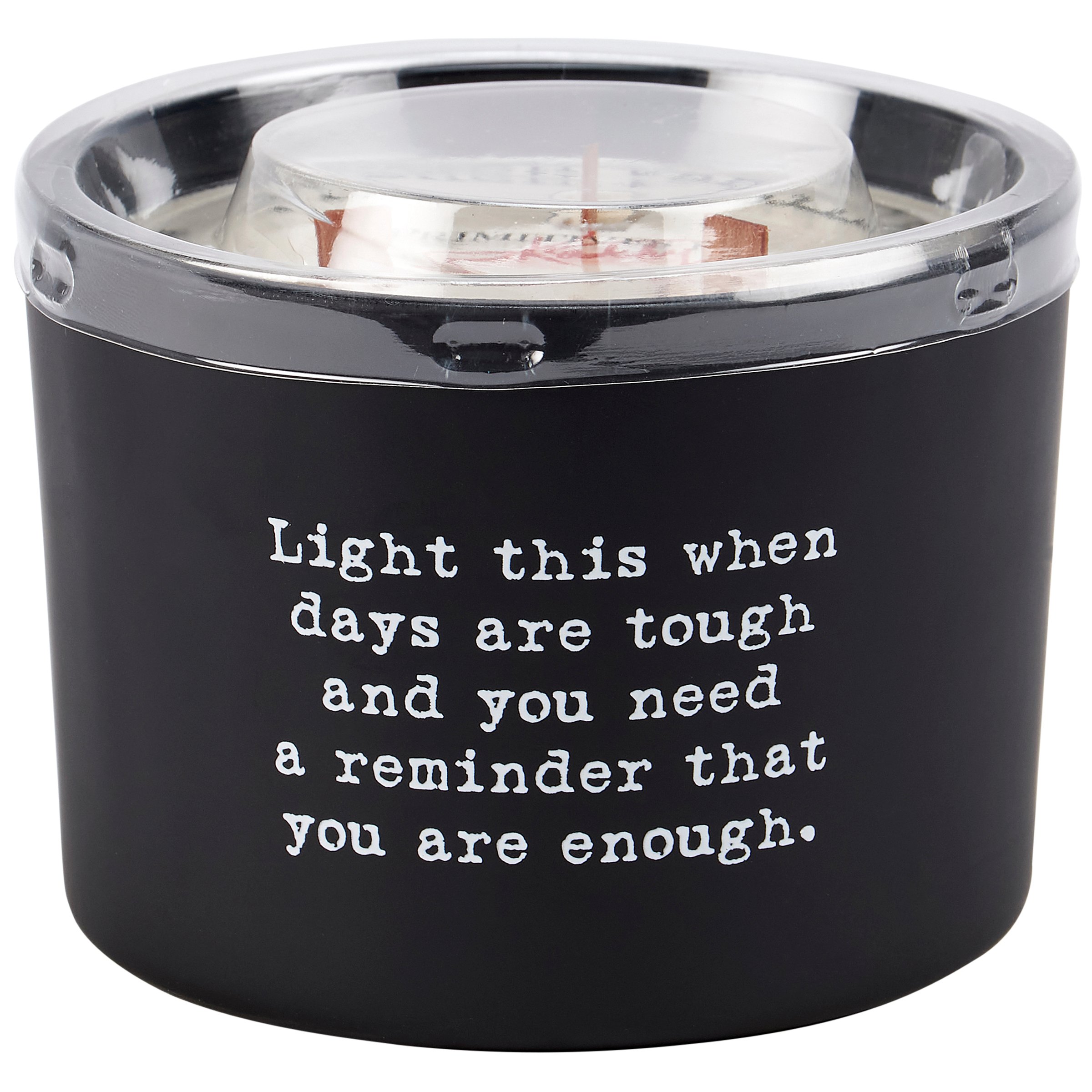 A candle from our Box Sign Style Collection displaying an inspirational poem in a typewriter style on matte black glass that reads "Light this when days are tough and you need a reminder that you are enough." Poetry candle features soy-based wax and 3 wooden wicks with 26 hours of burn time activating a calming Vanilla scent. Our You Are Enough poetry candle includes a dust cover and plastic lid for protection and enhanced appearance on store displays. An inspirational gift perfect for an everyday home accent.