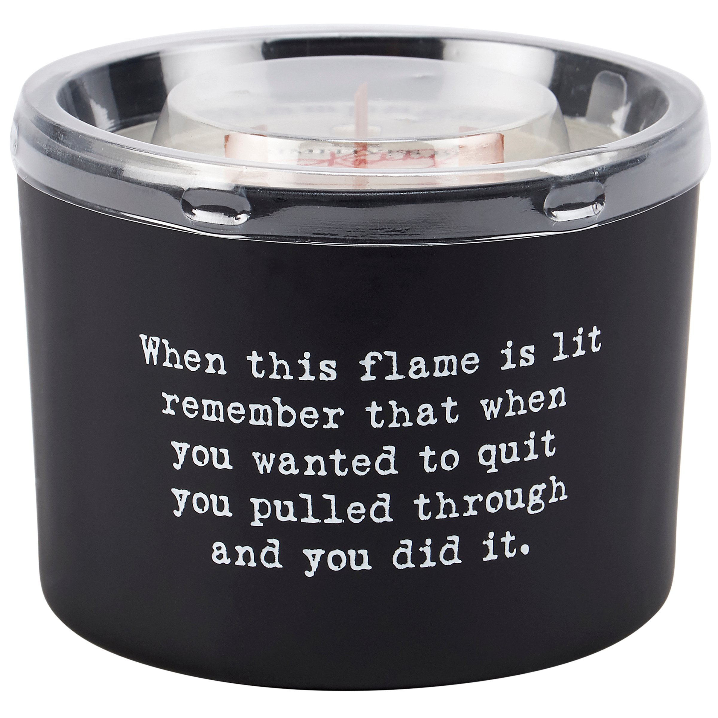 A candle from our Box Sign Style Collection displaying a fun inspirational poem in a typewriter style on matte black glass that reads "When this flame is lit remember that when you wanted to quit you pulled through and you did it." Poetry candle features soy-based wax and 3 wooden wicks with 26 hours of burn time activating a refreshing Champagne scent. Our You Did It poetry candle includes a dust cover and plastic lid for protection and enhanced appearance on store displays. An inspirational gift perfect for an everyday home accent.