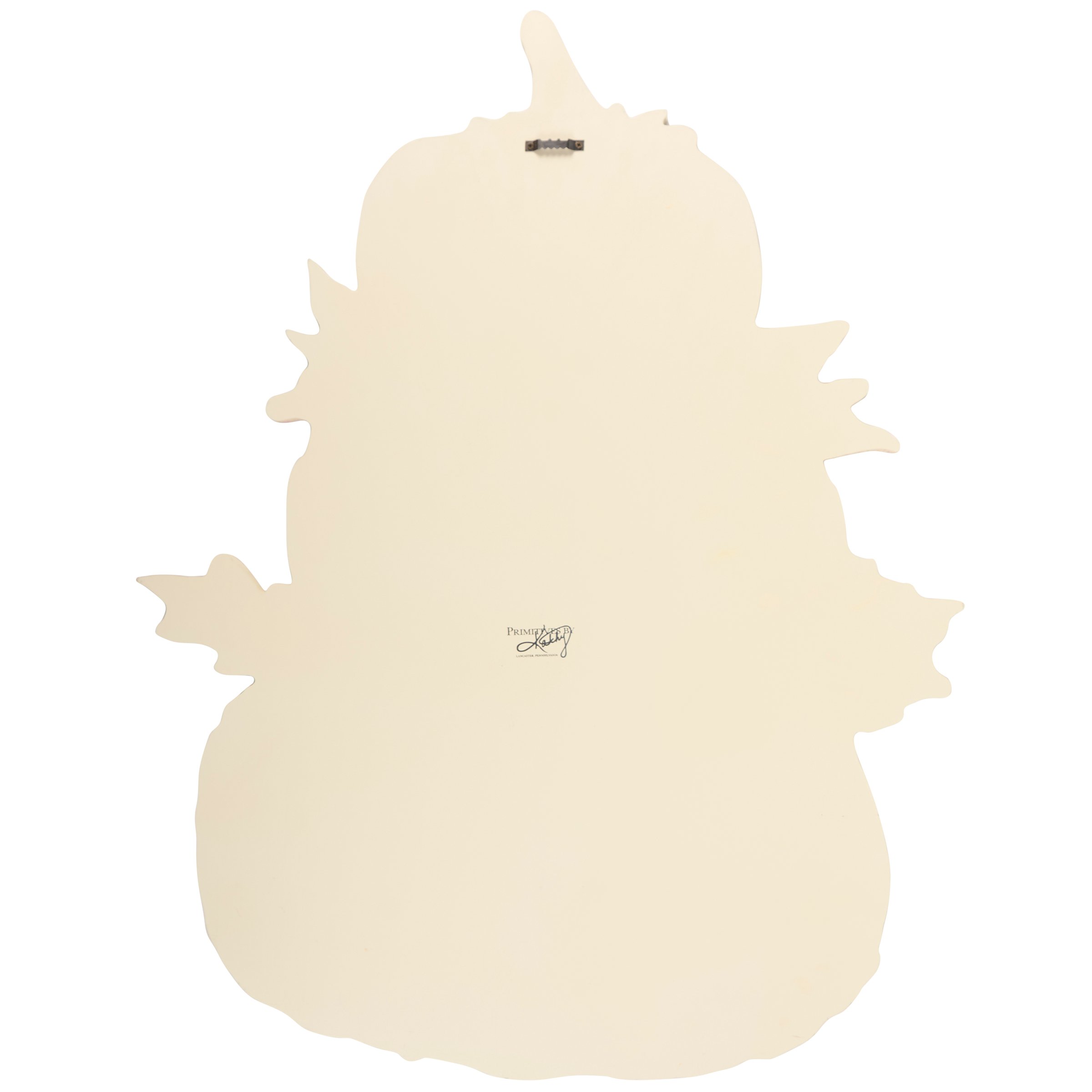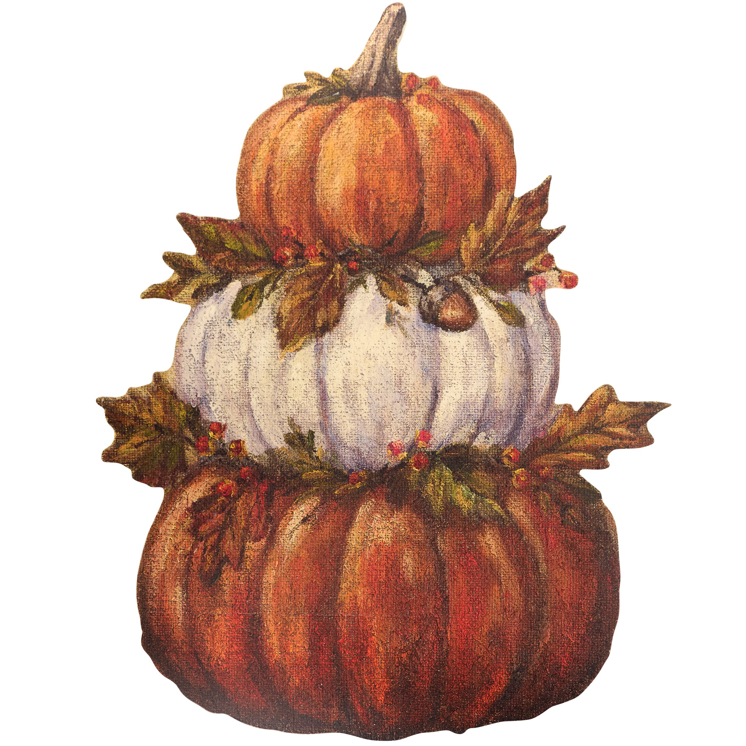 A wooden porch leaner from our Fall & Harvest Collection cut in the shape of the displayed design of a pumpkins stacked on each other with fall foliage in between each pumpkin. Stacked pumpkin design is replicated from original artwork painted onto burlap canvas, giving the art a unique depth and texture. Fall porch leaner features distressed details with coordinating cream color on the sides and back. Our Pumpkin Stack porch leaner easily leans on sturdy structure for display and stands over 30 inches tall for a rustic holiday statement piece indoor or outdoor. Seasonal porch leaner also includes a sawtooth hanger on the back for hanging display. A rustic fall décor piece with a variety of seasonal display options.