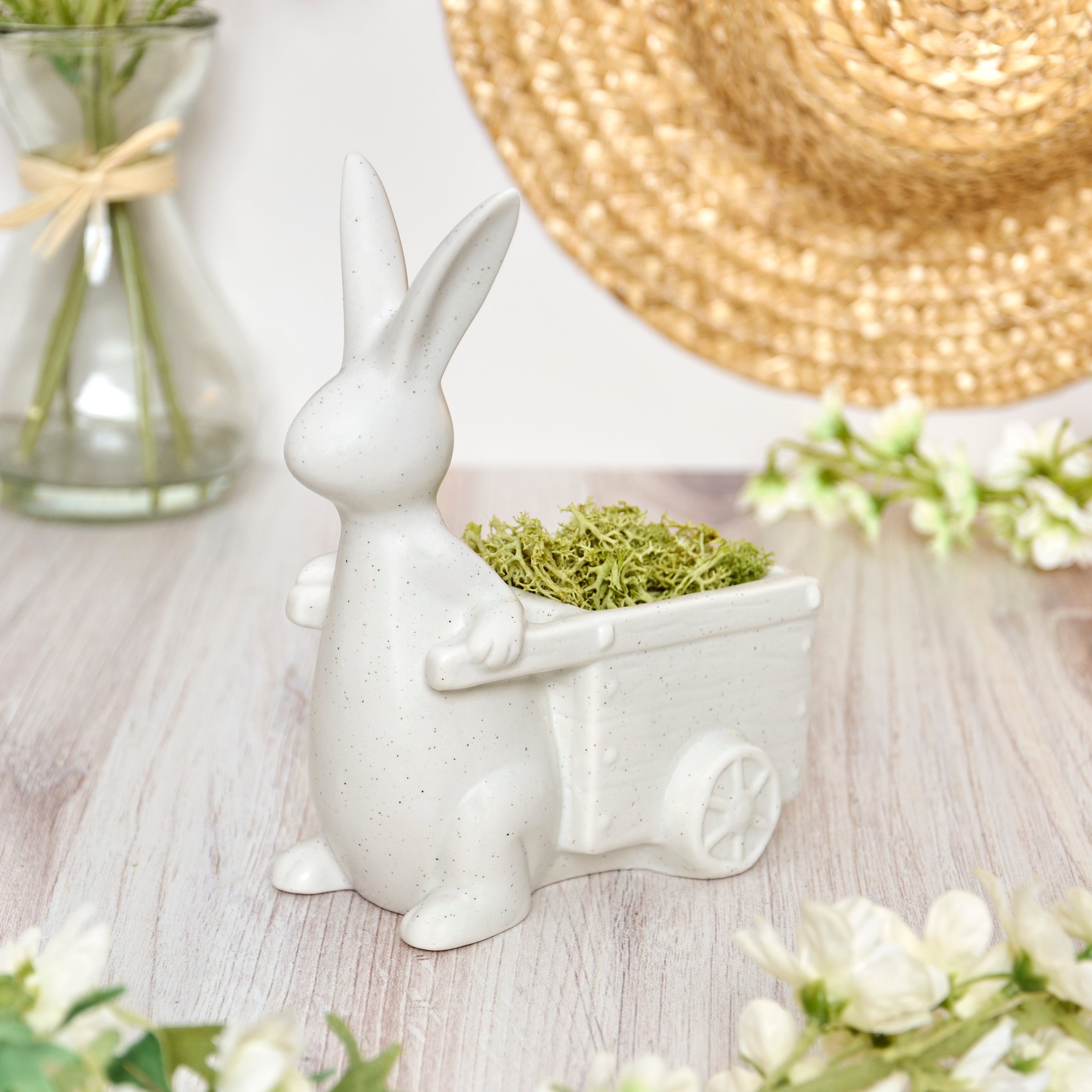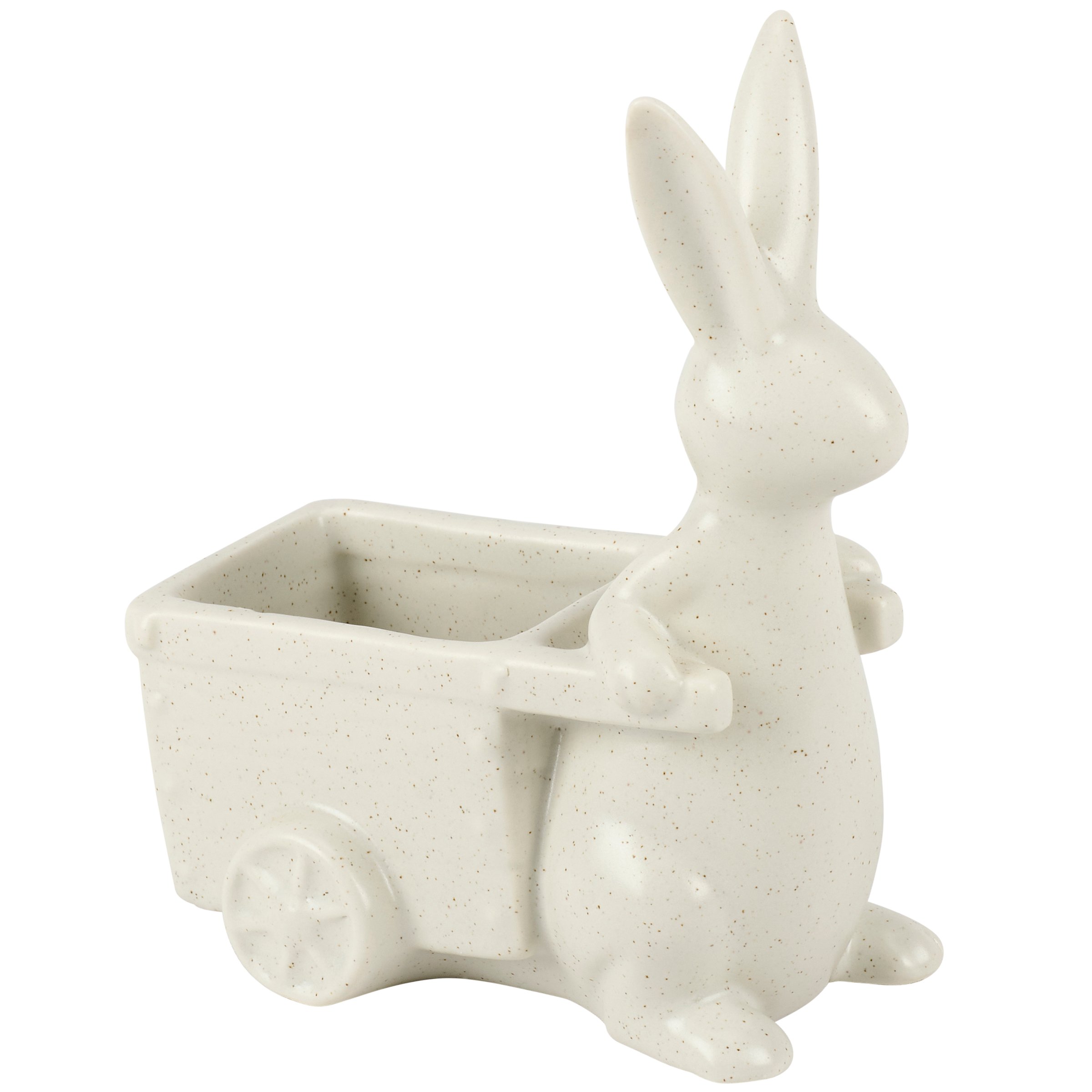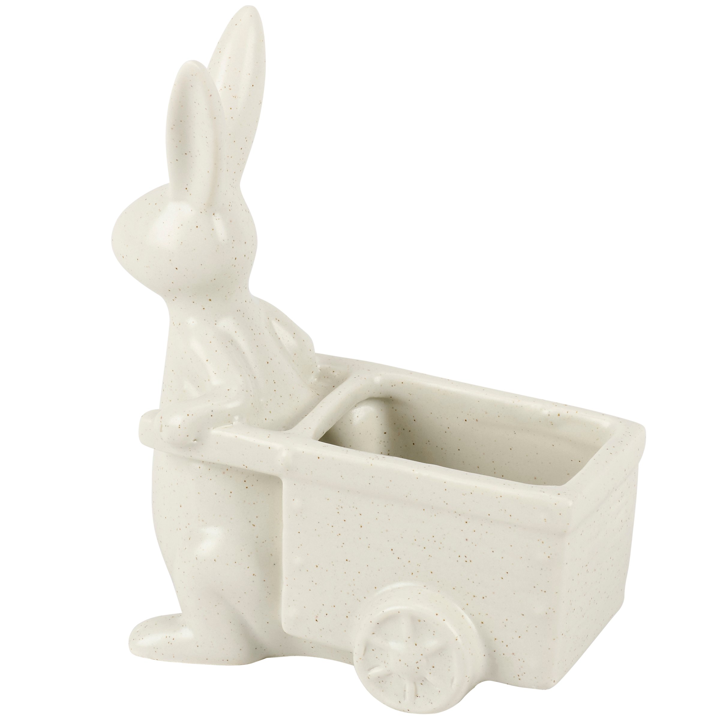 A ceramic pot from our Easter & Spring Collection displaying a sculpted bunny pulling a flower cart with cream glaze finish and speckled details. Our Bunny Cart pot includes an opening and space in the cart to place florals, succulents, or seasonal décor. Greenery pictured not included. A rustic Easter home accent with a variety of seasonal display options.