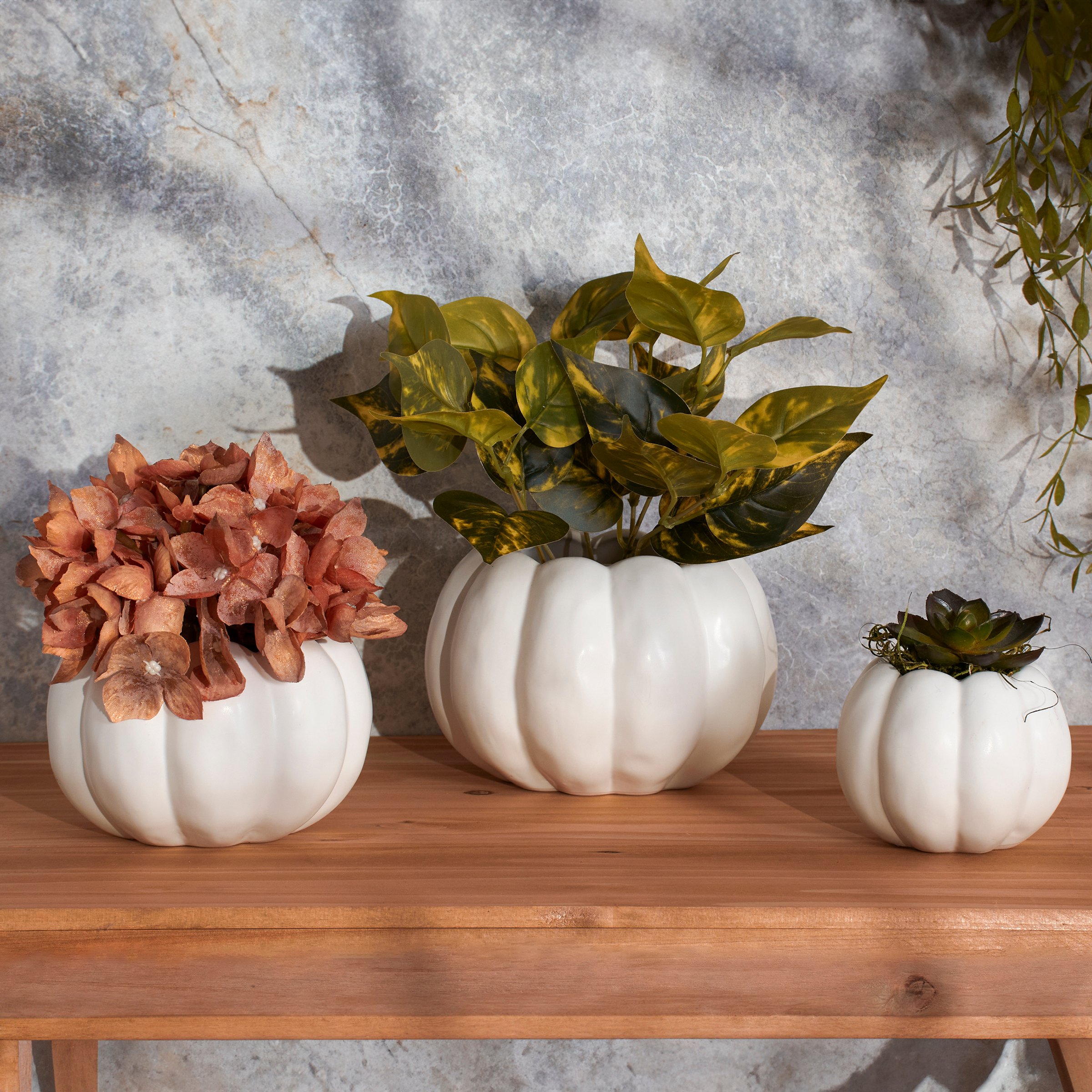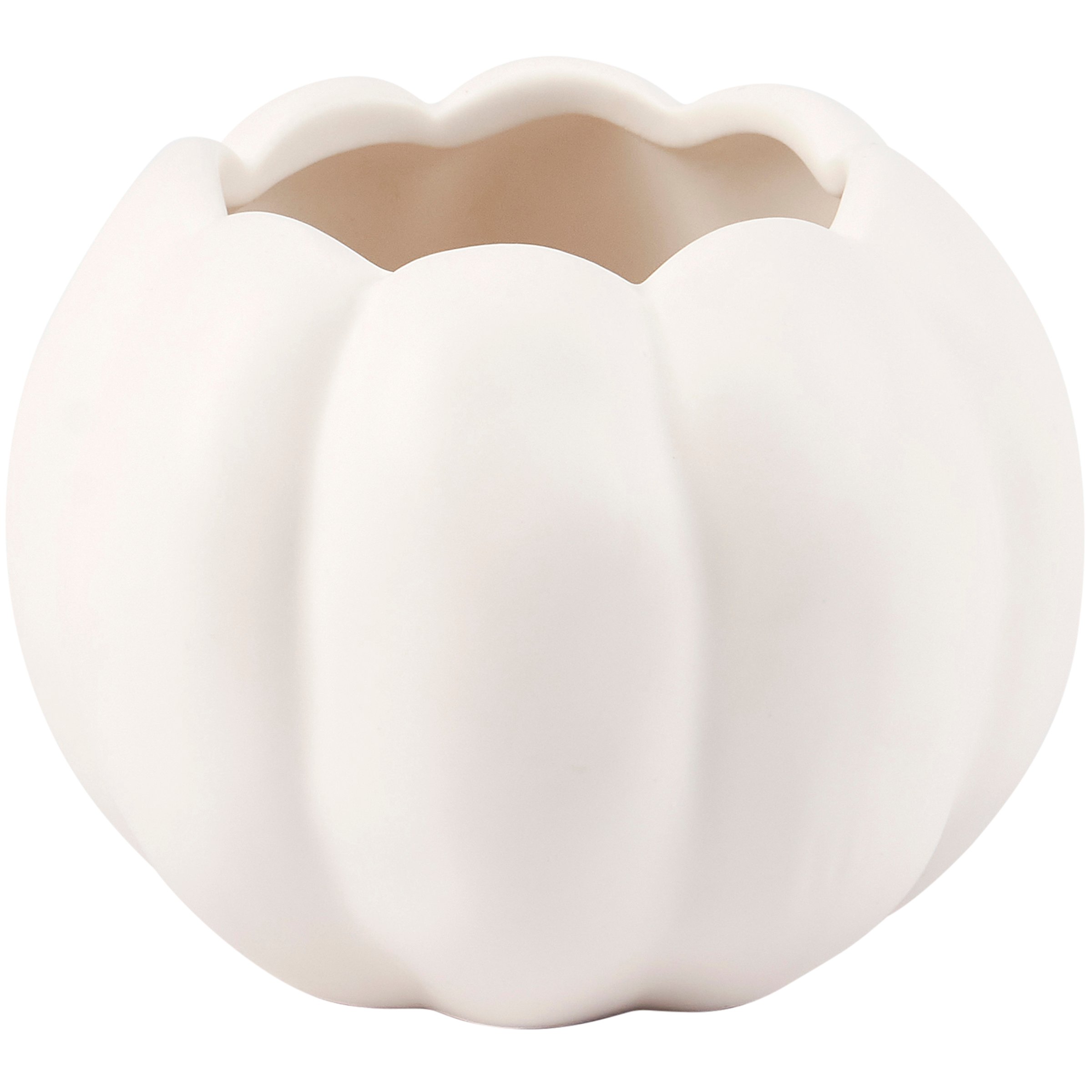 A small ceramic pot from our Fall & Harvest Collection displaying a sculpted pumpkin shape and matte cream color finish. Our small Pumpkin pot includes an opening on top to place seasonal florals, succulents, or décor. Greenery pictured not included. Seasonal pumpkin pot features a neutral color making it easy to coordinate with a variety of plants and décor. A pumpkin-themed home accent perfect for seasonal display.