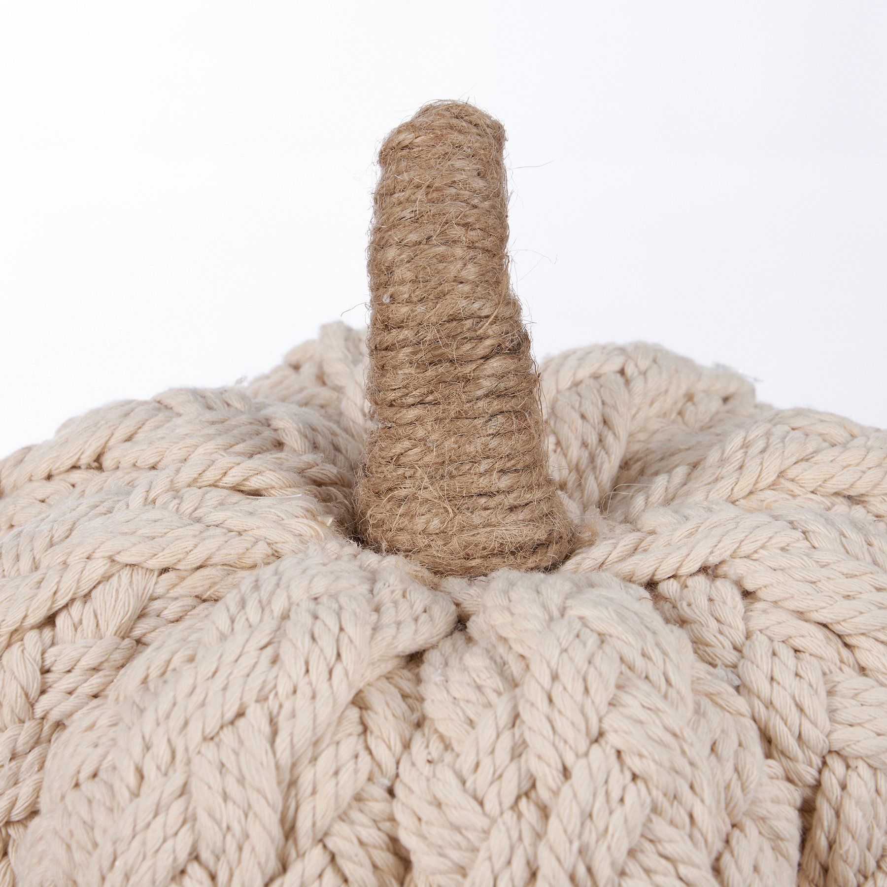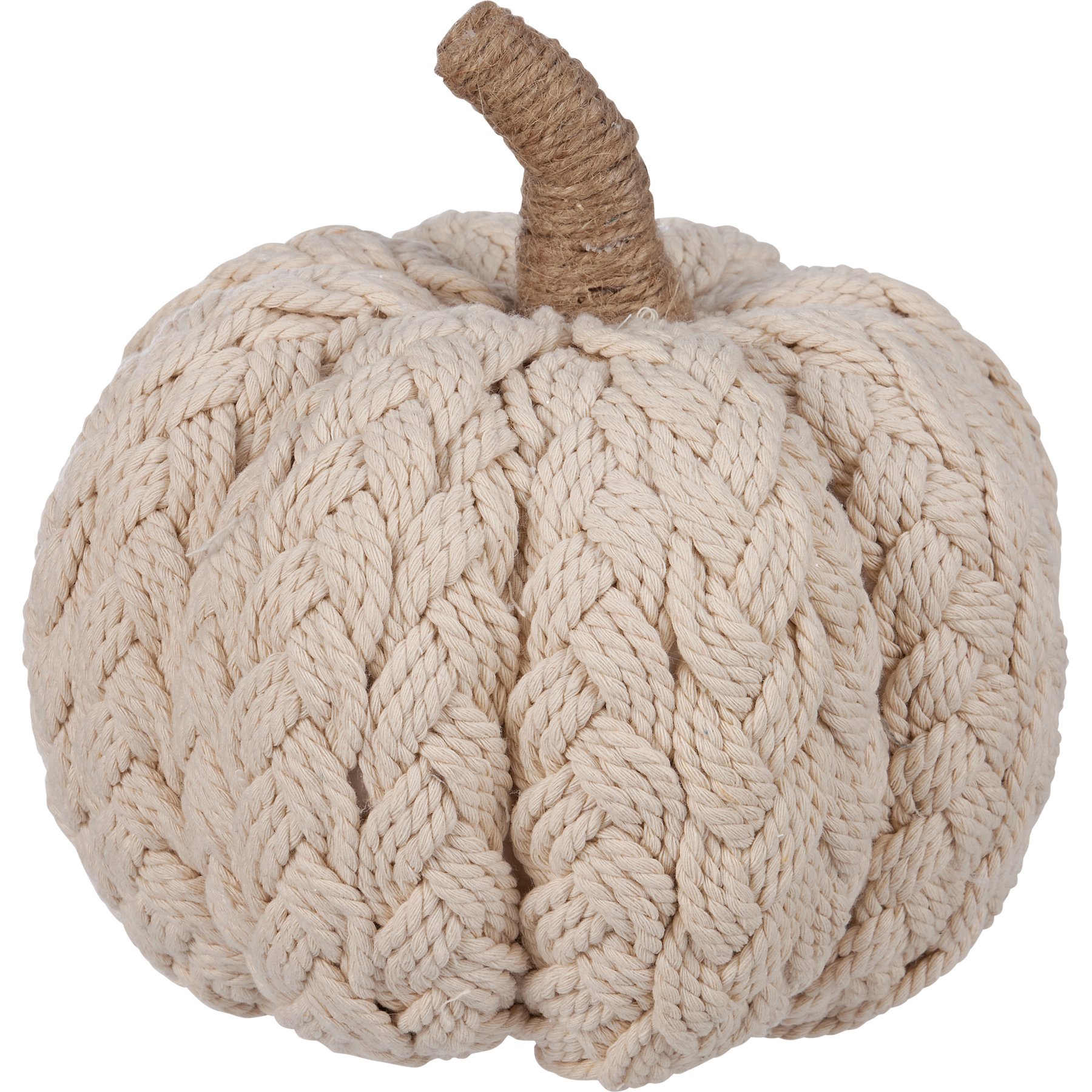 A decorative pumpkin from our Fall & Harvest Collection featuring a cream color and braided design for a cozy aesthetic with a jute wrapped stem. Our Cream Braided pumpkin is designed to free-stand on any flat surface. Place in a display to add a touch of autumn or display with other decorative pumpkins as a collection. A cozy seasonal home accent with a variety of display options.