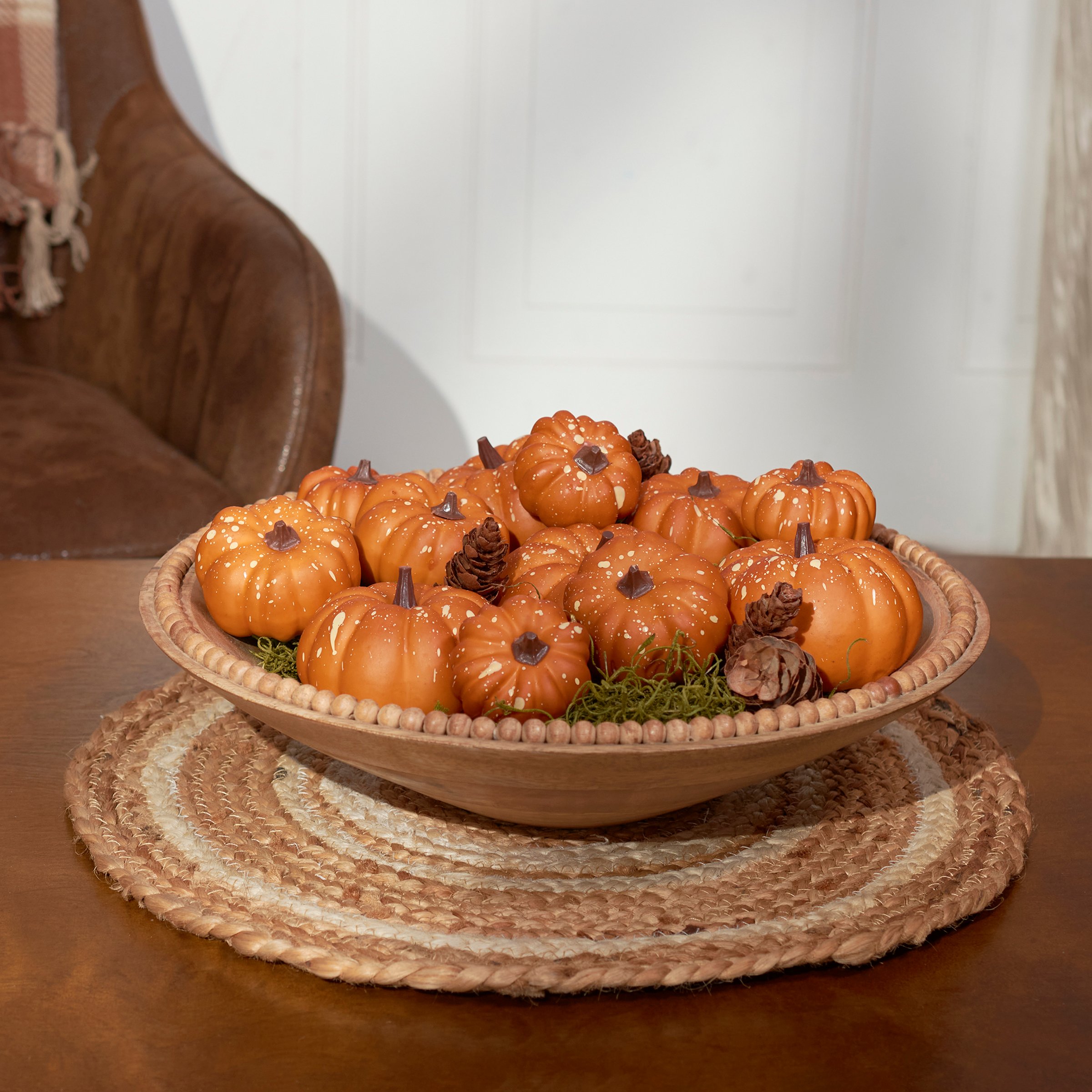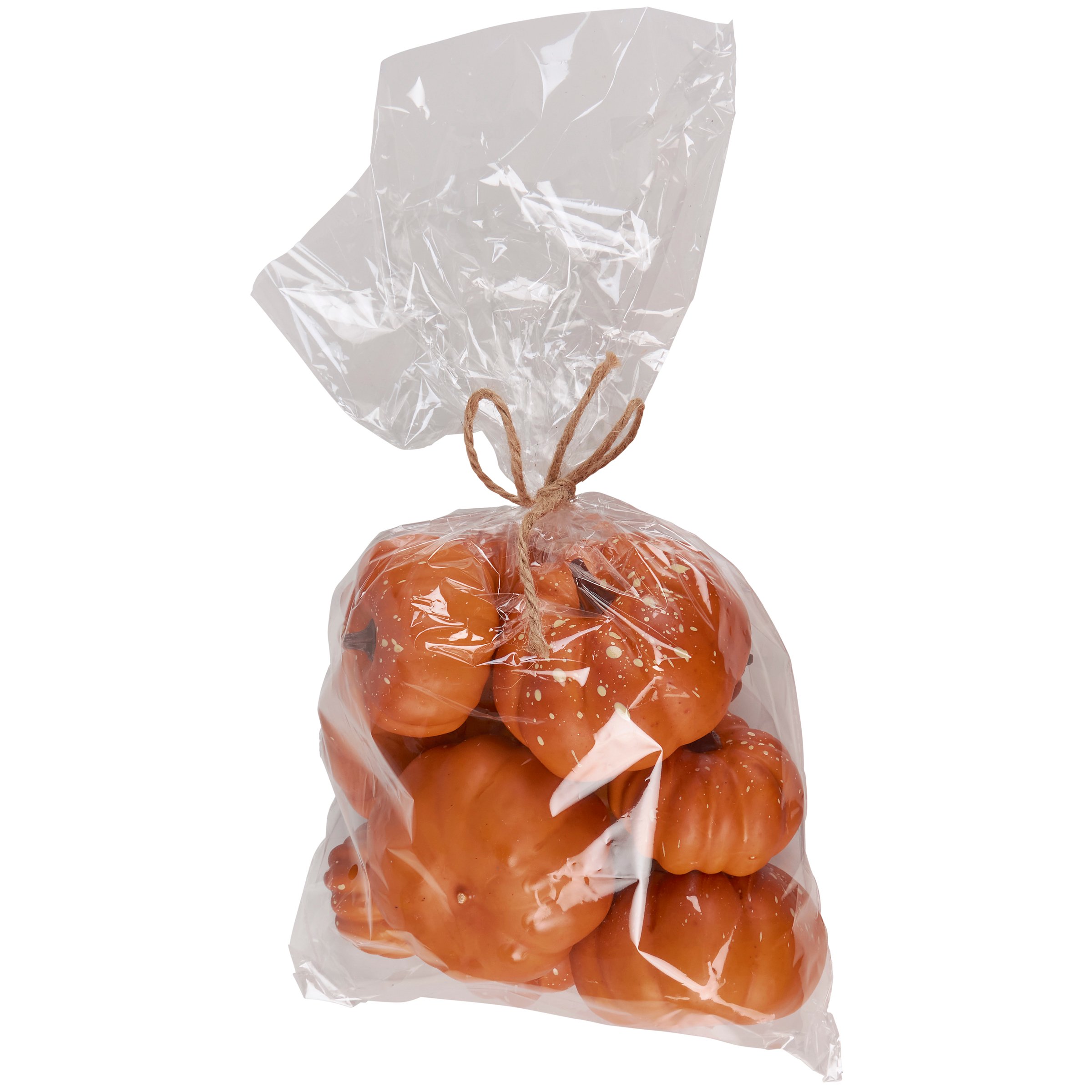 A set of decorative pumpkins from our Fall & Harvest Collection featuring a natural pumpkin orange color with a cream speckle detail. Seasonal pumpkin set includes 12 pumpkins in various sizes. Place in a display to add a touch of autumn or with other decorative pumpkins as a collection. Our Orange pumpkins come packaged together in a polybag and tied with jute. A set of rustic fall home accents with a variety of seasonal display options.