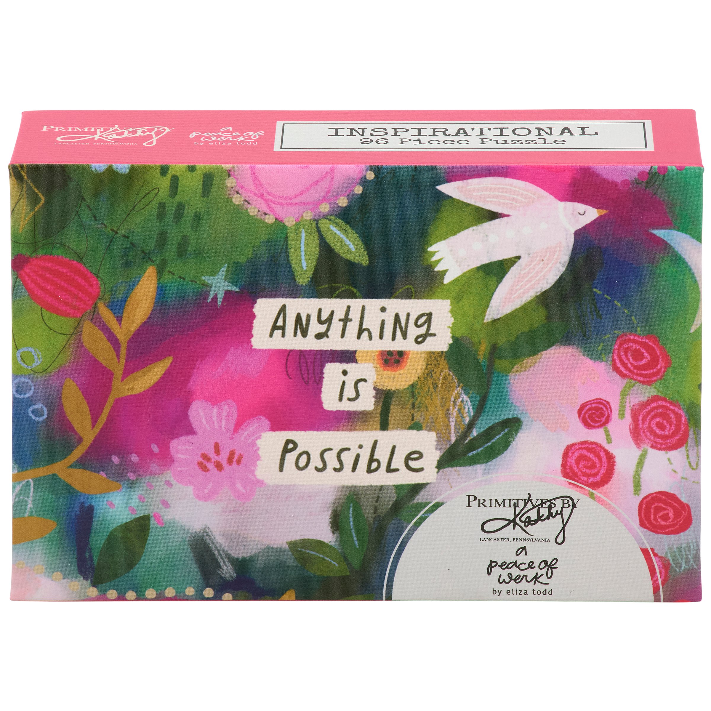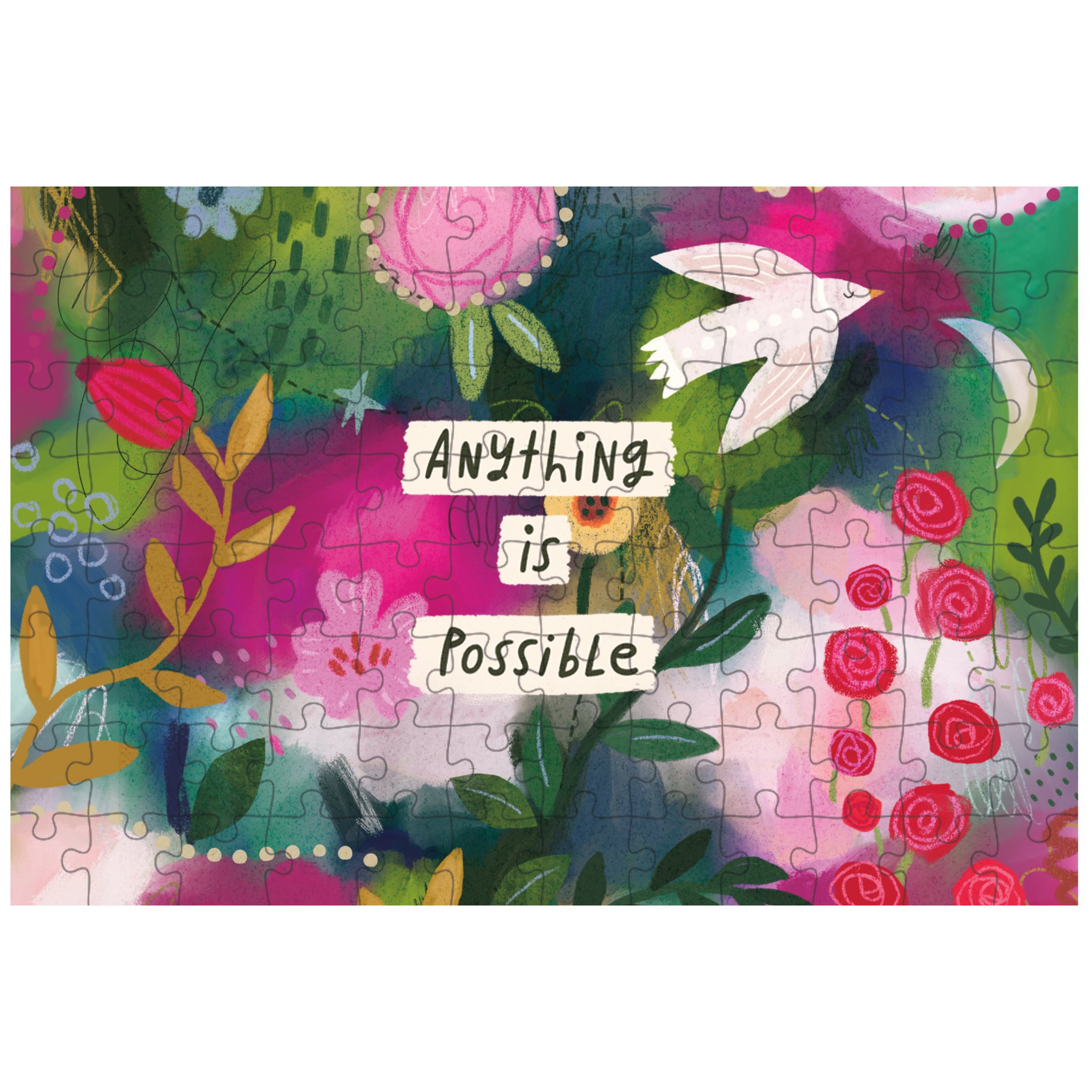 A 96 piece puzzle from our Inspiration & Blooms Collection displaying vibrant abstract art of florals and a bird with an inspirational sentiment that reads "Anything Is Possible." Inspirational design is replicated from original hand illustrated art. Puzzle pieces are packaged in a resealable bag and enclosed in a sturdy box that is small enough to easily store in an everyday bag or luggage and puzzle whenever the moment arrives. Our Anything Is Possible puzzle includes a print displaying the full puzzle image for reference. Contains small parts; this is not a toy. An inspirational gift perfect for daily motivation and on the go fun.