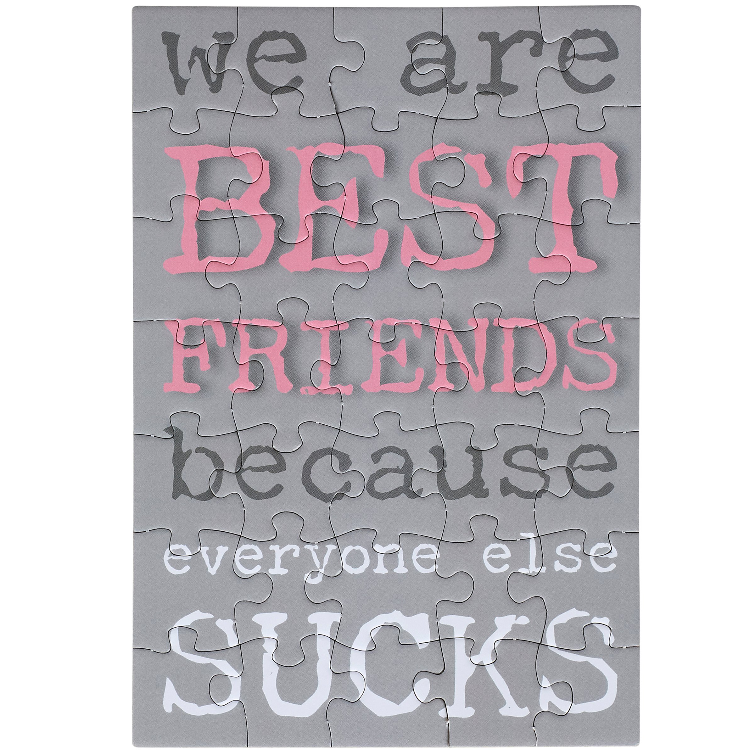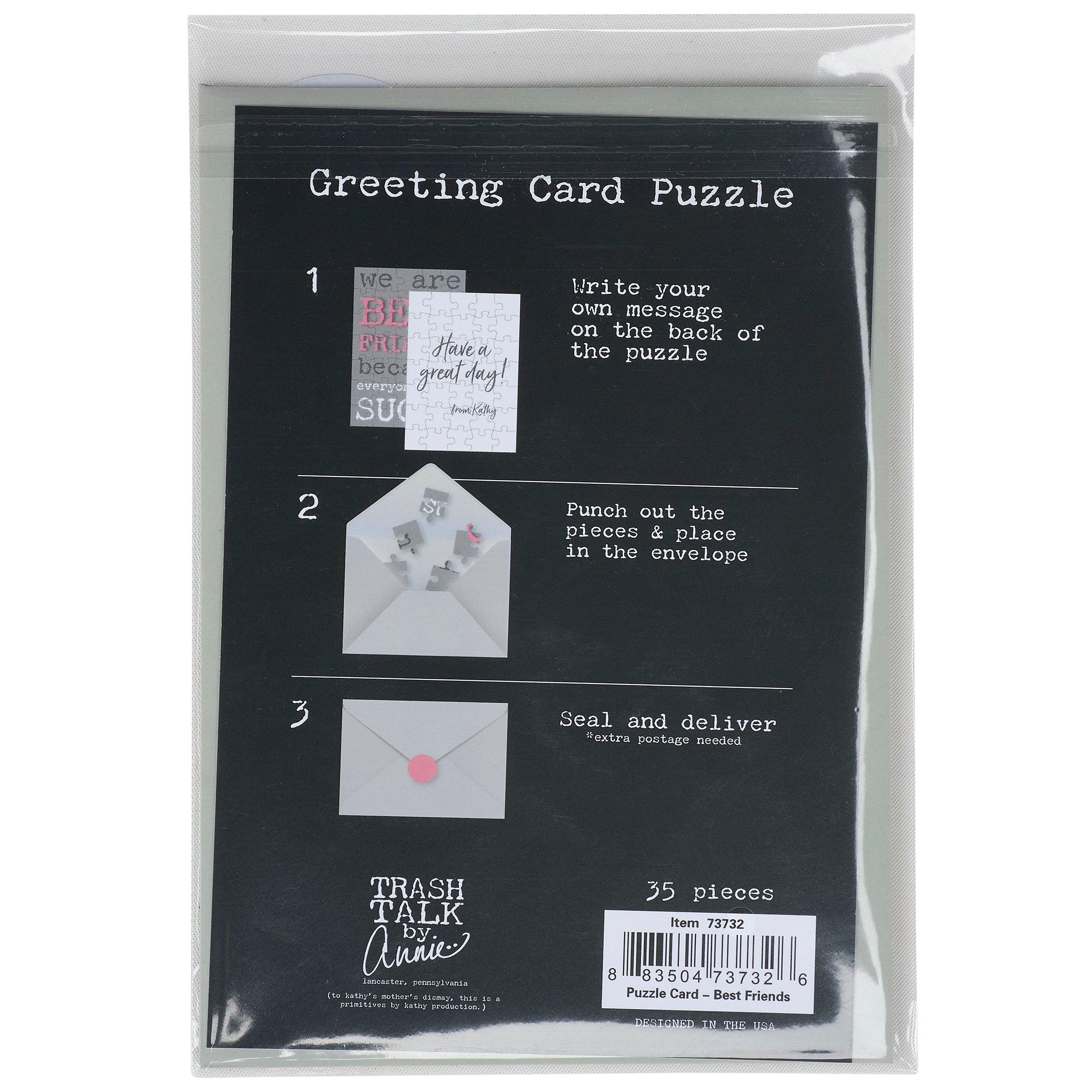 A greeting card puzzle from our Trash Talk By Annie Collection combining the excitement of receiving a greeting card with the joy of completing a puzzle. Our sassy puzzle cards include a blank space on the back to write a personal message, or express creativity in any way, before breaking up the puzzle for someone special to piece together the fun inside! We get them started with a sassy friendship themed sentiment on the front in a fun retro style that reads "We Are Best Friends Because Everyone Else Sucks." After personalizing the back, they break up the 35 piece puzzle and place the pieces in the included gray envelope. The puzzle card and envelope are packaged in a polybag with an insert displaying easy-to-follow instructions. Due to the shape and weight, extra postage is required when mailing puzzle cards. There's no need to wait for a special occasion or a specific holiday, our Best Friends Because puzzle card is perfect for any moment they want to reach out to friends and family.