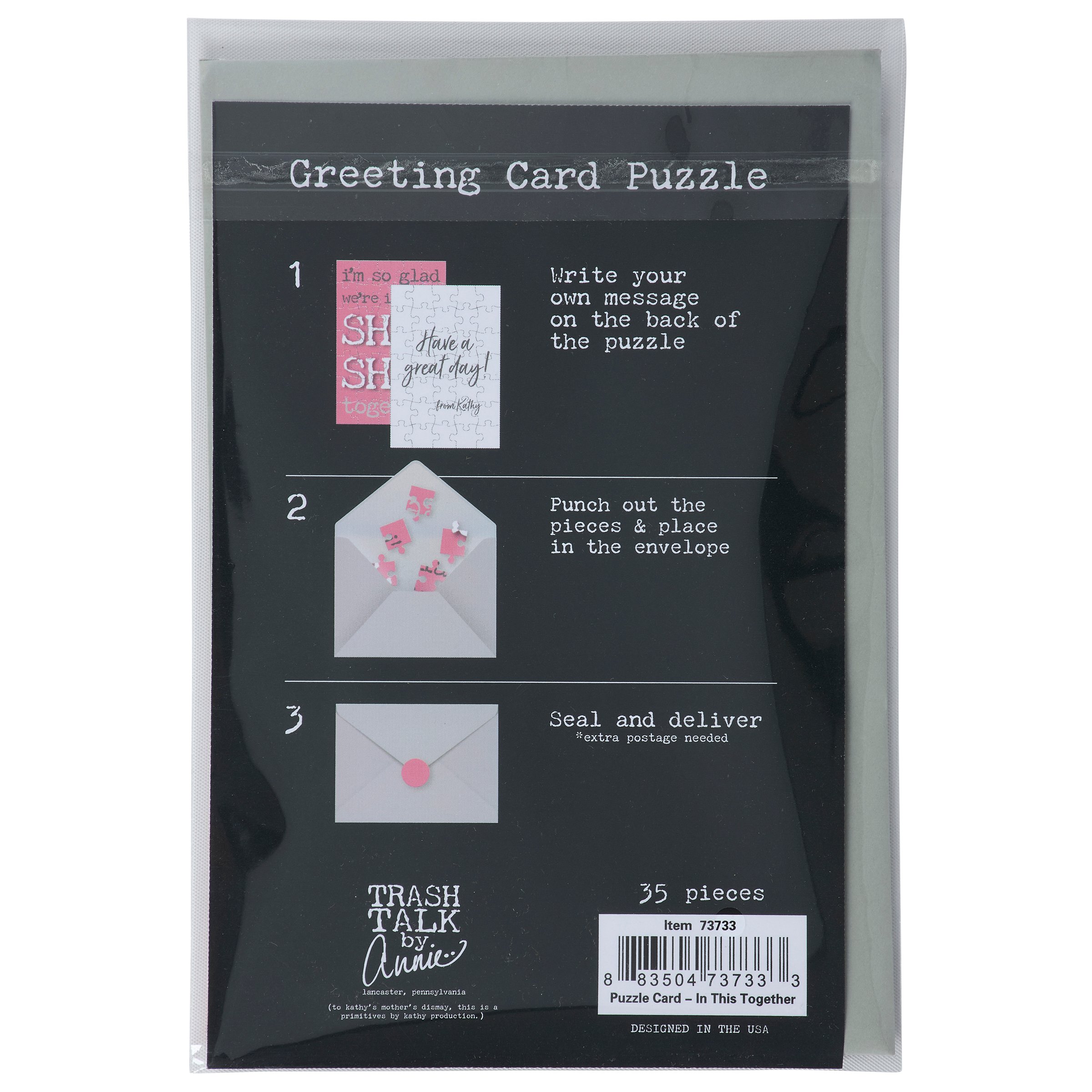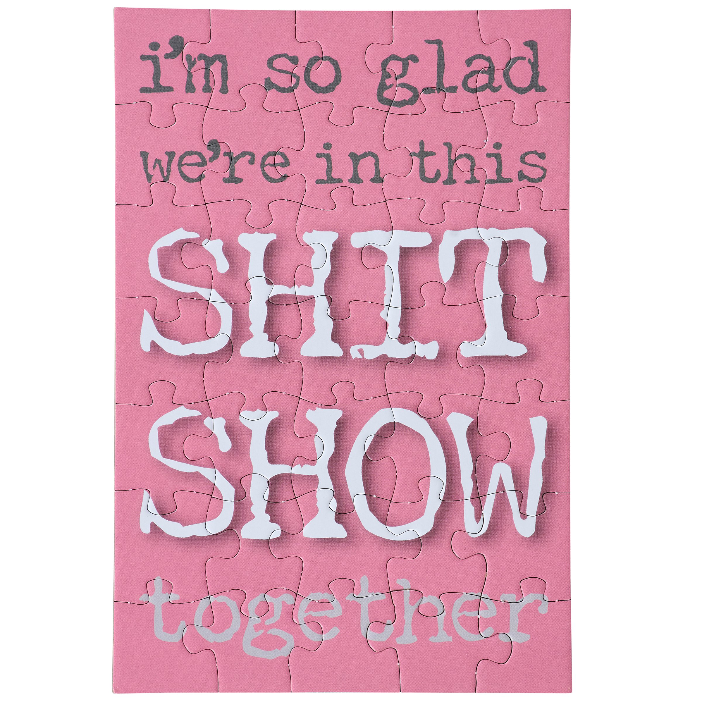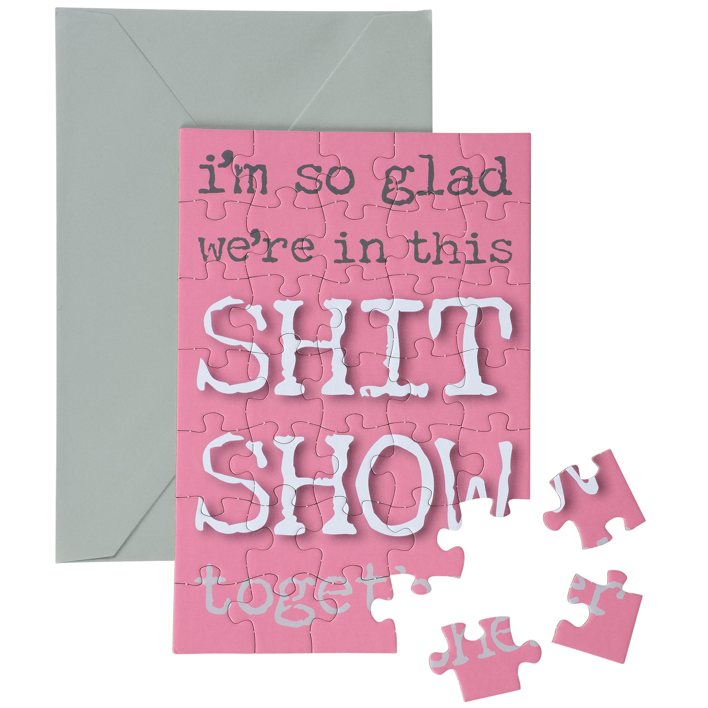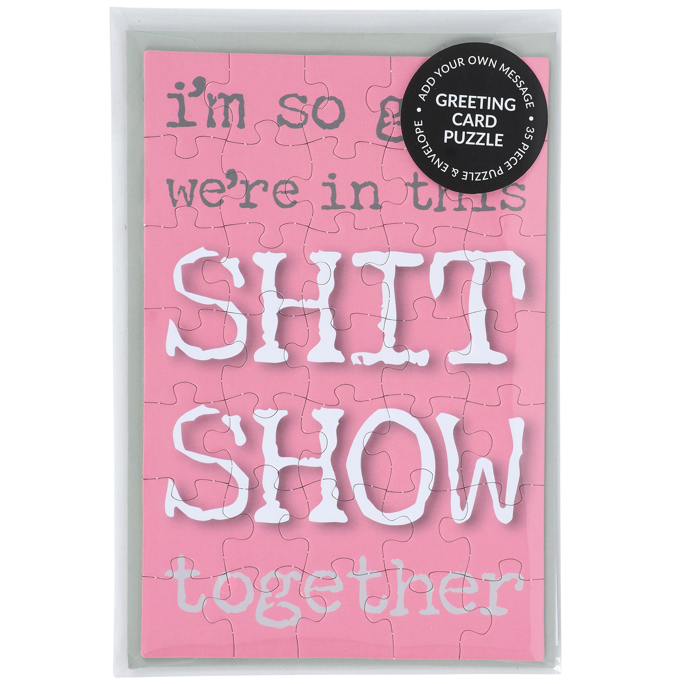 A greeting card puzzle from our Trash Talk By Annie Collection combining the excitement of receiving a greeting card with the joy of completing a puzzle. Our sassy puzzle cards include a blank space on the back to write a personal message, or express creativity in any way, before breaking up the puzzle for someone special to piece together the fun inside! We get them started with a sassy sentiment on the front in a fun retro style that reads "I'm So Glad We're In This Shit Show Together." After personalizing the back, they break up the 35 piece puzzle and place the pieces in the included gray envelope. The puzzle card and envelope are packaged in a polybag with an insert displaying easy-to-follow instructions. Due to the shape and weight, extra postage is required when mailing puzzle cards. There's no need to wait for a special occasion or a specific holiday, our Glad We're In This Together puzzle card is perfect for any moment they want to reach out to friends and family.