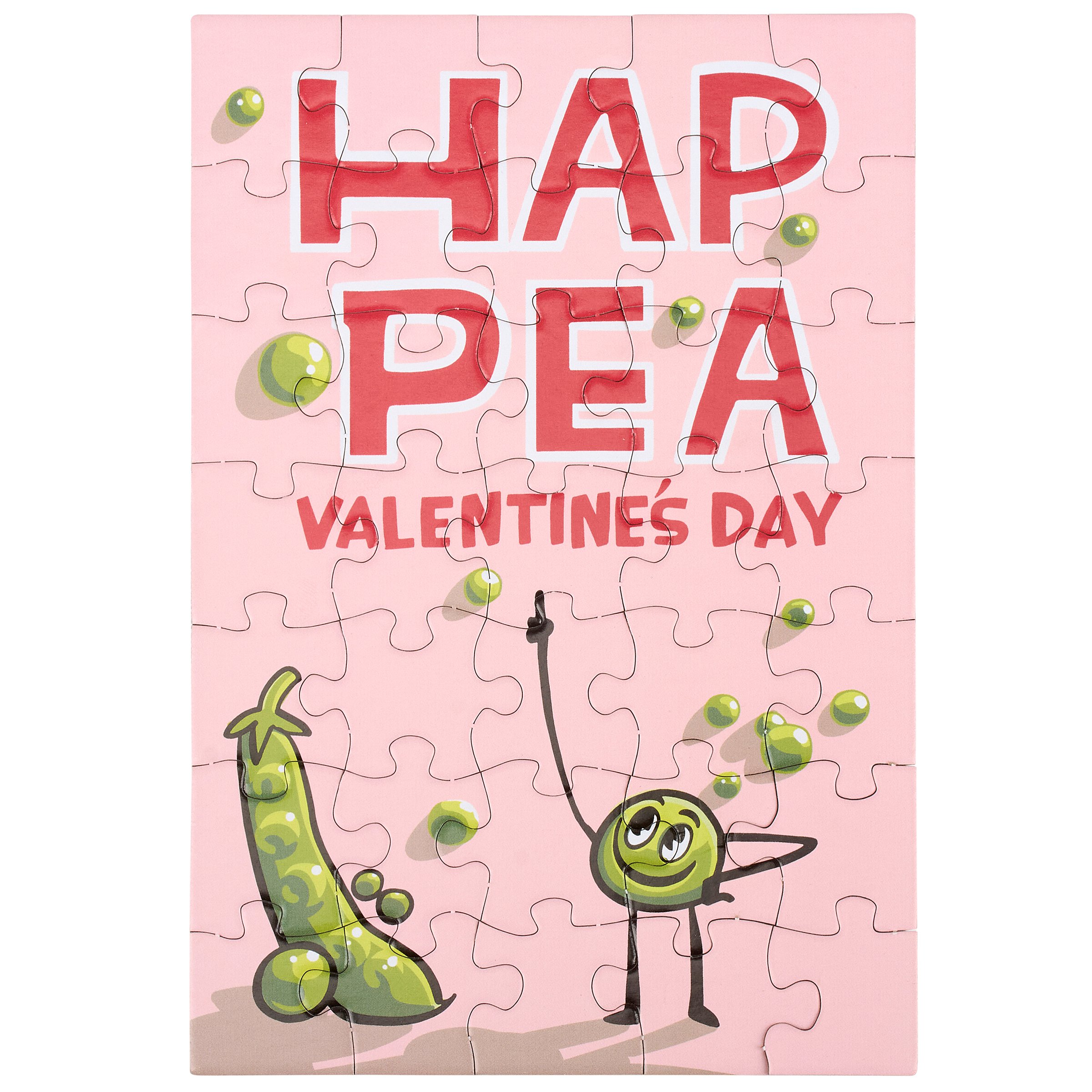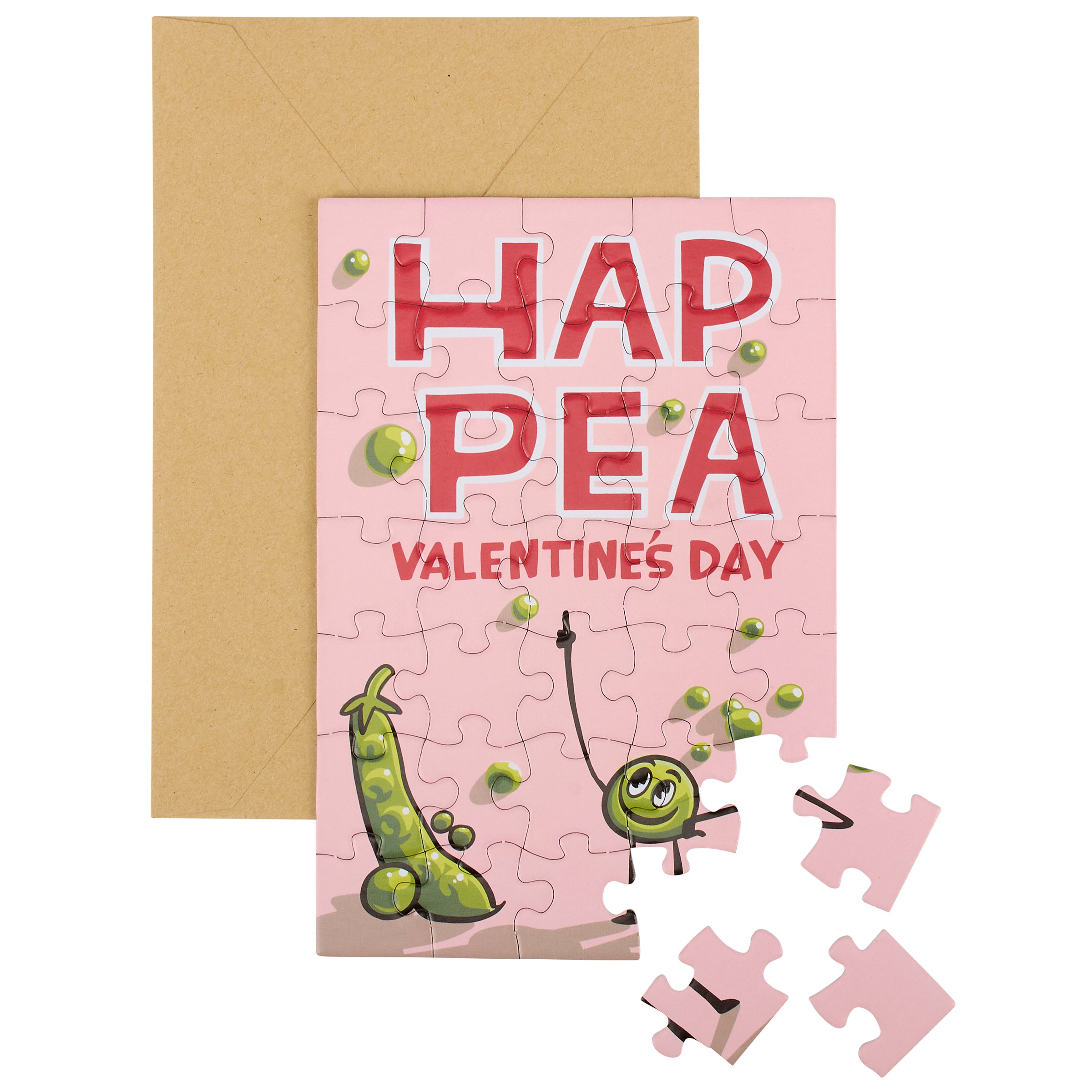 A greeting card puzzle from our Valentine's Day Collection combining the excitement of receiving a greeting card with the joy of completing a puzzle. This Valentine's Day puzzle card includes a blank space on the back to write a personal message, or express creativity in any way, before breaking up the puzzle for someone special to piece together the fun inside! We get them started with a fun Valentine's Day inspired design on the front featuring a hand illustrated pea character with a food-themed sentiment that reads "Hap-pea Valentine's Day." After personalizing the back, break up the 35 piece puzzle and place the pieces in the included kraft envelope. Our Hap-pea Valentine's Day puzzle card and envelope is packaged in a polybag with an insert displaying easy-to-follow instructions. Due to the shape and weight, extra postage is required when mailing puzzle cards. A food-themed greeting card that offers a fun alternative for Valentine's Day gifting to both friends and partners.