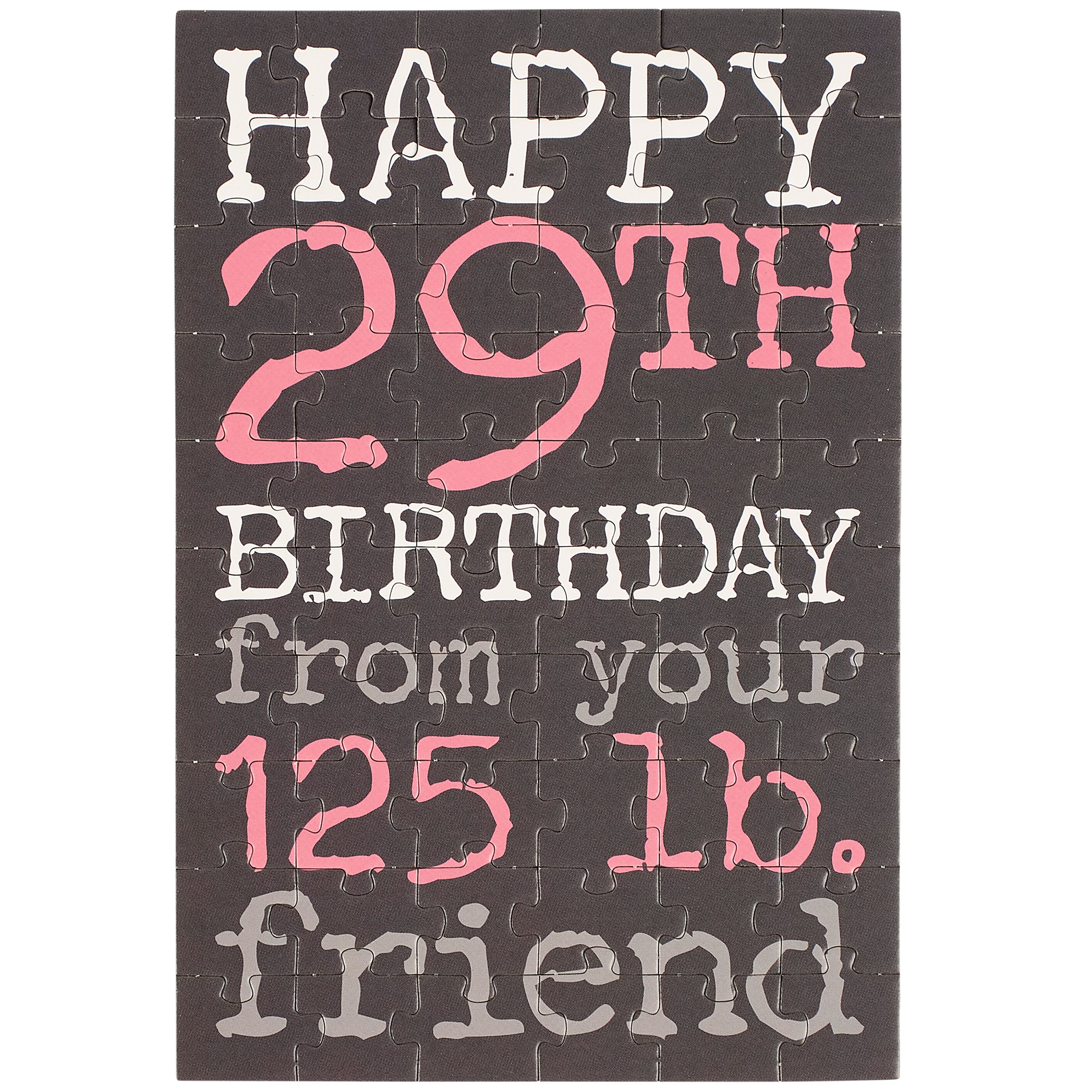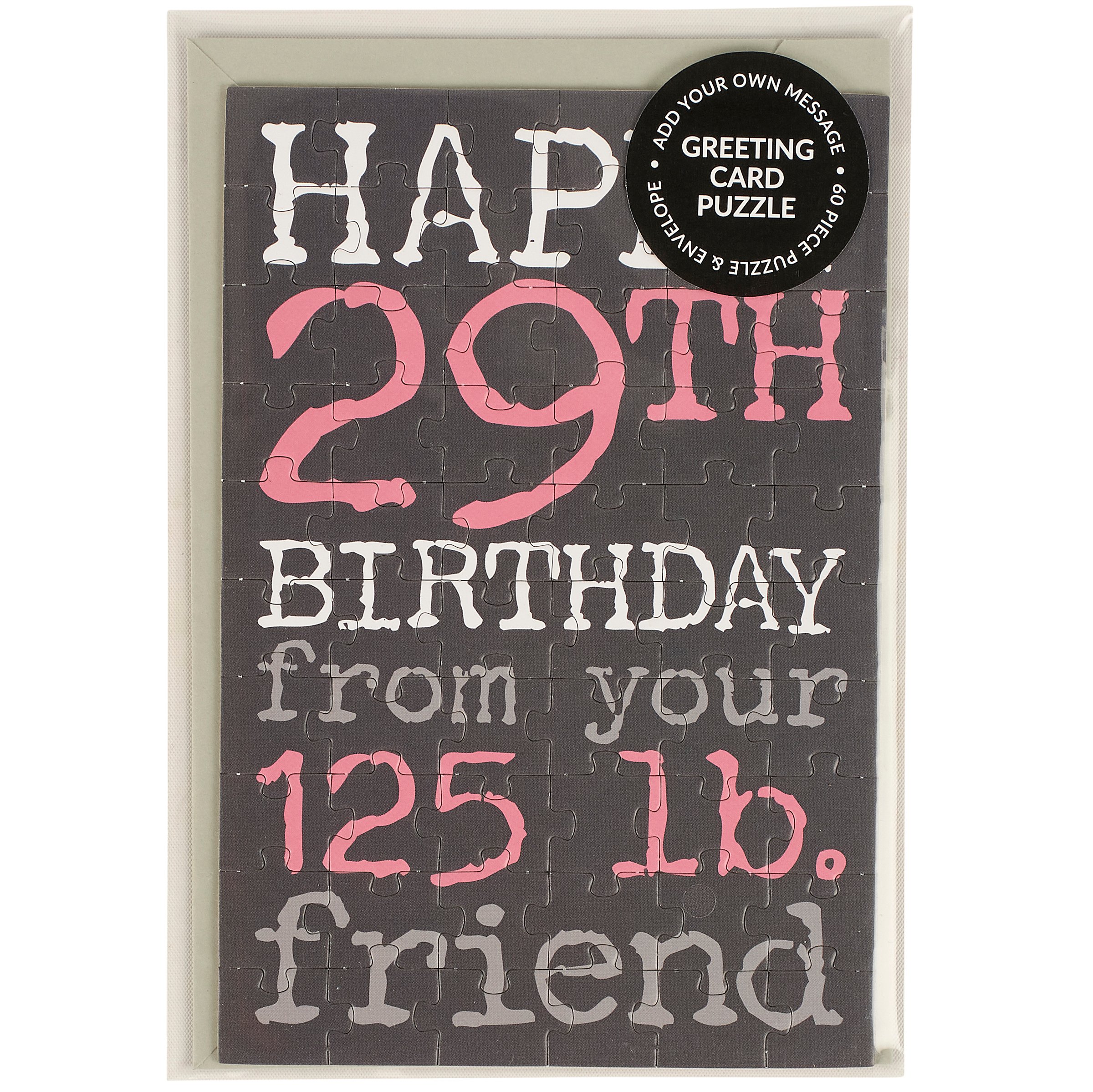 A greeting card puzzle from our Trash Talk By Annie Collection combining the excitement of receiving a greeting card with the joy of completing a puzzle. Our funny puzzle cards include a blank space on the back to write a personal message, or express creativity in any way, before breaking up the puzzle for someone special to piece together the fun inside! We get you started with a humorous birthday-inspired sentiment on the front in a fun retro style that reads "Happy 29th Birthday From Your 125 lb. Friend." After personalizing the back, break up the 60 piece puzzle and place the pieces in the included gray envelope. Everything is packaged in a polybag with an insert displaying easy-to-follow instructions. Due to the shape and weight, extra postage is required when mailing puzzle cards. Our Happy Birthday puzzle card offers a fun and relatable way to wish friends and family a happy birthday.