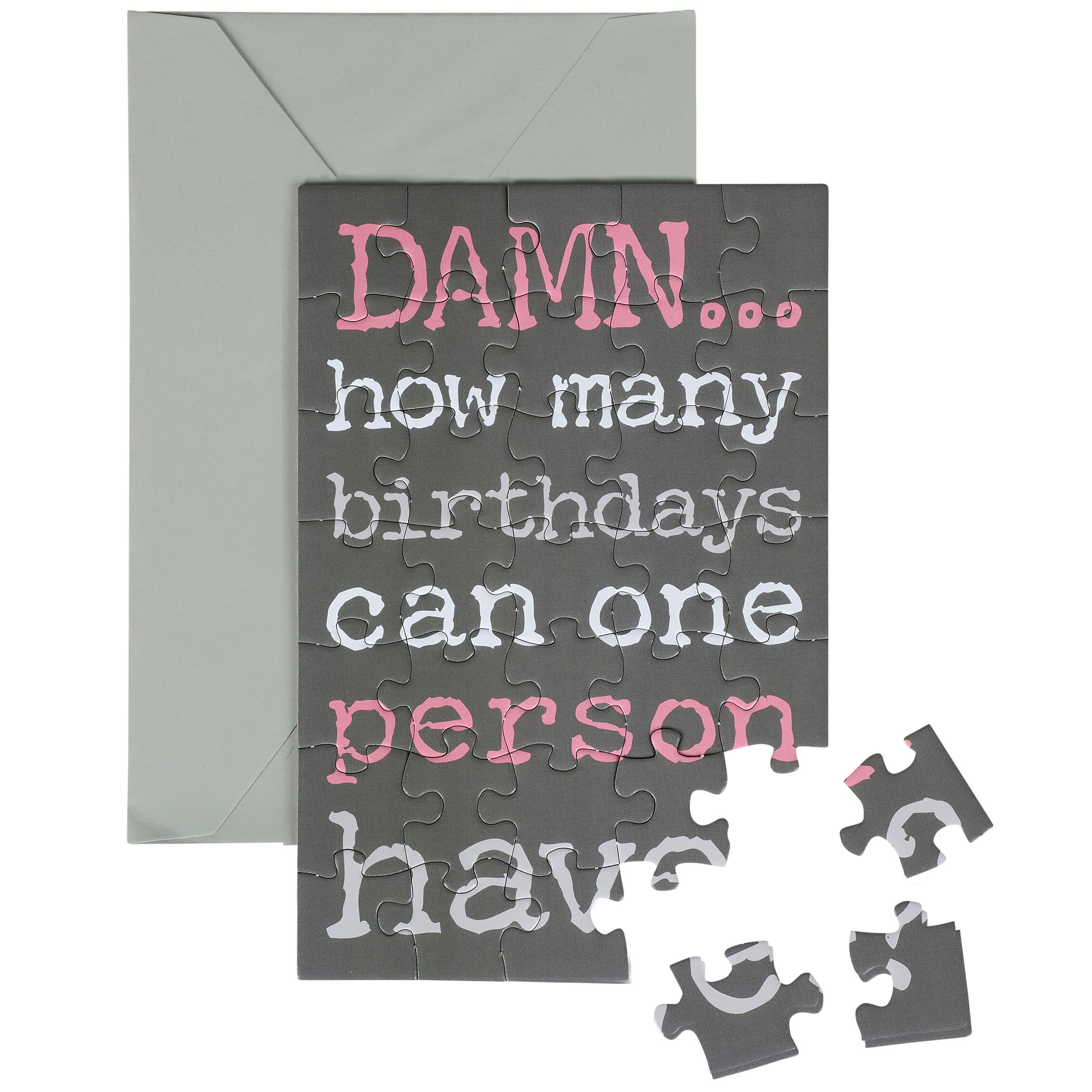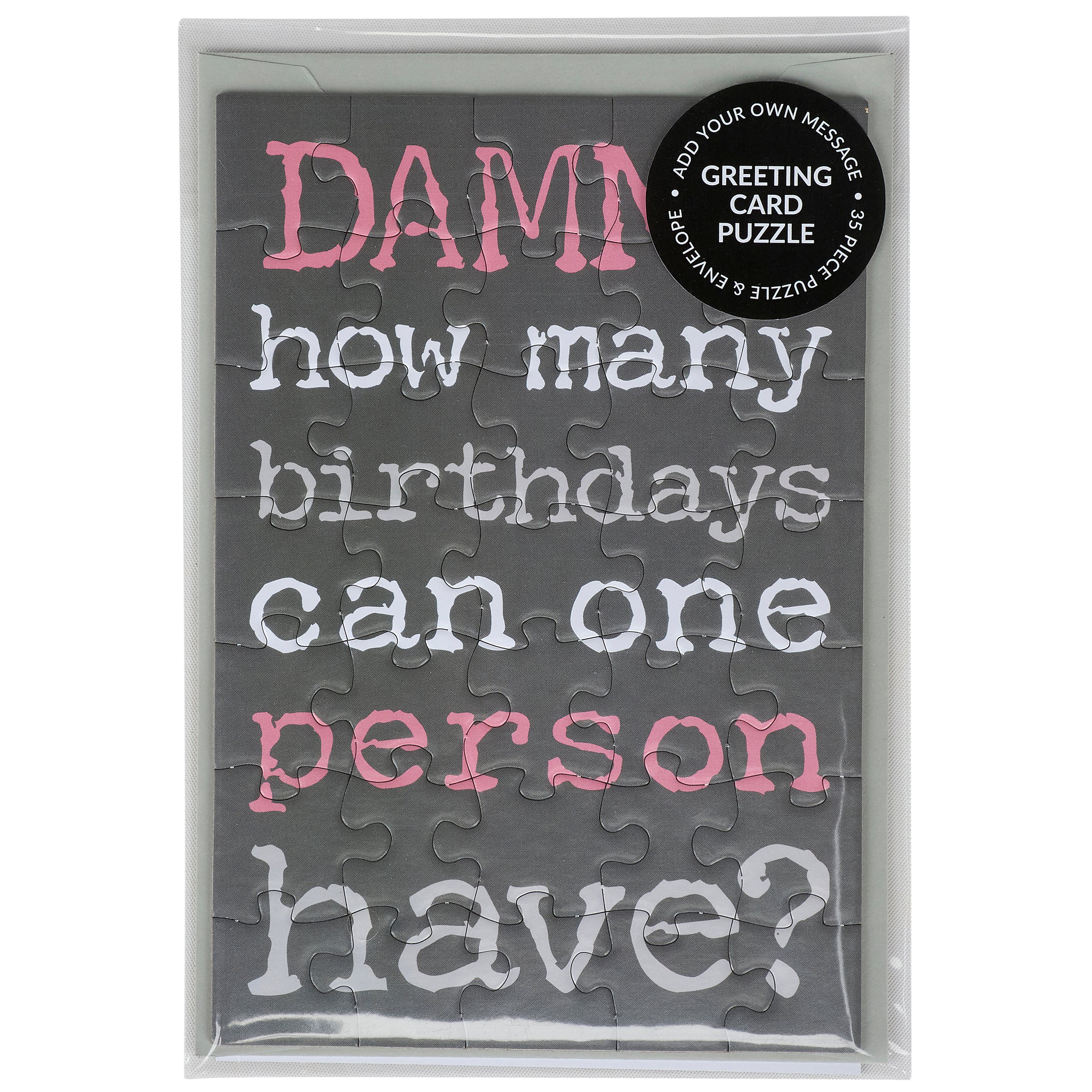 A greeting card puzzle from our Trash Talk By Annie Collection combining the excitement of receiving a birthday card with the joy of completing a puzzle. Our sassy puzzle cards include a blank space on the back to write a personal message, or express creativity in any way, before breaking up the puzzle for someone special to piece together the fun inside! We get them started with a sassy birthday sentiment on the front in a fun retro style that reads "Damn... How Many Birthdays Can One Person Have?" After personalizing the back, they break up the 35 piece puzzle and place the pieces in the included gray envelope. The puzzle card and envelope are packaged in a polybag with an insert displaying easy-to-follow instructions. Due to the shape and weight, extra postage is required when mailing puzzle cards. Our How Many Birthdays puzzle card offers a fun and relatable way to wish friends and family a happy birthday.