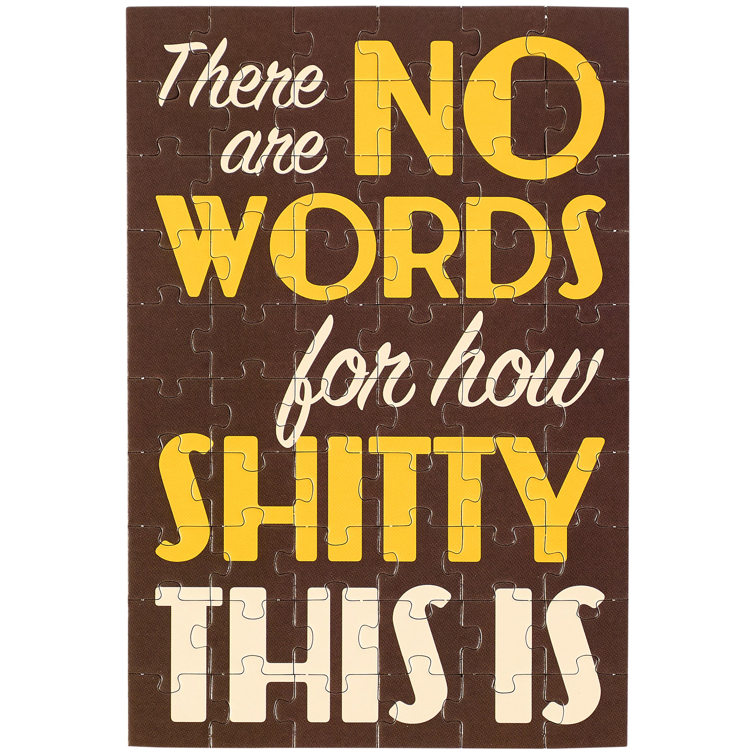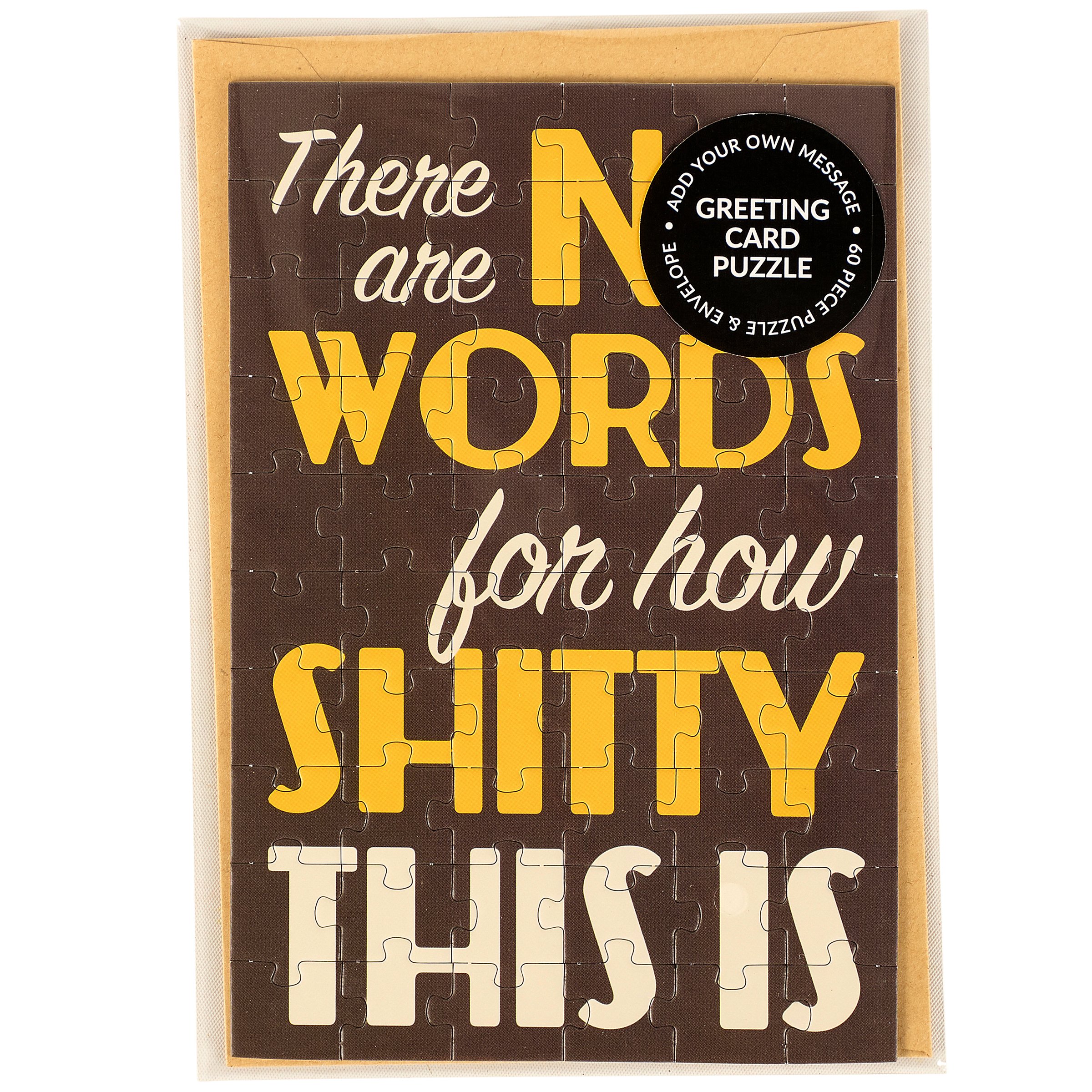 Don't just give your feelings away, make 'em work for it. This relatable greeting card puzzle combines the feels of receiving a card with the satisfaction of completing a puzzle! Questionables puzzle cards include a blank space on the back to write a personal message or express creativity in any way you want before breaking up the puzzle for someone special to piece together the fun inside! We get you started with a relatable sentiment in a bold style on the front that reads "There Are No Words For How Shitty This Is." Do your thing on the back, punch out the 60 pieces, and place them in the included envelope. Everything is packaged in a polybag with an insert displaying easy-to-follow instructions. Due to the shape and weight, extra postage is required when mailing puzzle cards. There's no need to wait for a special occasion or a specific holiday, our No Words puzzle card is perfect for any moment a you want to present a personal message to friends and family letting them know that everyday life can be hard, but we got this.