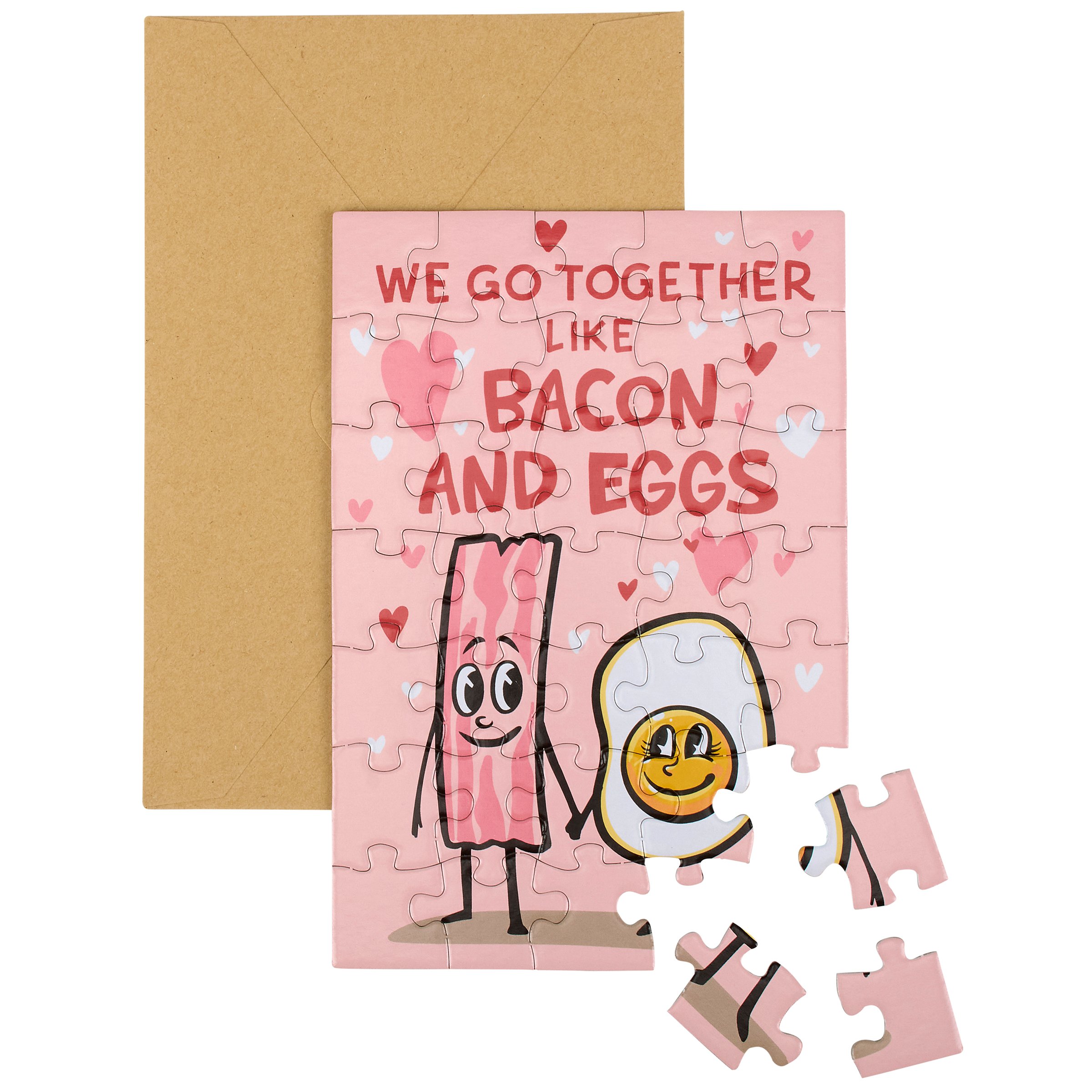 A greeting card puzzle from our Valentine's Day Collection combining the excitement of receiving a greeting card with the joy of completing a puzzle. This Valentine's Day puzzle card includes a blank space on the back to write a personal message, or express creativity in any way, before breaking up the puzzle for someone special to piece together the fun inside! We get them started with a fun love inspired design on the front featuring a hand illustrated bacon and egg character couple with a food-themed sentiment that reads "We Go Together Like Bacon And Eggs." After personalizing the back, break up the 35 piece puzzle and place the pieces in the included kraft envelope. Our We Go Together Like Bacon And Eggs puzzle card and envelope is packaged in a polybag with an insert displaying easy-to-follow instructions. Due to the shape and weight, extra postage is required when mailing puzzle cards. A food-themed greeting card that offers a fun alternative for Valentine's Day gifting to both friends and partners.