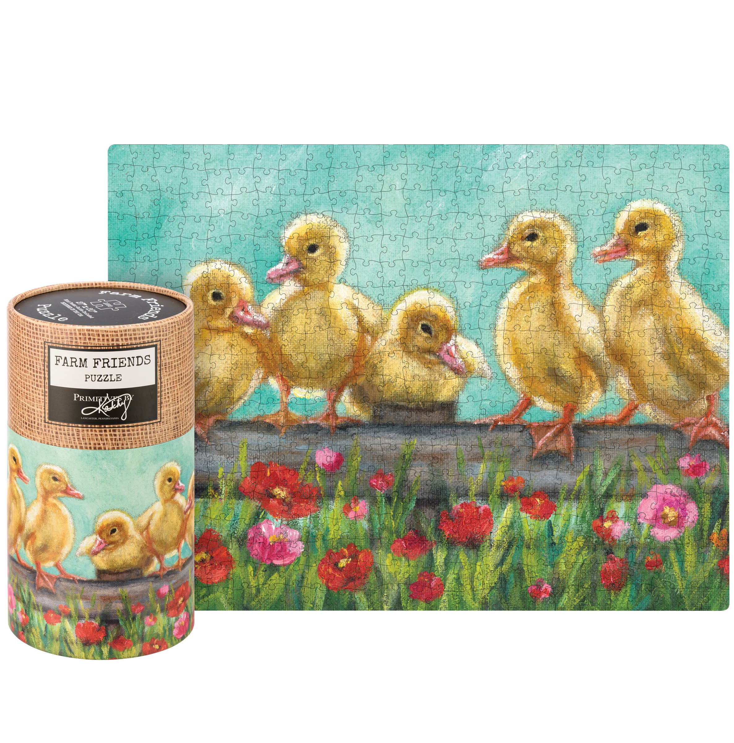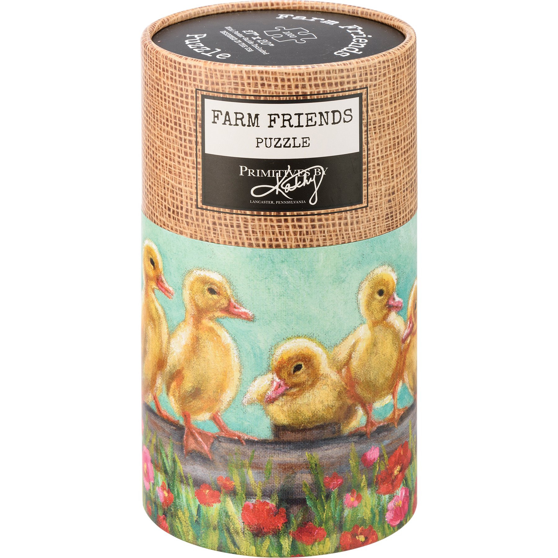 A 1,000 piece puzzle featuring a ducklings design. Design is replicated from original artwork painted onto burlap canvas, giving the art a unique depth and texture. Puzzle pieces are packaged in a resealable plastic bag and enclosed in a cylindrical box with the design wrapped around and a descriptive "Farm Friends Puzzle" sentiment on lid. Includes 10" x 8" printout of full puzzle image for reference.