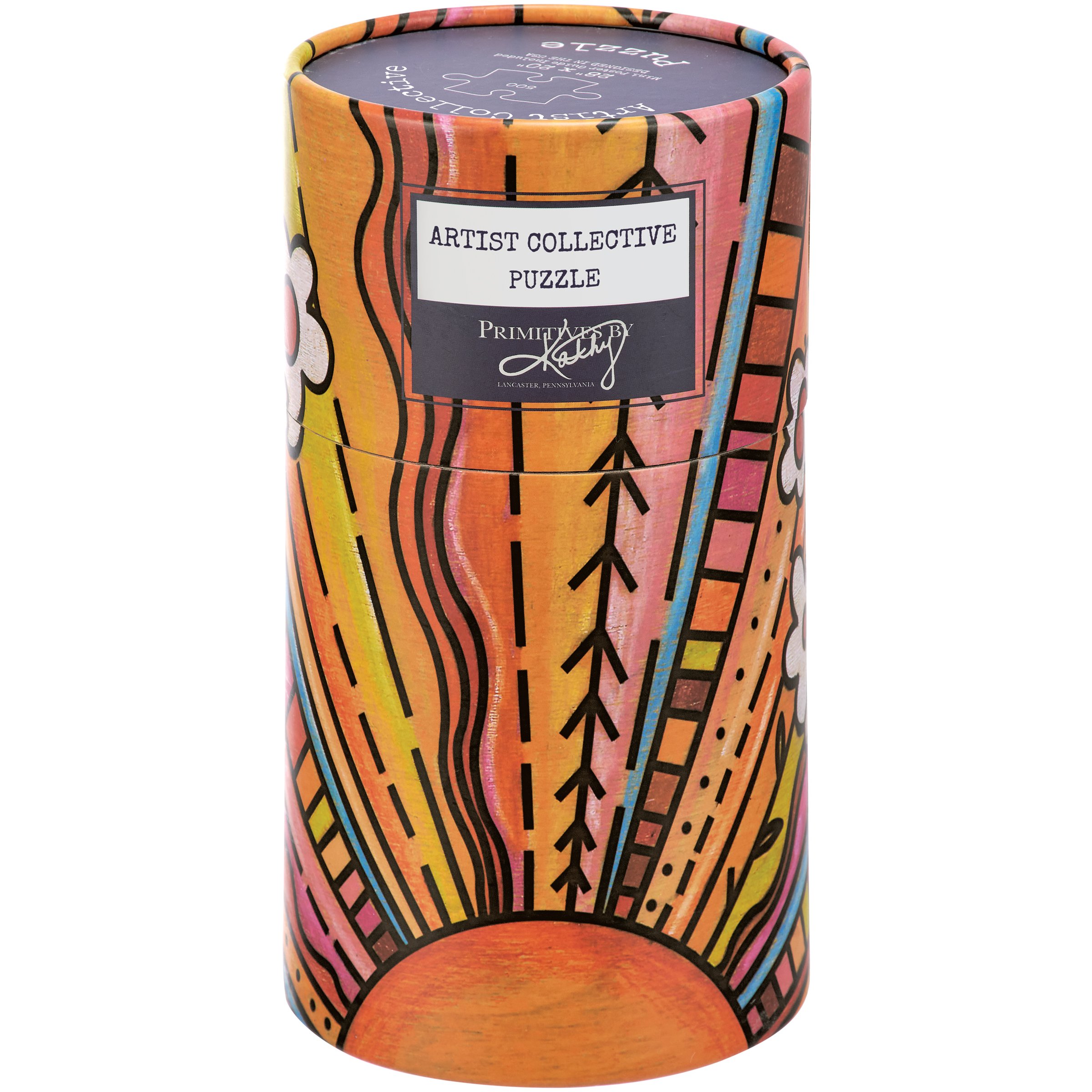 A 500 piece floral sun puzzle displaying wood burned artwork from our Artist Collective Collection focused on inspiration of the sun. Puzzle pieces are packaged in a resealable plastic bag and enclosed in a cylindrical box with the design wrapped around and a descriptive "Artist Collective Puzzle" sentiment on lid. The Floral Sun puzzle includes a 10" x 8" printout of full puzzle image for reference.