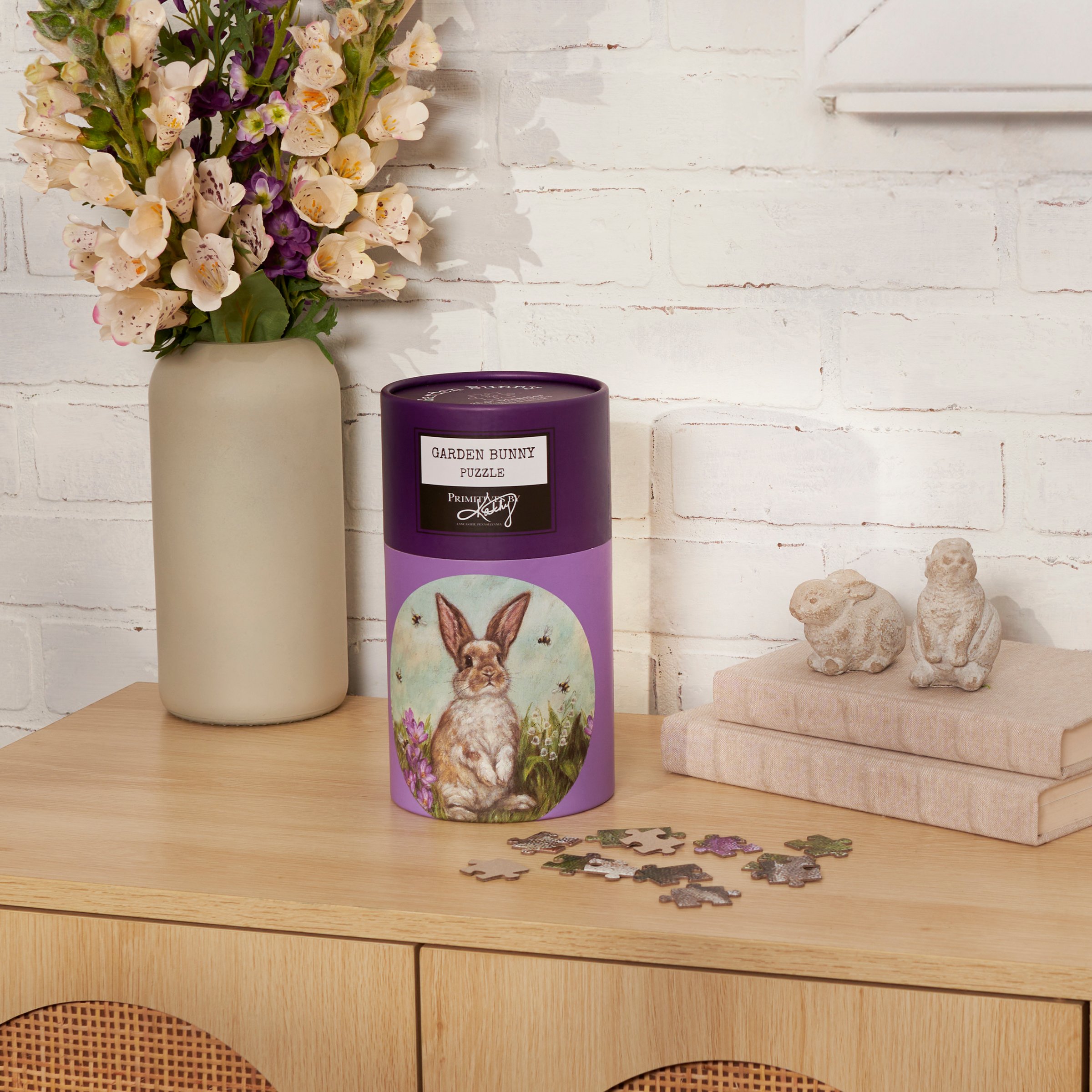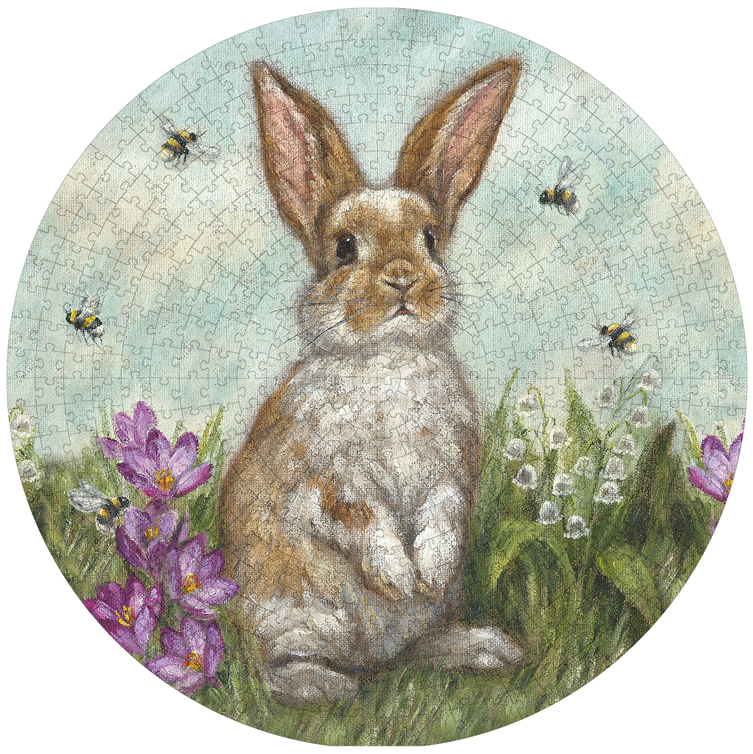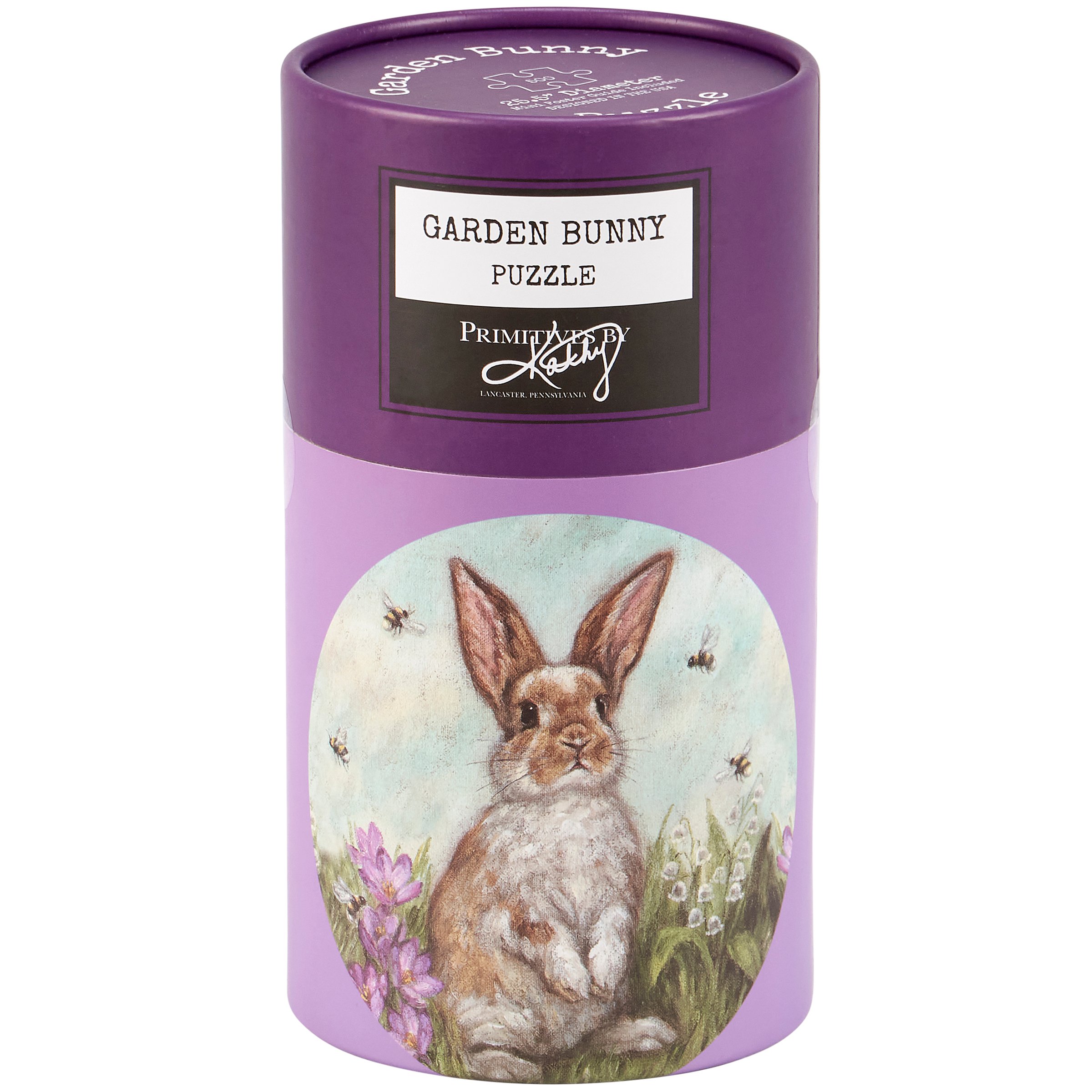 A 500 piece puzzle from our Easter & Spring Collection displaying a hand painted scene of a bunny in a garden of spring flowers and bees. Design is replicated from original artwork painted onto burlap canvas, giving the art a unique depth and texture. Puzzle pieces are packaged in a resealable plastic bag and enclosed in a cylindrical box with the design displayed around outside and a descriptive "Garden Bunny Puzzle" sentiment on lid. Our Garden Bunny puzzle includes a printout of full puzzle image for reference. Contains small parts; this is not a toy. A charming accessory great for seasonal gifting.