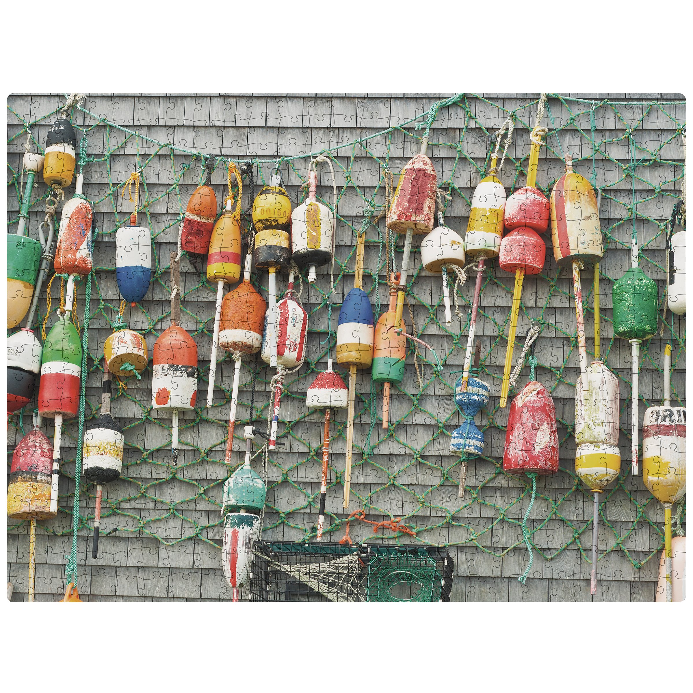 A 500 piece puzzle from our Beach Collection displaying a vintage photograph of various buoys mounted on a wall. Puzzle pieces are packaged in a resealable plastic bag and enclosed in a cylindrical box with the design displayed around outside and a descriptive "Mounted Buoys Puzzle" sentiment on lid. Our Lobster Buoys 500 piece puzzle includes a printout of full puzzle image for reference. Contains small parts; this is not a toy. A vintage beach-themed puzzle great for gifting.