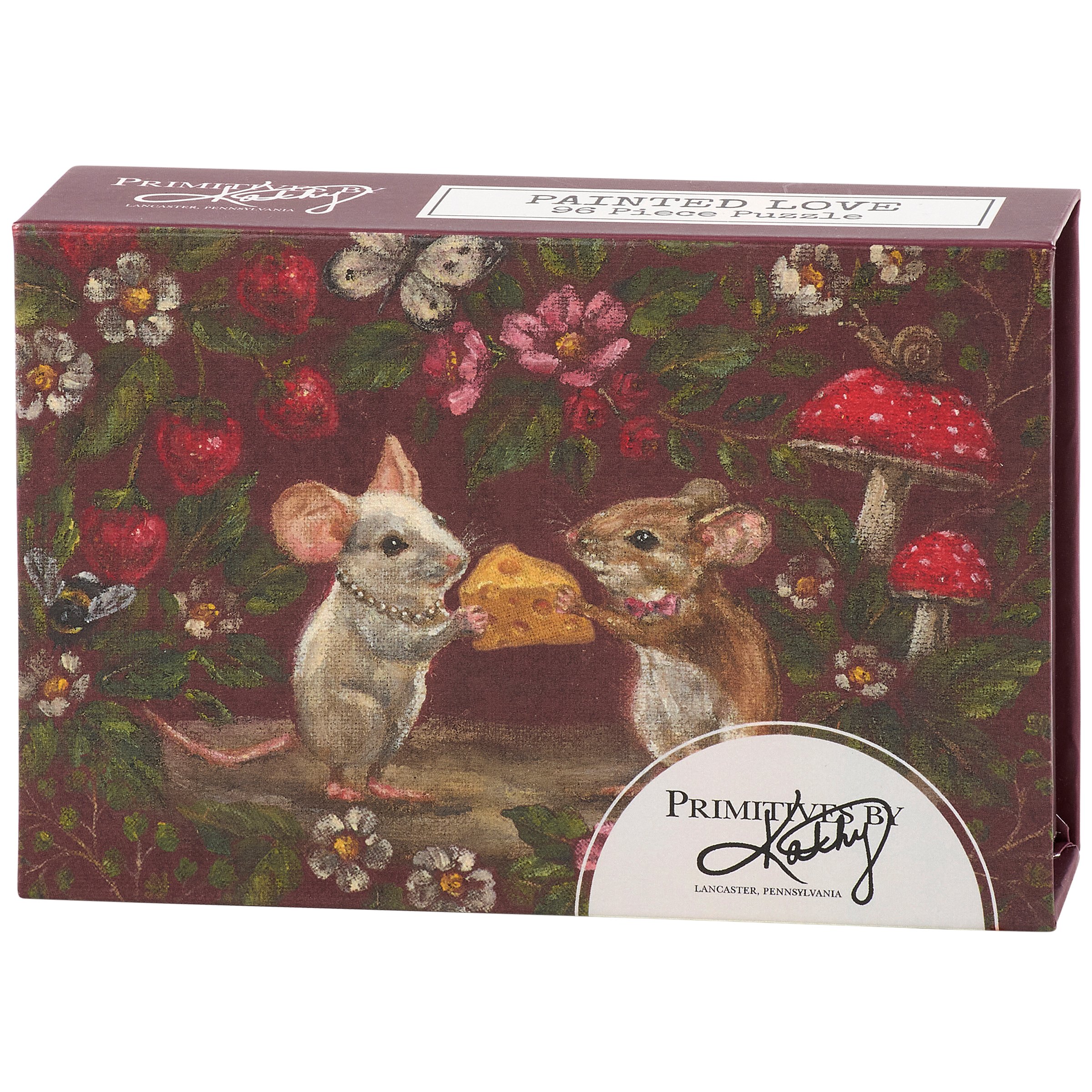 A 96 piece puzzle from our Valentine's Day Collection displaying a heartwarming scene of moody spring flowers surrounding a fancy mouse couple gifting a piece of cheese. Valentine mouse couple design is replicated from original artwork painted onto burlap canvas, giving the art a unique depth and texture. Puzzle pieces are packaged in a resealable bag and enclosed in a sturdy box that is small enough to easily store in an everyday bag or luggage and puzzle whenever the moment arrives. Our Mouse Love puzzle includes a print displaying the full puzzle image for reference. Contains small parts; this is not a toy. A cute Valentine's Day puzzle great for gifting and on the go games.