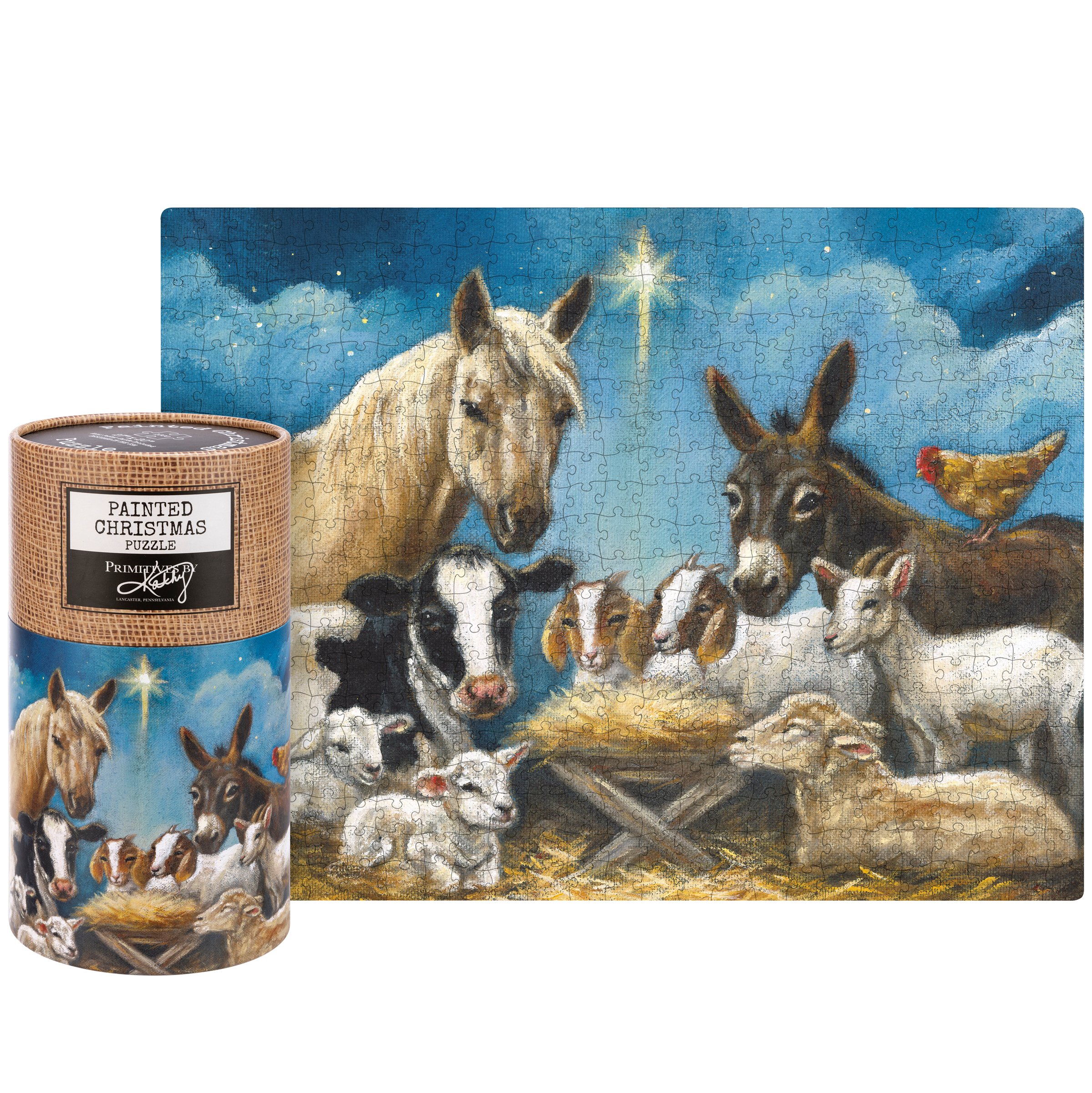 A 1,000 piece puzzle featuring a farm animal Nativity design. Design is replicated from original artwork painted onto burlap canvas, giving the art a unique depth and texture. Puzzle pieces are packaged in a resealable plastic bag and enclosed in a cylindrical box with the design wrapped around and a descriptive "Painted Christmas Puzzle" sentiment on lid. Includes 10" x 8" printout of full puzzle image for reference.