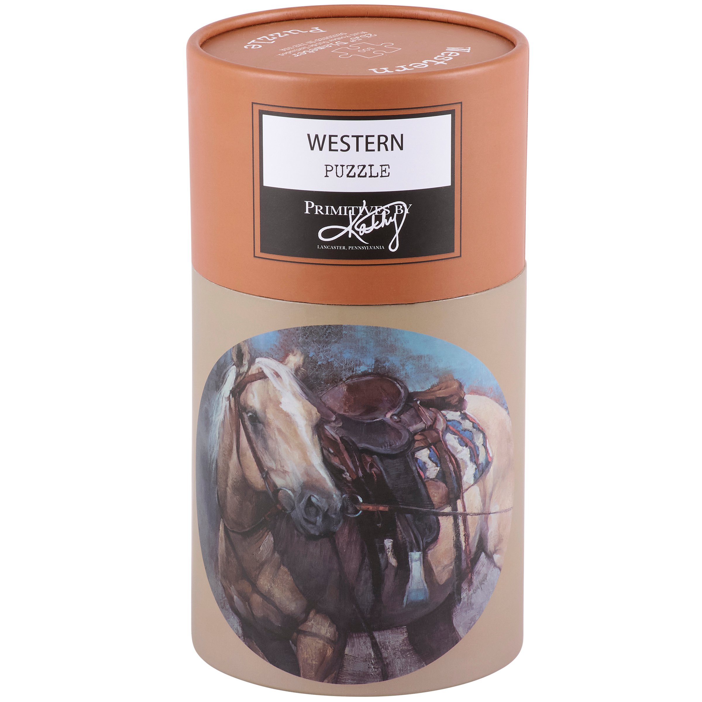 A 500 piece puzzle from our Western Collection displaying a hand painted design of a palomino horse wearing a saddle. Design is replicated from original hand painted art for added texture. Puzzle pieces are packaged in a resealable plastic bag and enclosed in a cylindrical box with the design displayed around outside and a descriptive "Western Puzzle" sentiment on lid. Our Palomino puzzle includes a printout of full puzzle image for reference. Contains small parts; this is not a toy. A western inspired accessory great for everyday gifting.