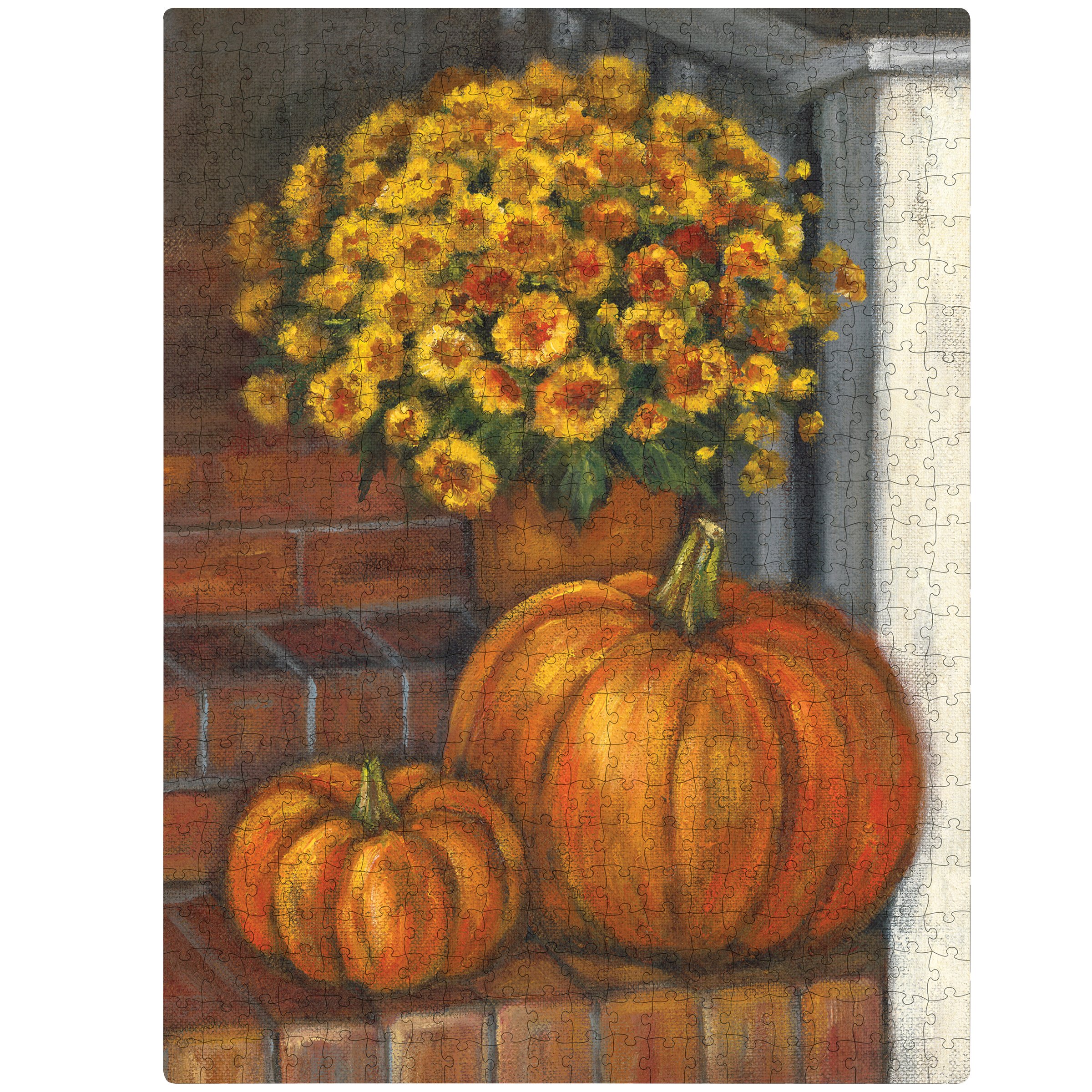A 500 piece puzzle from our Fall & Harvest Collection displaying a hand painted scene of potted fall flowers and pumpkins on porch steps. Design is replicated from original artwork painted onto burlap canvas, giving the art a unique depth and texture. Puzzle pieces are packaged in a resealable plastic bag and enclosed in a cylindrical box with the design displayed around outside and a descriptive "Painted Fall Puzzle" sentiment on lid. Our Porch Steps And Flowers puzzle includes an 8 inch x 10 inch printout of full puzzle image for reference. Contains small parts; this is not a toy. A charming accessory great for seasonal gifting.