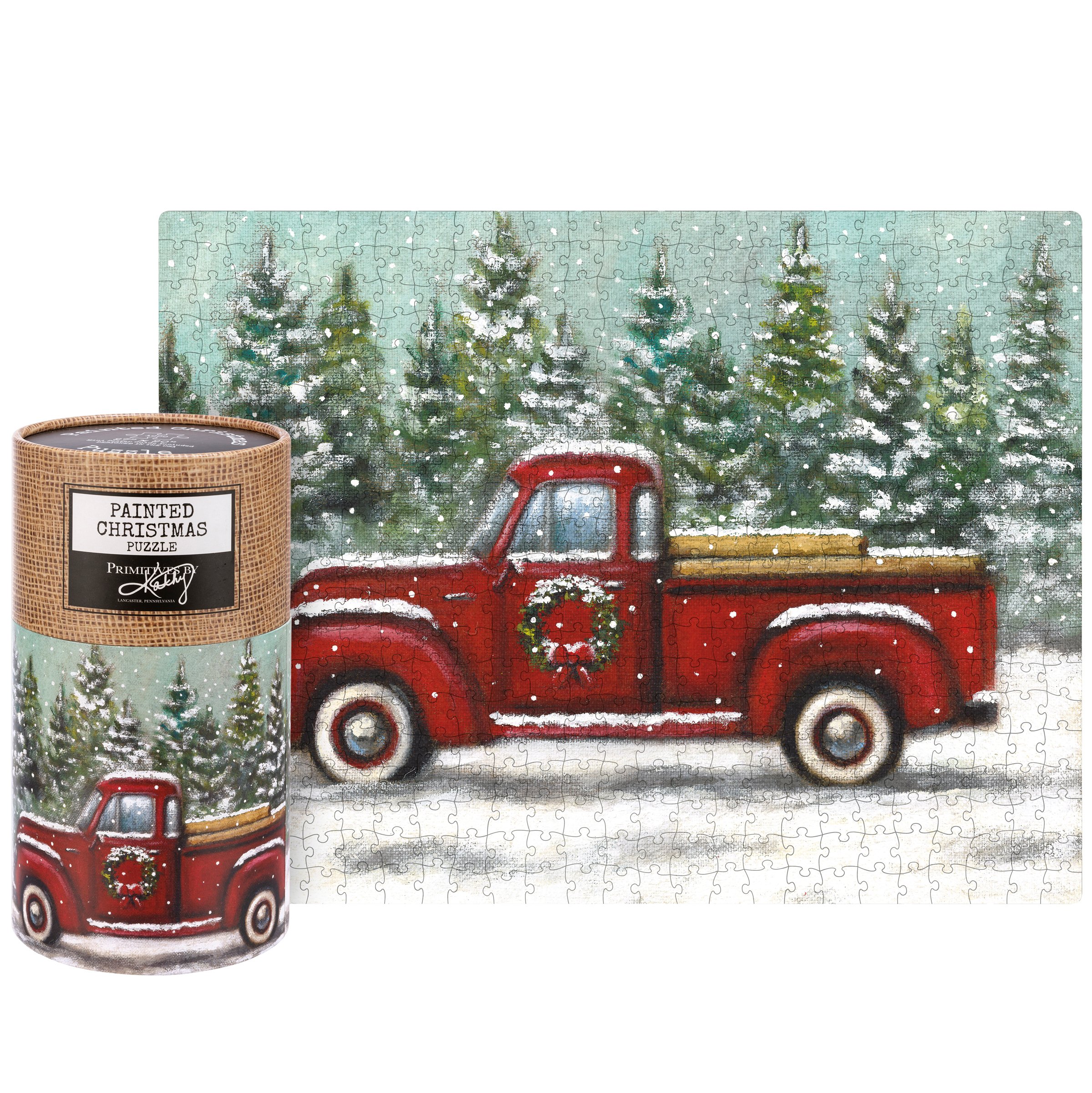 A 1,000 piece puzzle featuring a wintry red truck design. Design is replicated from original artwork painted onto burlap canvas, giving the art a unique depth and texture. Puzzle pieces are packaged in a resealable plastic bag and enclosed in a cylindrical box with the design wrapped around and a descriptive "Painted Christmas Puzzle" sentiment on lid. Includes 10" x 8" printout of full puzzle image for reference.