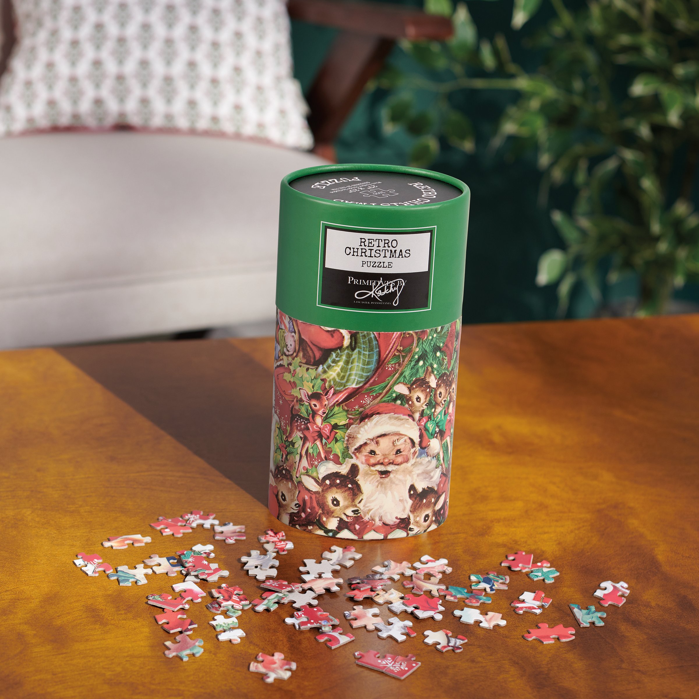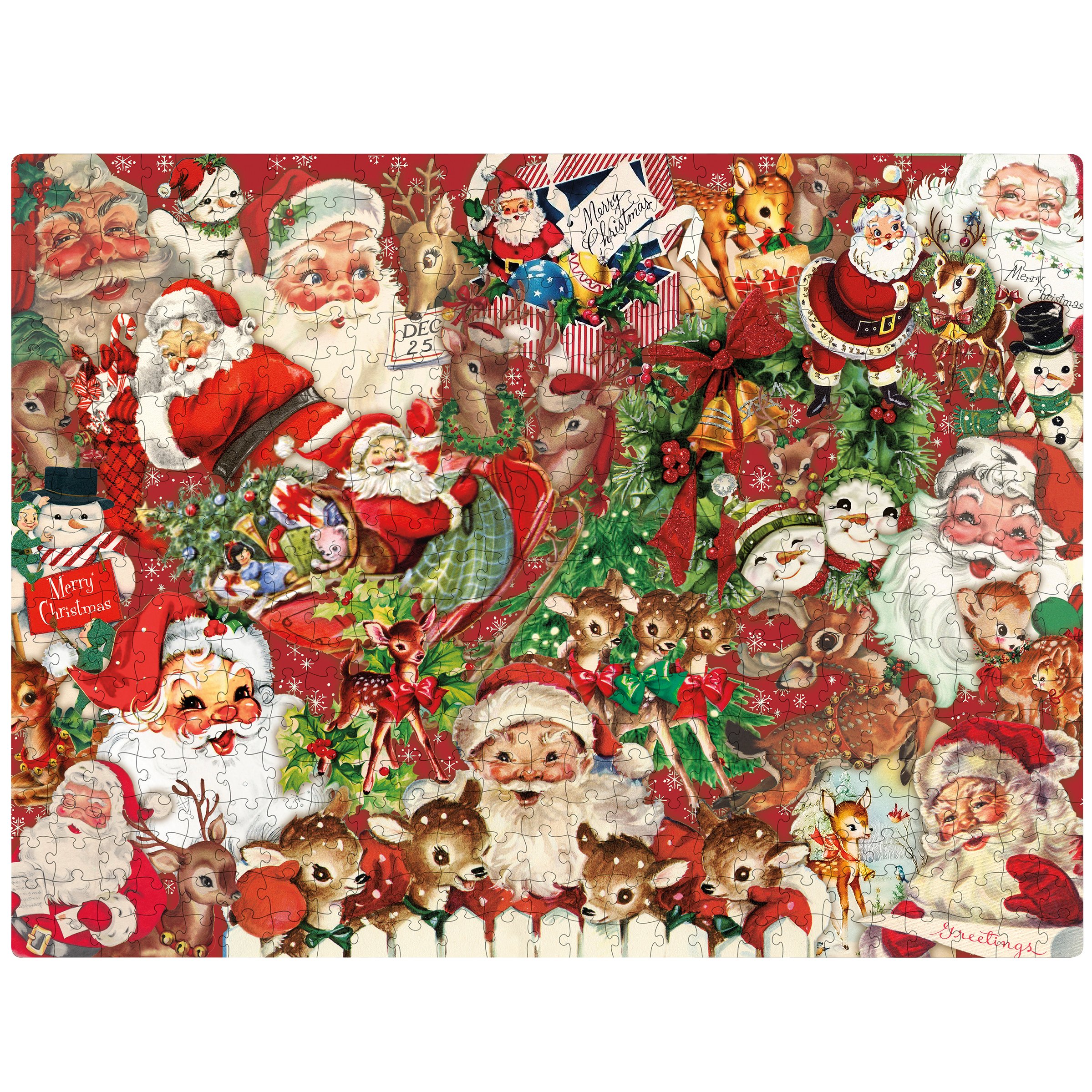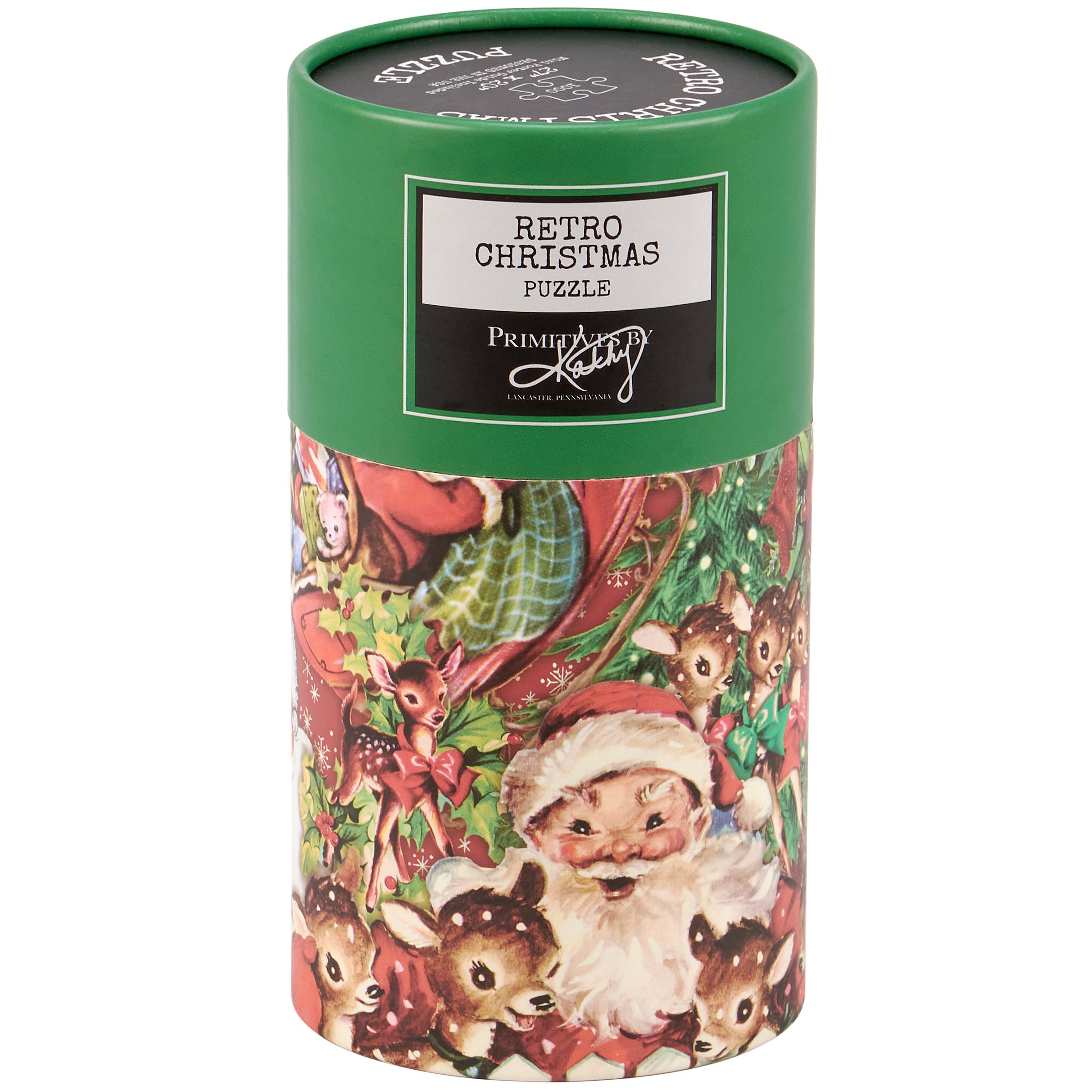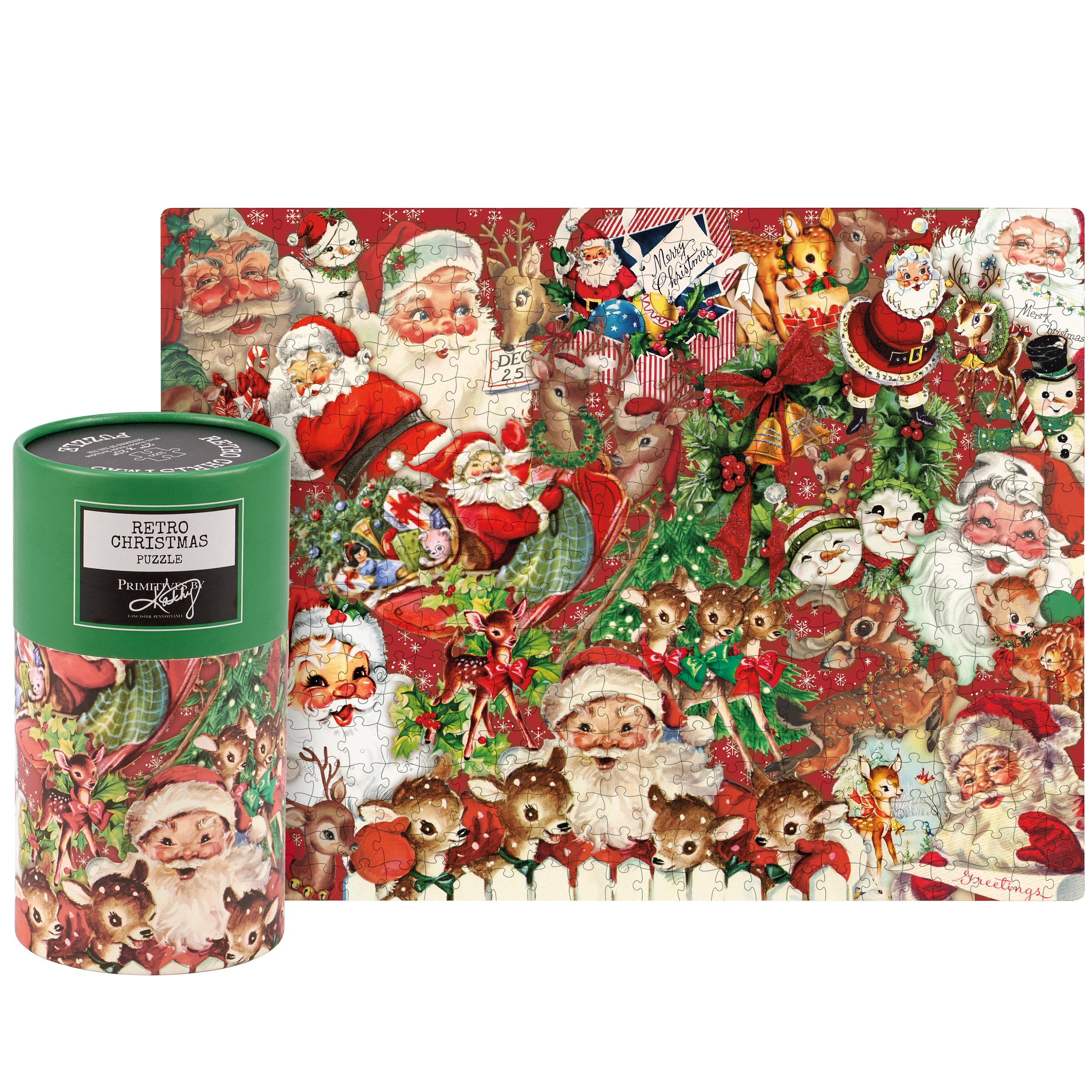 A 1,000 piece puzzle featuring a retro Christmas design. Puzzle pieces are packaged in a resealable plastic bag and enclosed in a cylindrical box with a wrap-around design and a descriptive "Merry Christmas Puzzle" sentiment on lid. Includes 10" x 8" printout of full puzzle image for reference.