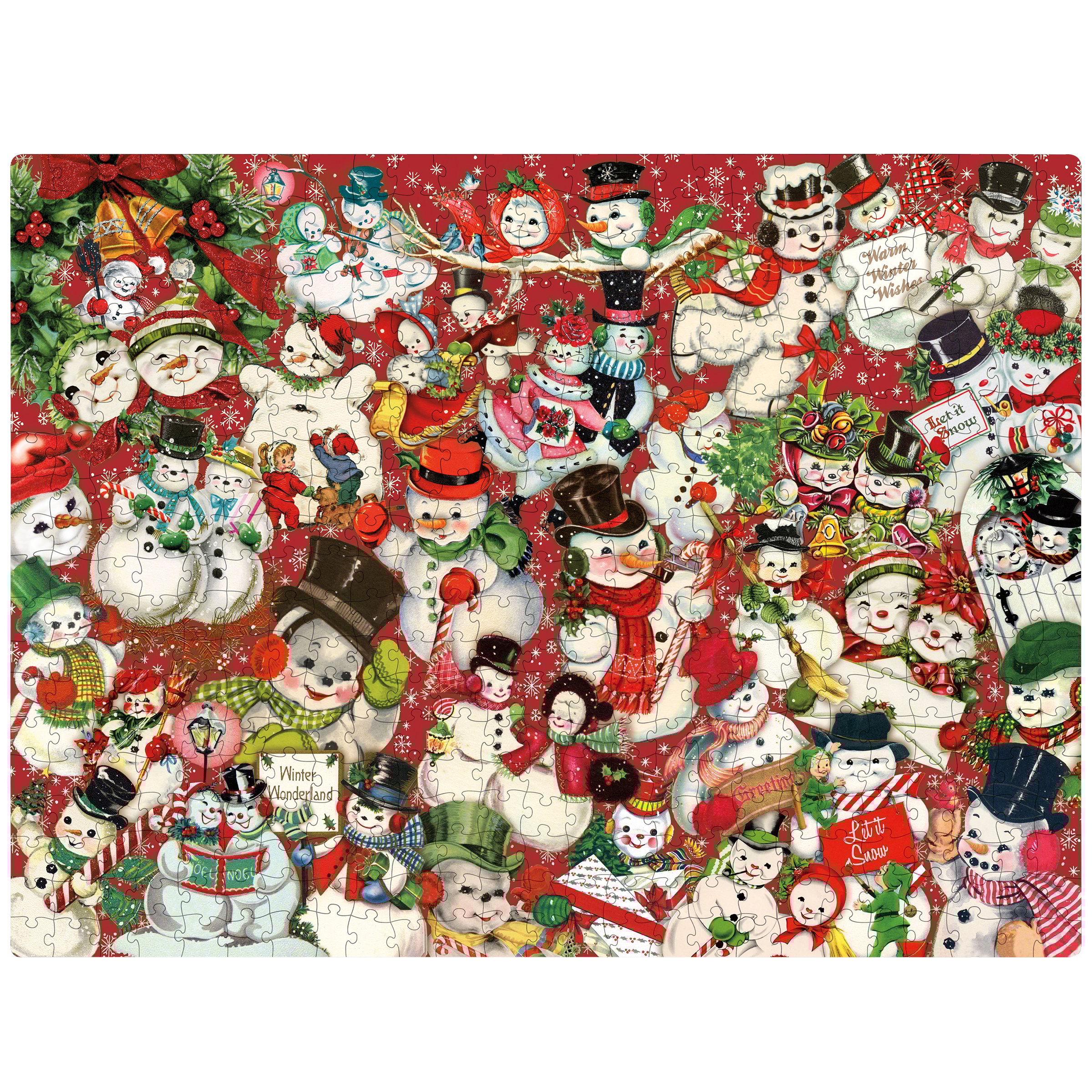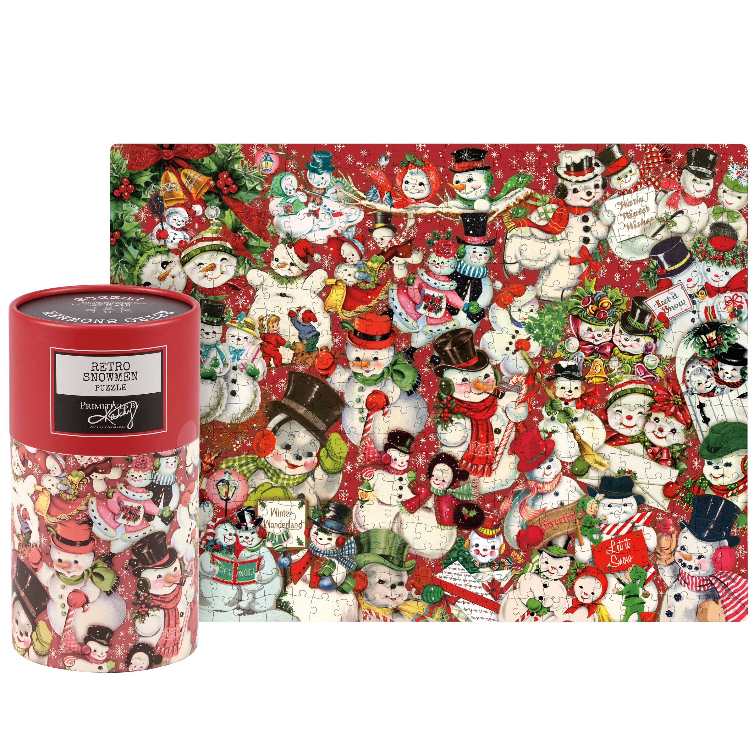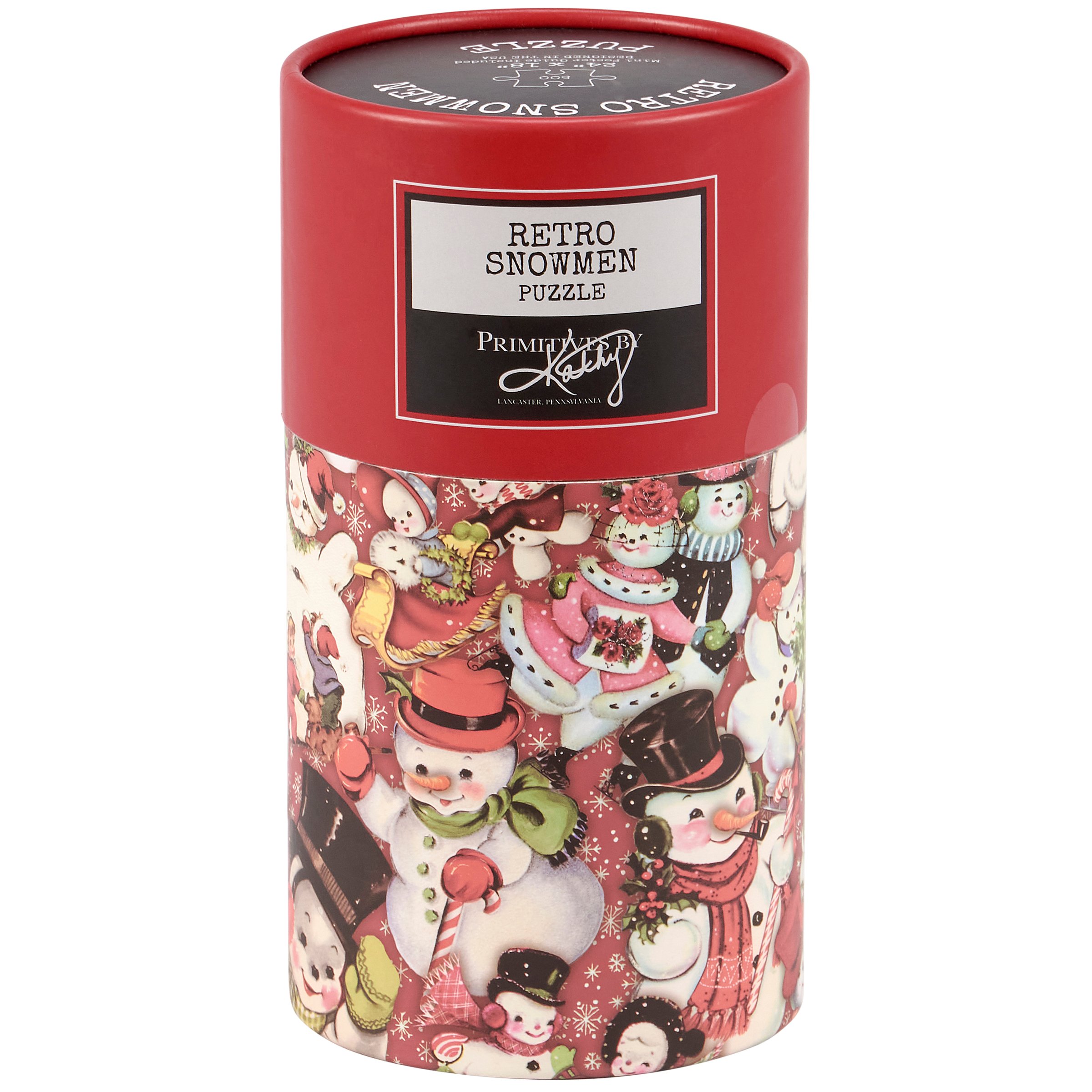 A 500 piece puzzle from our Christmas Collection displaying a collage of vintage jolly snowmen art. Puzzle pieces are packaged in a resealable plastic bag and enclosed in a cylindrical box with the design displayed around outside and a descriptive "Snowy Friends Puzzle" sentiment on lid. Our Snowy Friends puzzle includes an 10 inch x 8 inch printout of full puzzle image for reference. Contains small parts; this is not a toy. A charming accessory great for seasonal gifting.