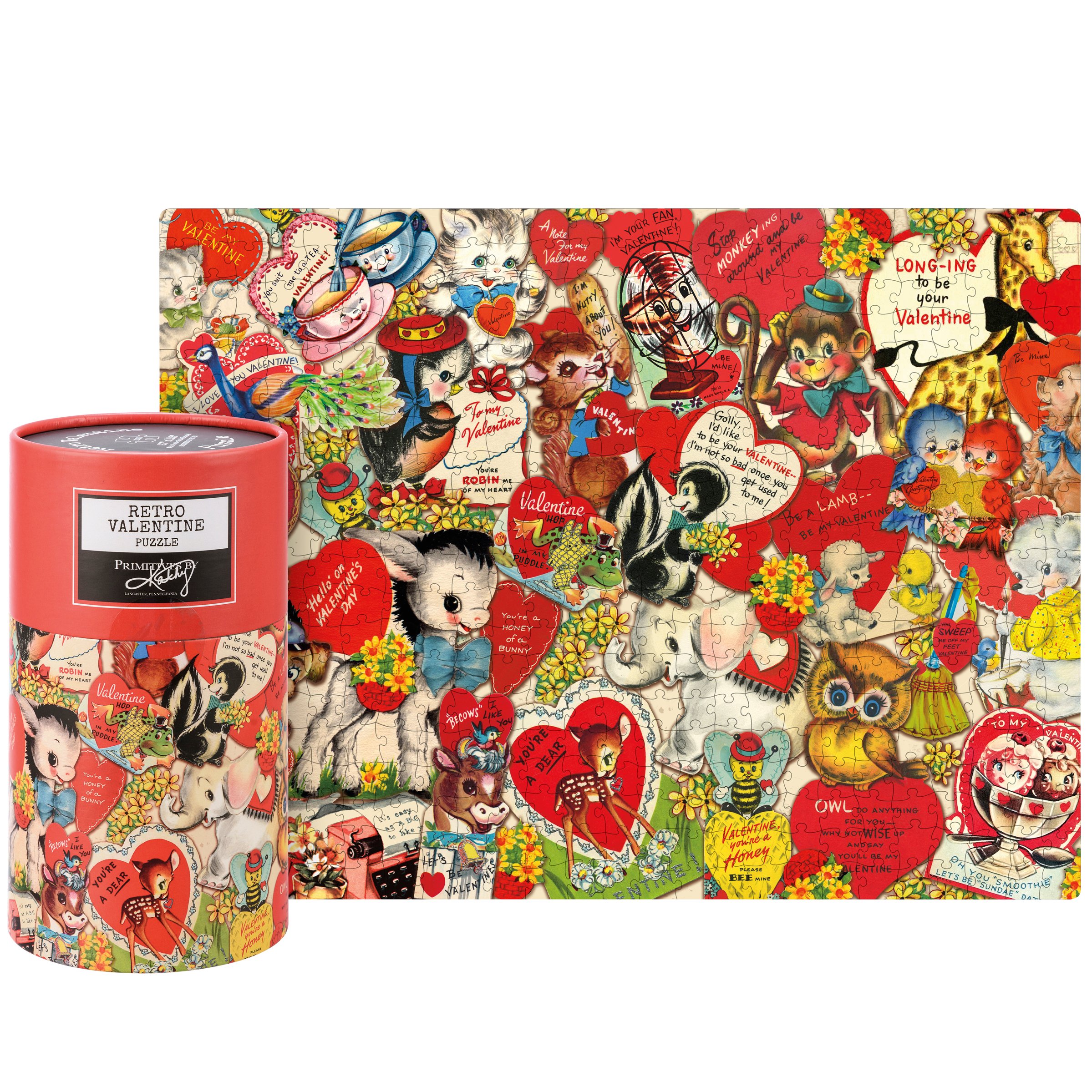 A 1,000 piece puzzle featuring a vintage Valentine design. Puzzle pieces are packaged in a resealable plastic bag and enclosed in a cylindrical box with the design wrapped around lid. Includes 10" x 8" printout of full puzzle image for reference.