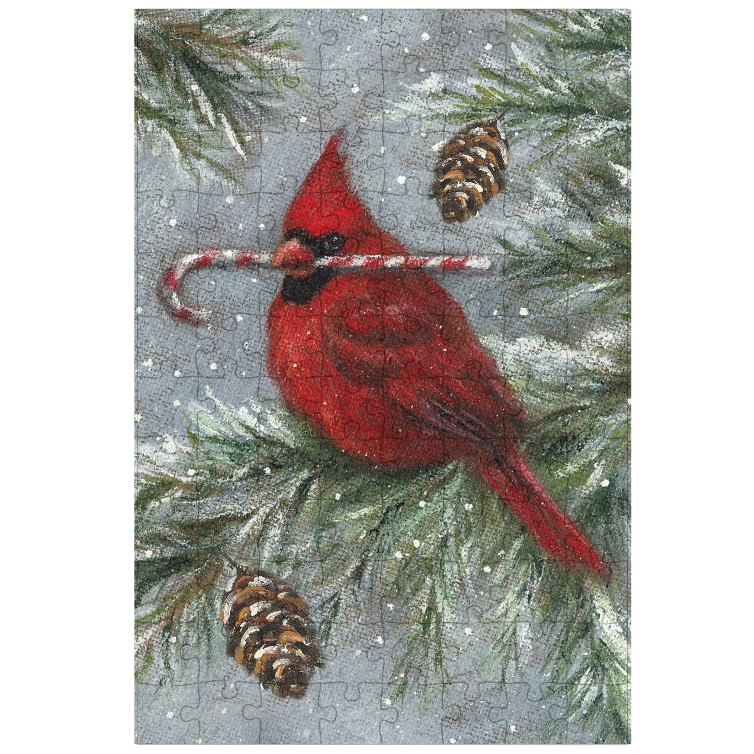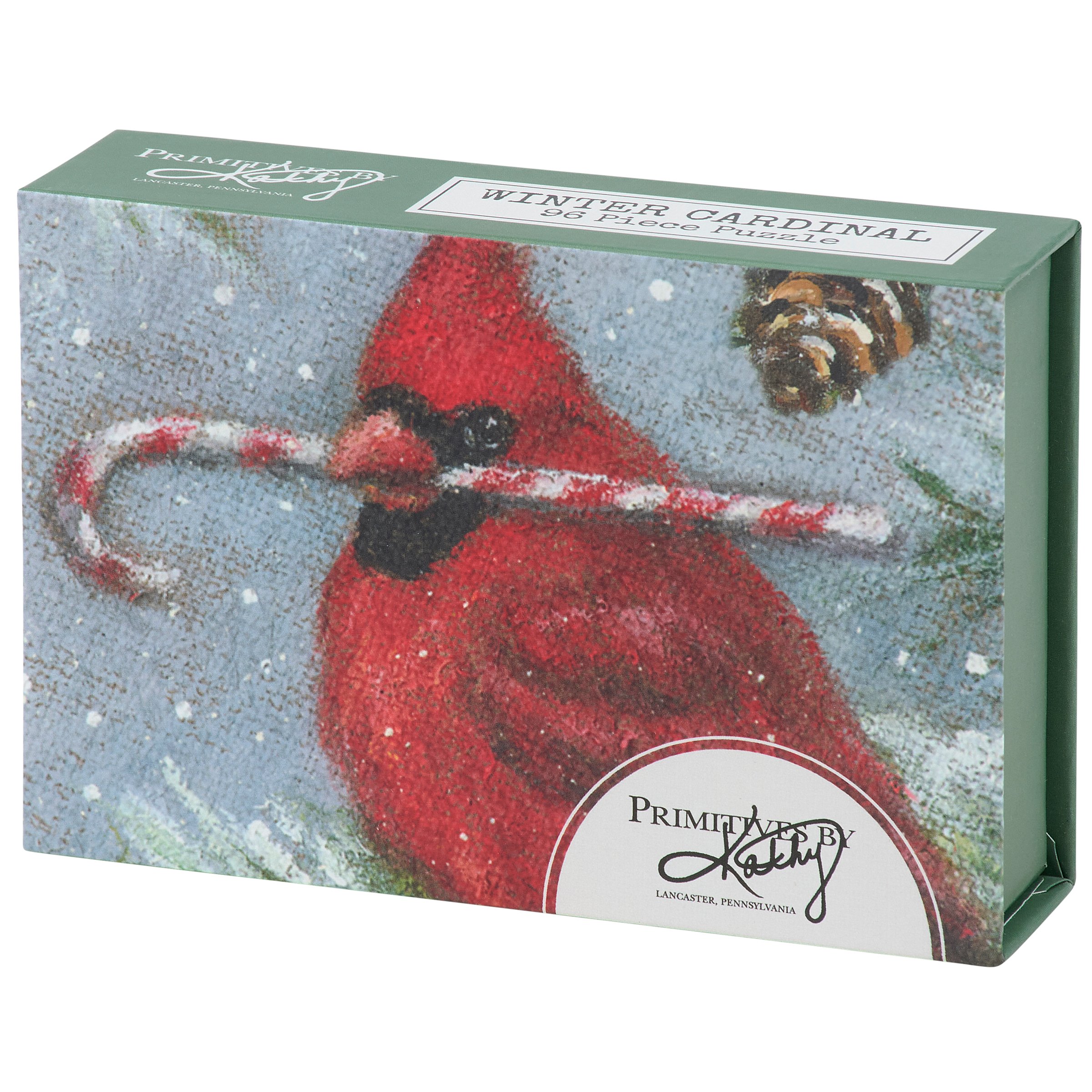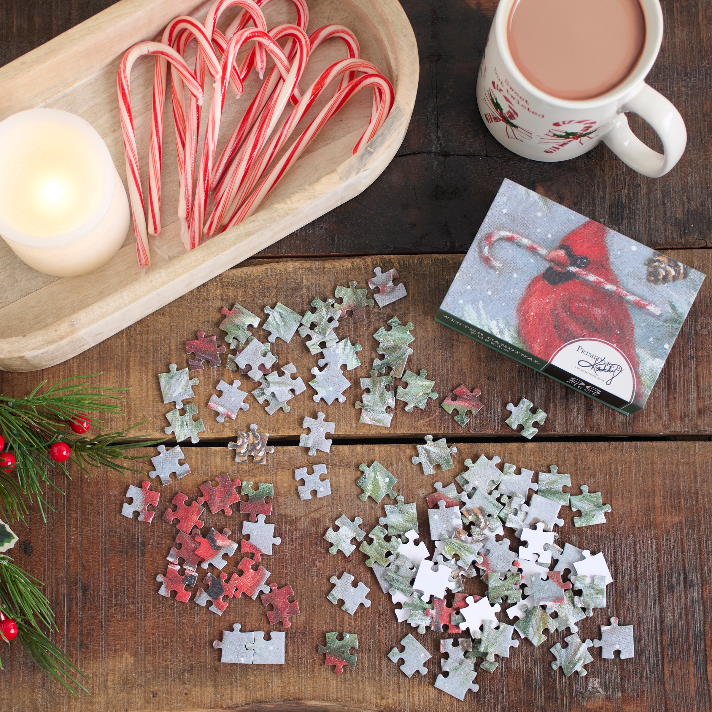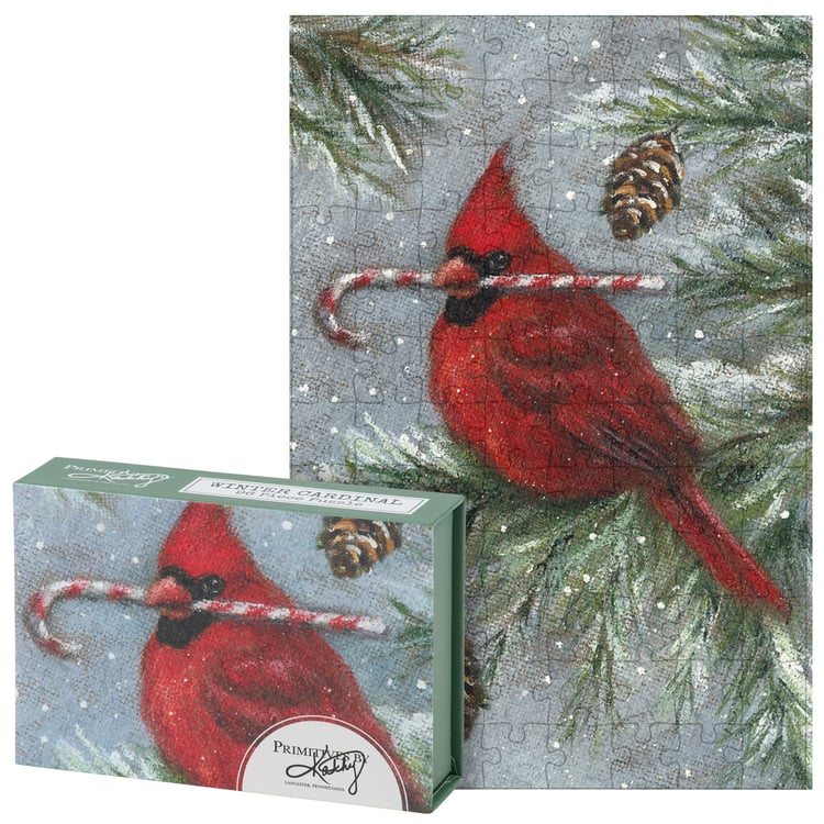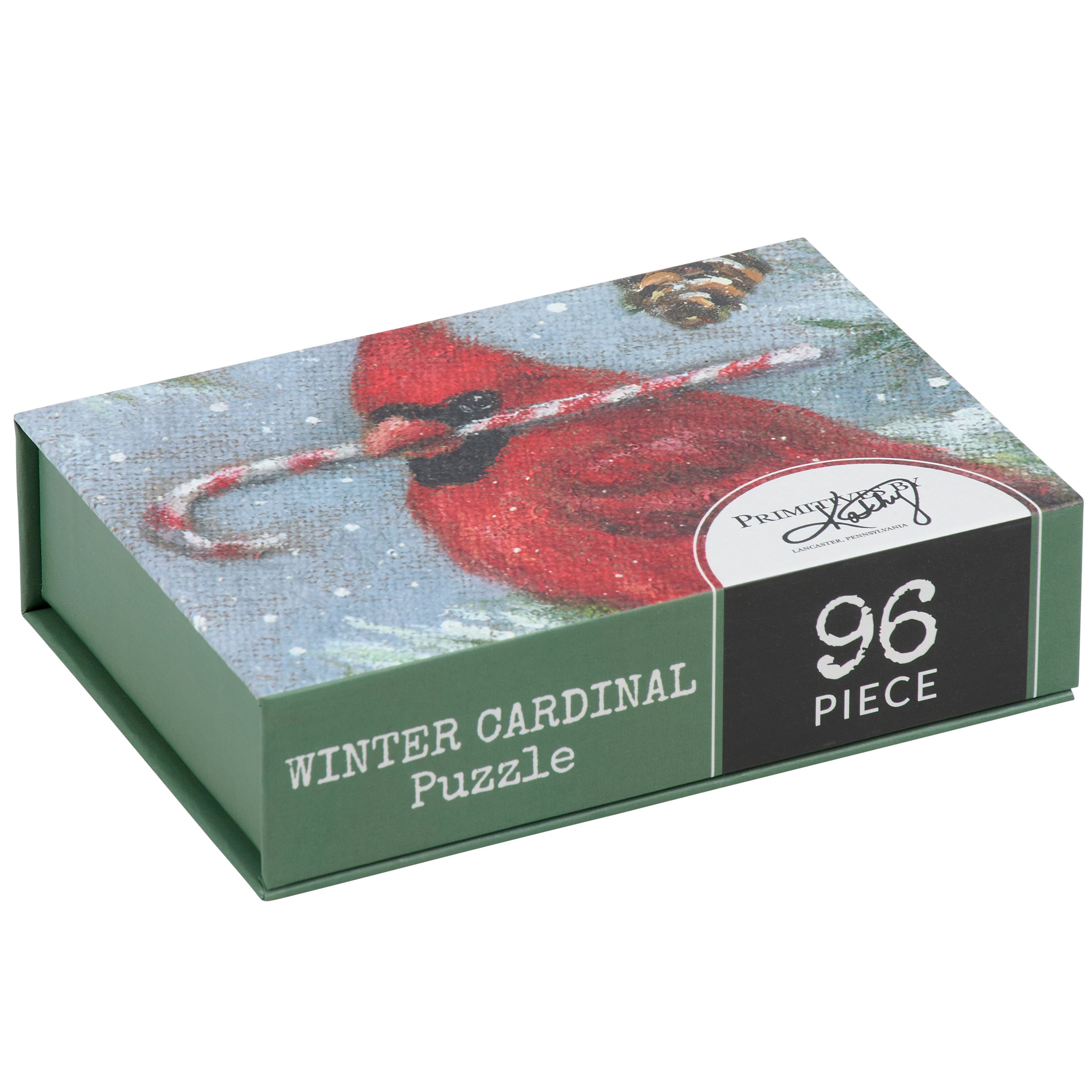 A 96 piece puzzle from our Christmas Collection displaying a charming winter scene of a cardinal holding a candy cane that is replicated from original artwork painted onto burlap canvas, giving the art a unique depth and texture. Puzzle pieces are packaged in a reusable bag and enclosed in a sturdy box with magnetic lid that is small enough to easily store in a bag or luggage and puzzle whenever the moment arrives. Our Winter Cardinal puzzle includes a print displaying the full puzzle image for reference. Contains small parts; this is not a toy. A cardinal themed Christmas gift perfect for on the go puzzle fun.