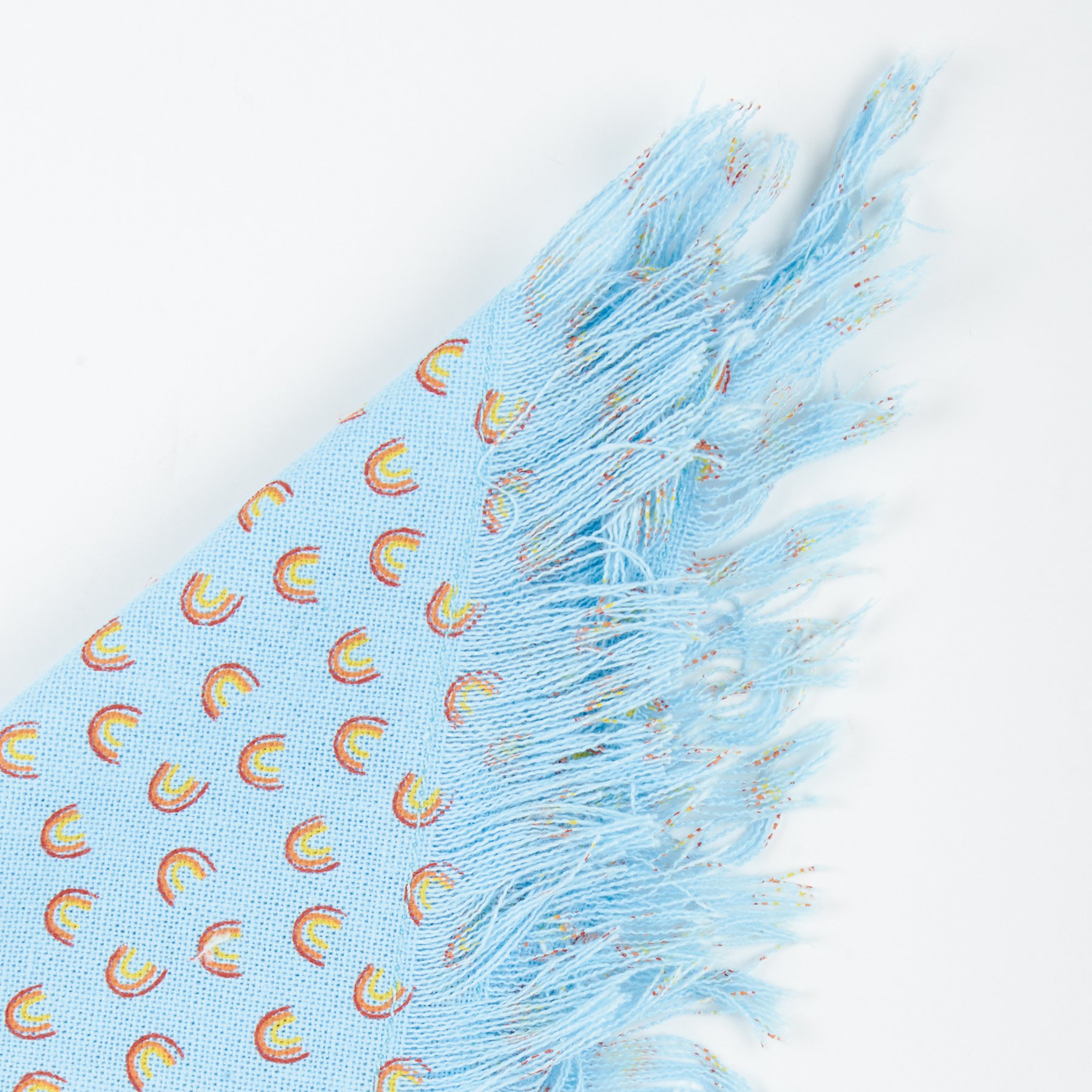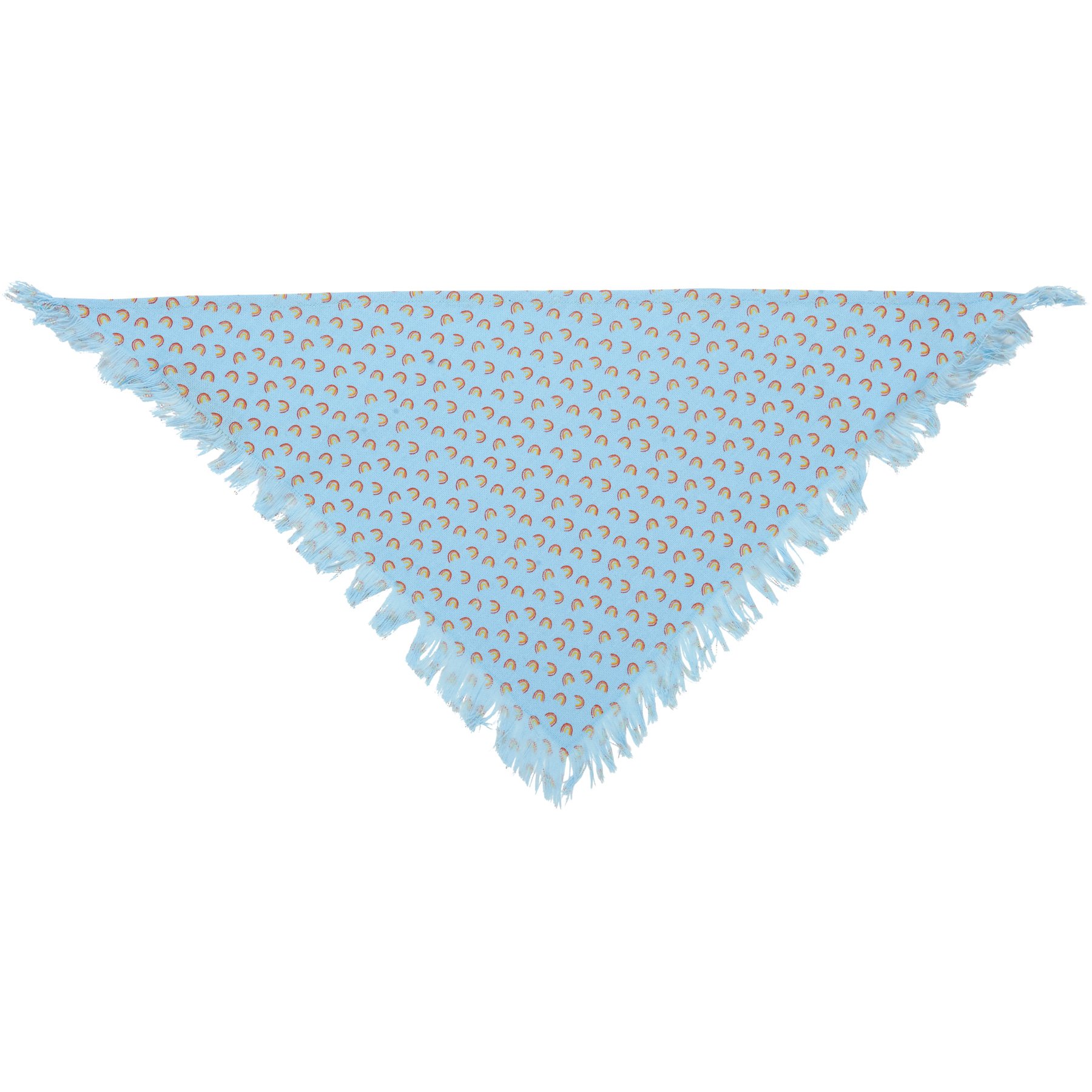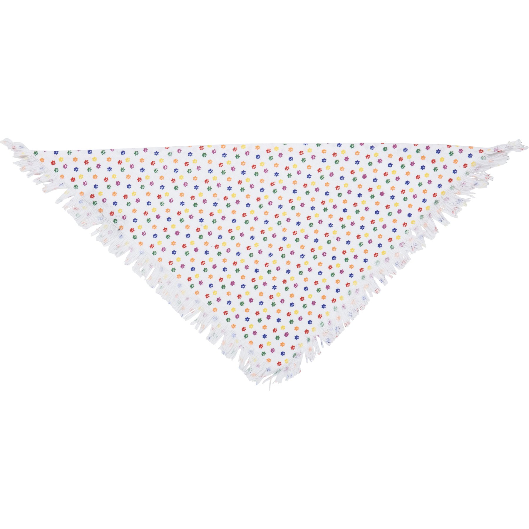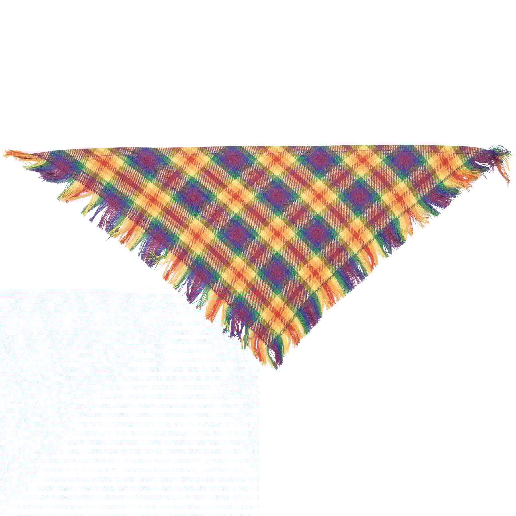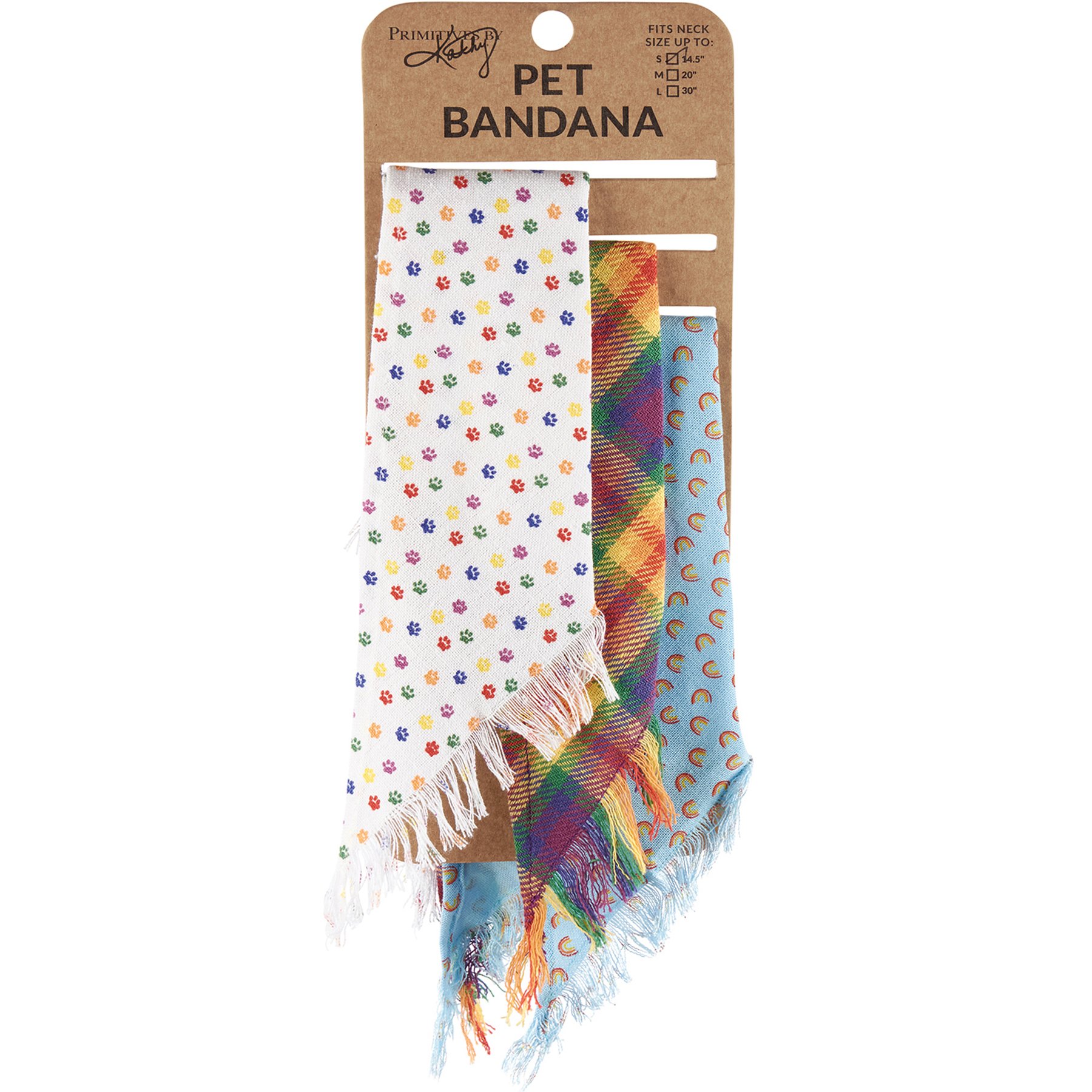 A set of three small pet bandanas from our Pet Collection displaying individual pride-themed designs and fashionable fringed trim. Designs include rainbow paw print pattern, rainbows pattern, and woven rainbow plaid. Pet bandanas coordinate well with complementing scarves and pet bow ties so pet parents and their furry family member can have a sweet matching moment. Each measures 20 inches x 10 inches and fit necks up to 14.5 inches. Machine-washable for convenient cleaning. Our Rainbow Plaid pet bandana set is folded on a kraft paper card with hole to easily hang on rack. A portion of the proceeds from the sale of this Benefit Item will be donated to Lancaster LGBTQ+ Coalition to support their commitment to building a more inclusive Lancaster County abundant in opportunities for LGBTQQIA+ individuals.