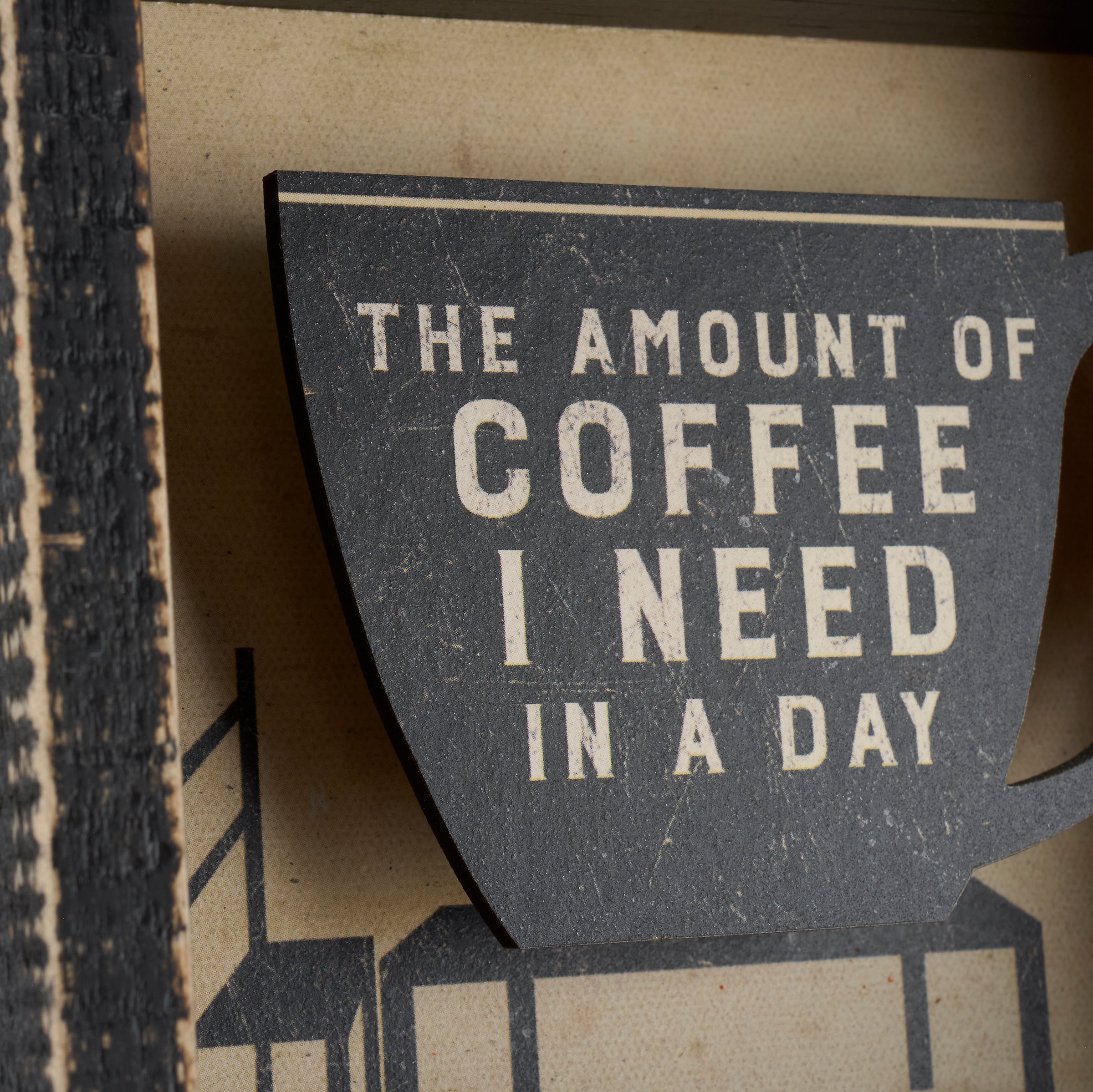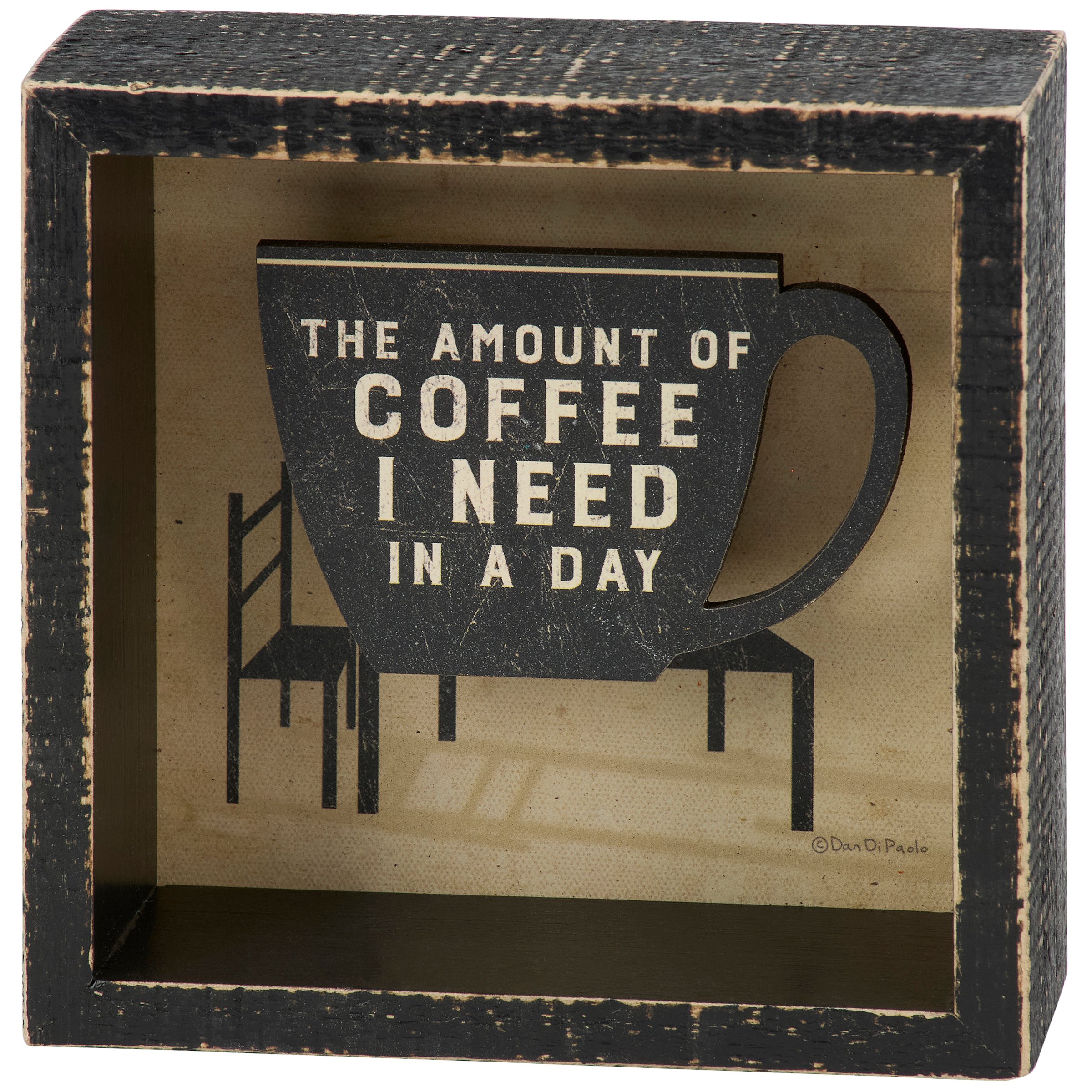A wooden box sign from our Tea & Coffee Gifts Collection featuring a rustic inset design of a dining table with a pop out wood piece in the shape of a large coffee cup displaying a fun coffee inspired sentiment that reads "The Amount Of Coffee I Need In A Day." Funny coffee box sign features distressed details with coordinating black color on sides and back. Our Coffee I Need In A Day reverse box sign is easy to hang via sawtooth hanger on the back or can free-stand on flat surface for display. A funny gift for coffee lovers that can be easily displayed in any home or work space.