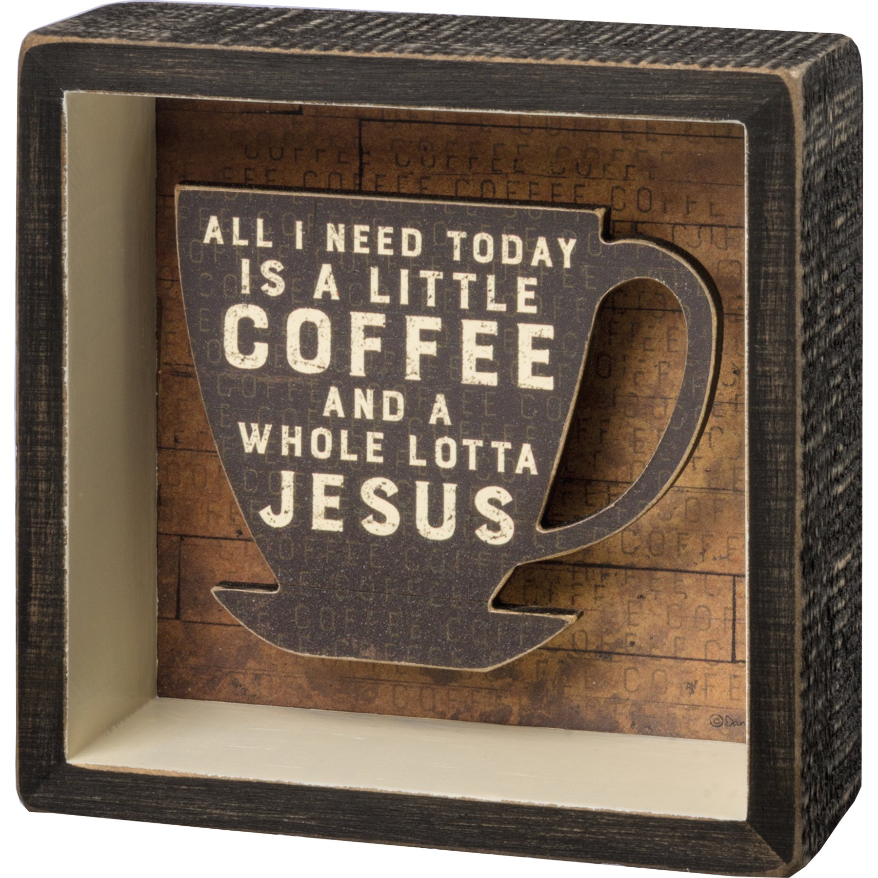 A rustic-inspired inset wooden box sign featuring a distressed "All I Need Today Is A Little Coffee And A Whole Lotta Jesus" sentiment, dimensional coffee cup detail, and slatted wood background print. Complements well with existing decor or coordinating design pieces. Coffee and Jesus sign is easy to hang or can free-stand alone.
