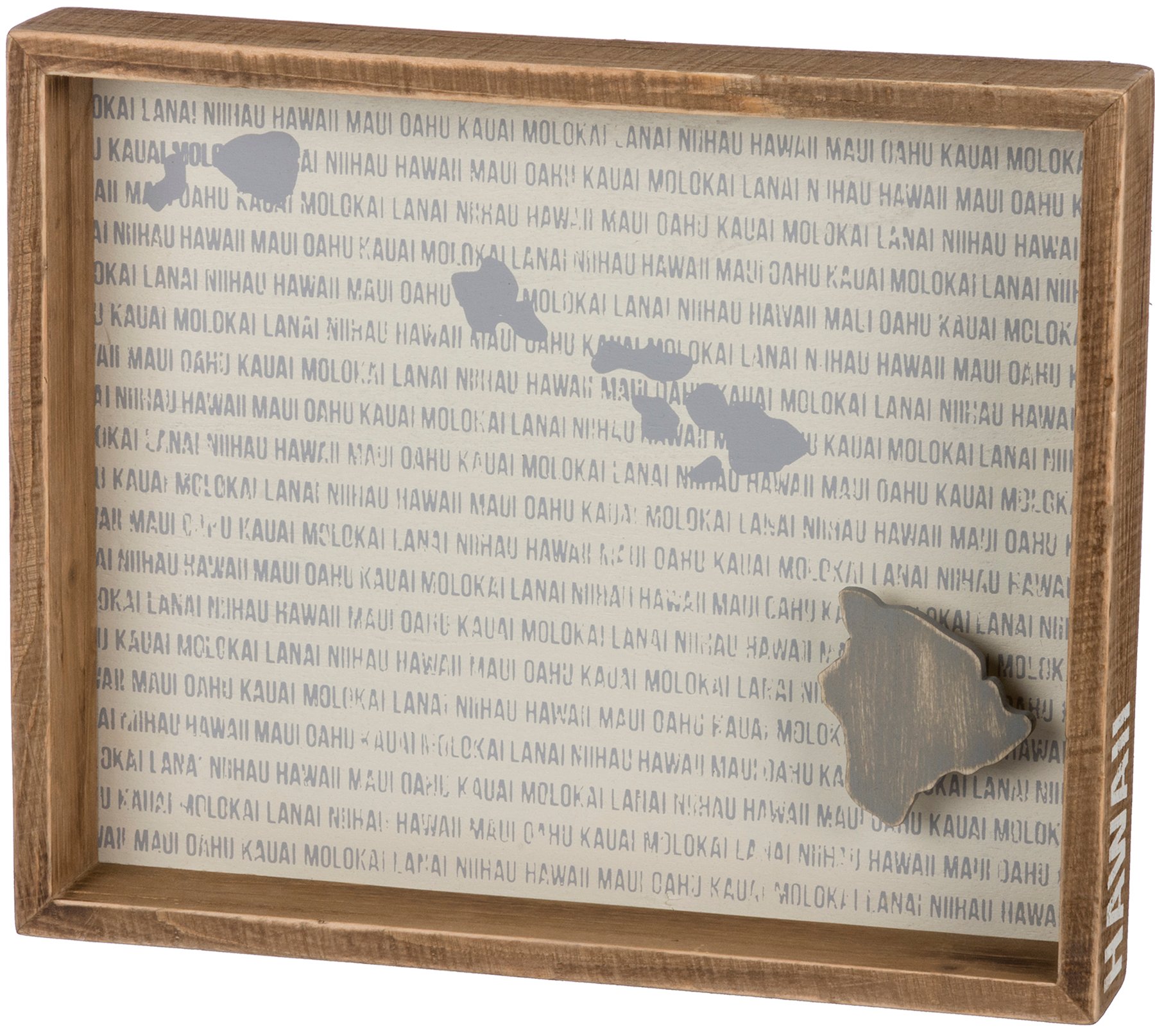 A reverse box sign featuring a pop-out element shaped like the state of Hawaii. Background features names of cities found in the state and outside edge features state name. This item includes tagging that may need to be removed before resale.