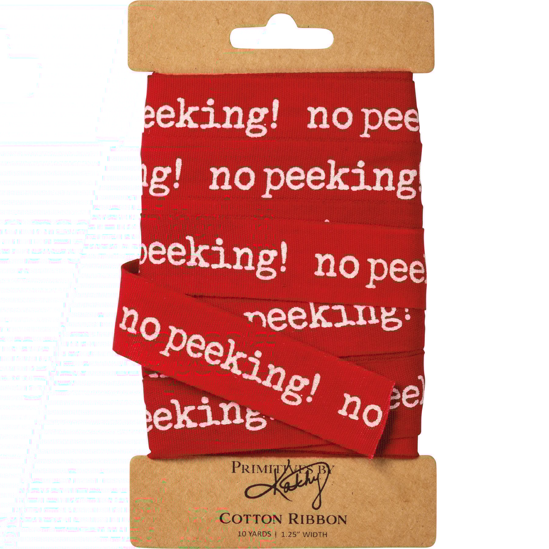 A cotton Christmas ribbon featuring a "No Peeking!" sentiment. 10 yards.