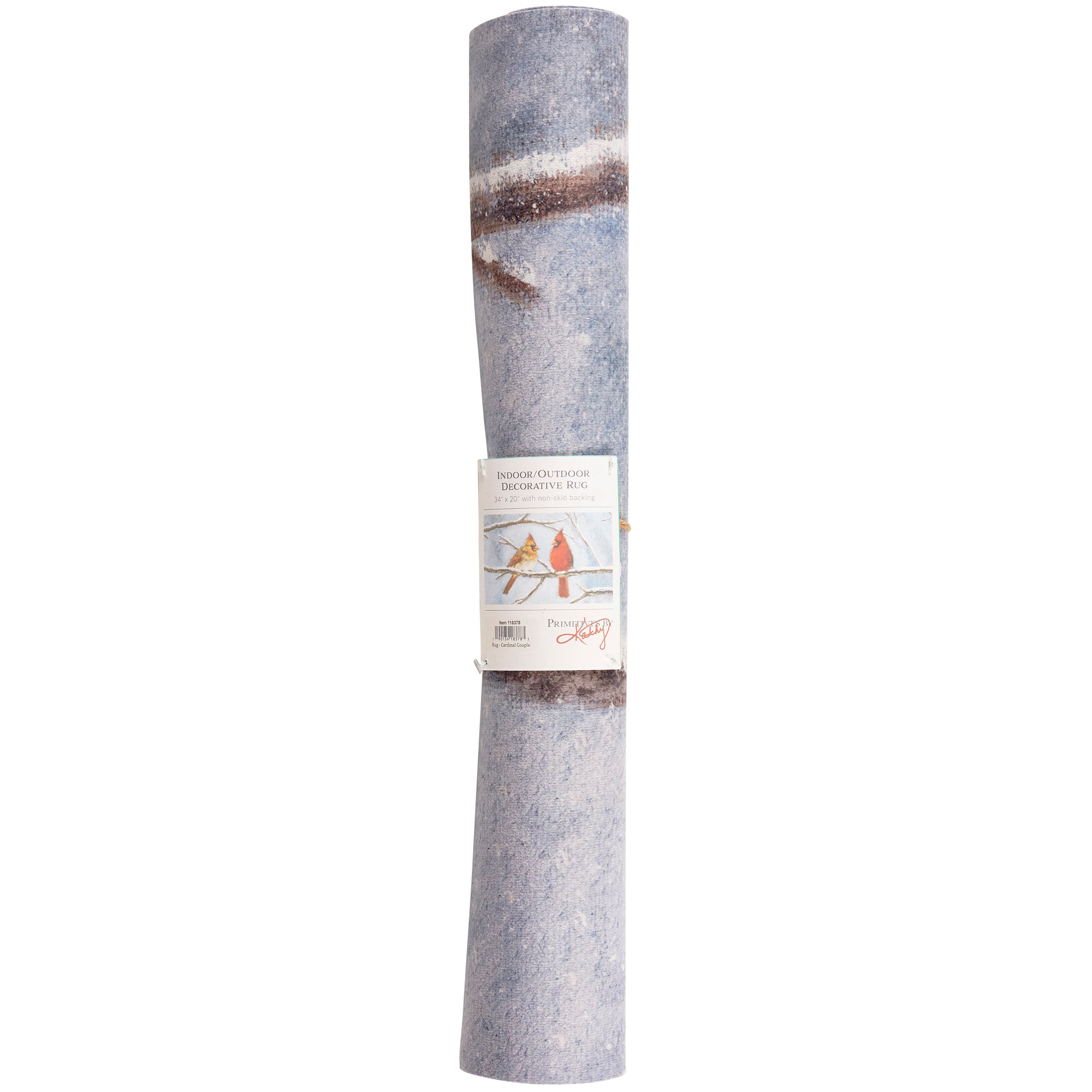 A polyester rug from our Christmas Collection displaying a charming winter scene of a male and female cardinal. Design is replicated from original artwork painted onto burlap canvas, giving the art a unique depth and texture. Rug can be used indoor or outdoor and features skid-resistant backing to help stay in place. Spot cleaning recommended. Our Cardinal Couple rug comes packaged neatly rolled with tag displaying full rug design. A winter-themed seasonal home accent that adds functional style.