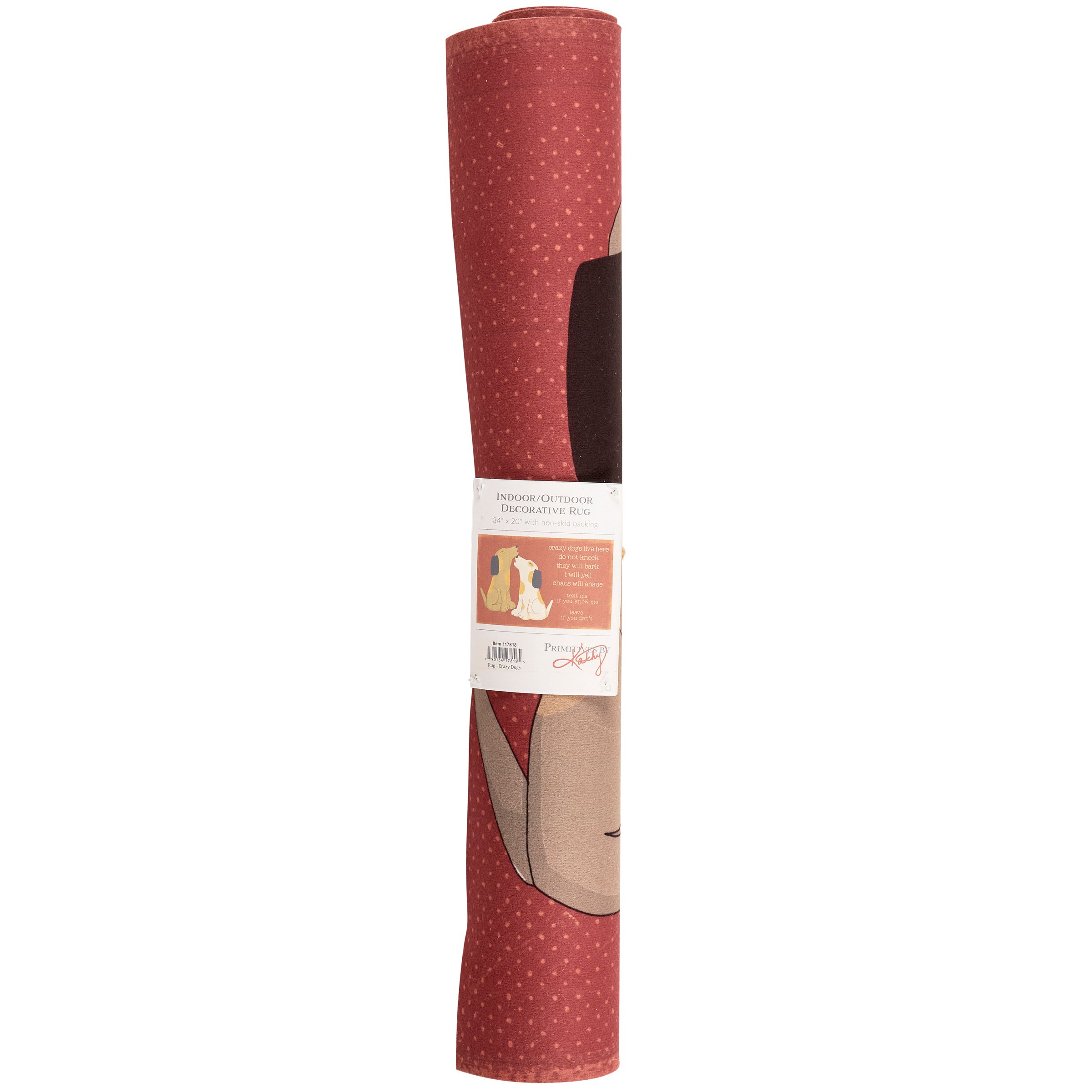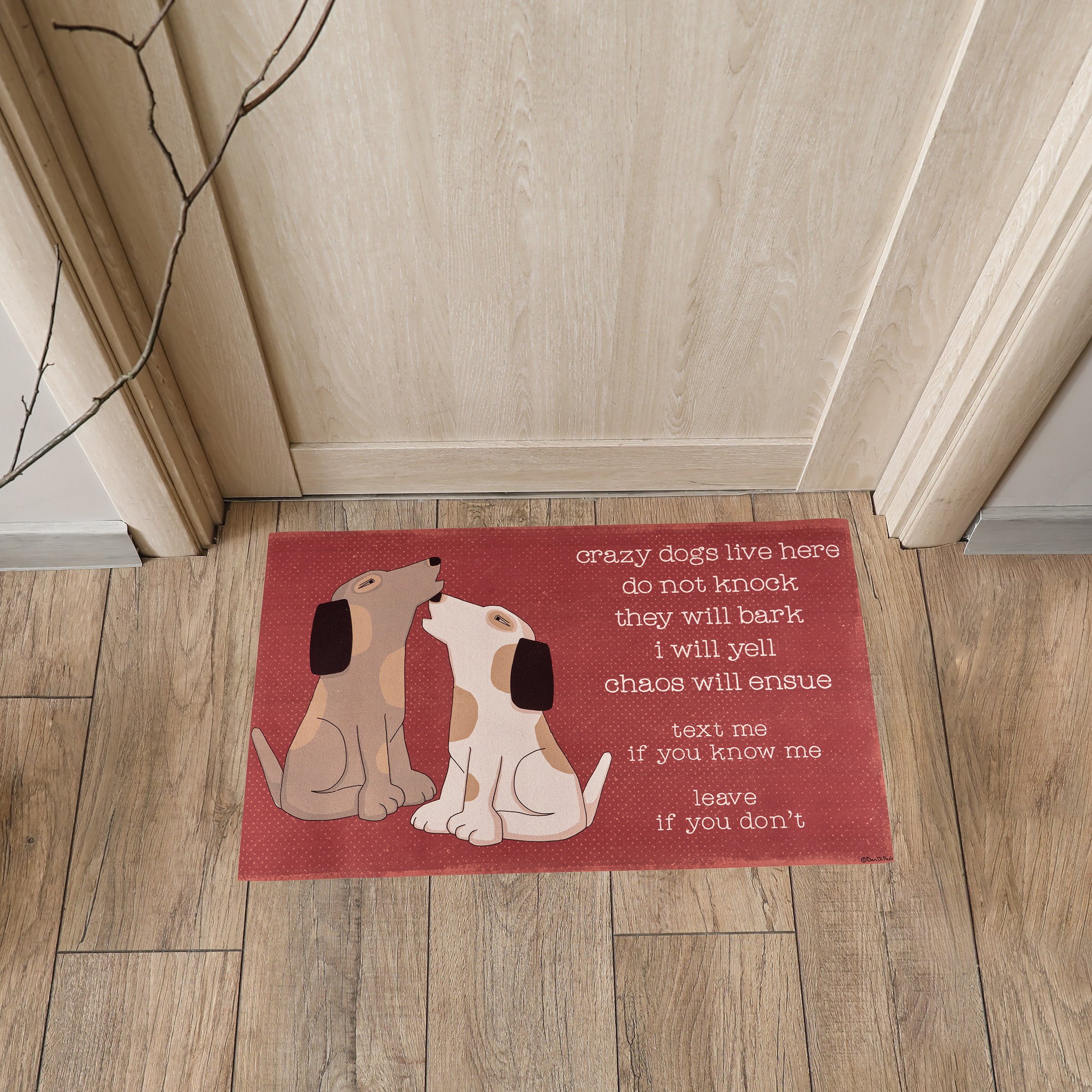 A polyester rug from our Pet Collection displaying a rustic inspired design of dogs barking with a humorous pet-themed sentiment that reads "Crazy Dogs Live Here - Do Not Knock - They Will Bark - I Will Yell - Chaos Will Ensue - Text Me If You Know Me - Leave If You Don't." Rug can be used indoor or outdoor and features skid-resistant backing to help stay in place. Spot cleaning recommended. Our Crazy Dogs rug comes packaged neatly rolled with tag displaying full rug design. A fun pet-themed home accent that adds functional style.