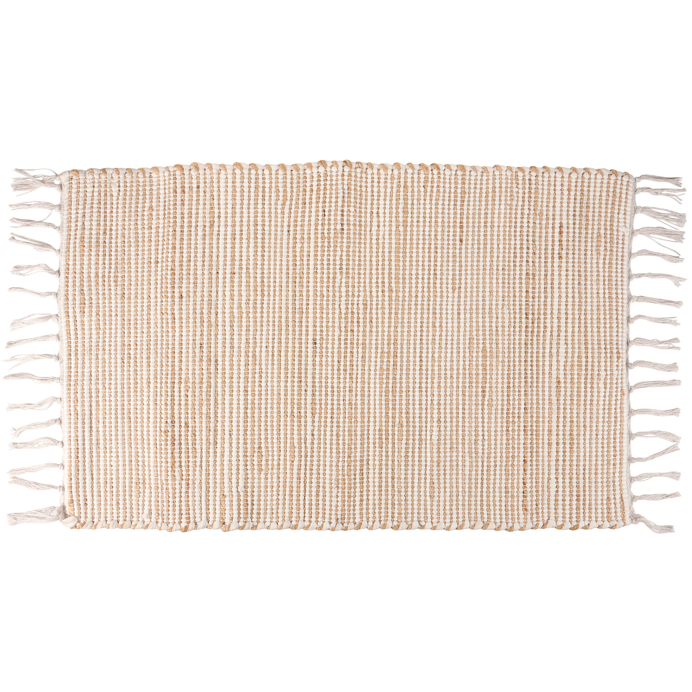 A cotton rug from our Home Collection displaying a neutral cream and brown woven design with tassels on the sides. Woven rug can be used indoor or covered outdoor and features skid-resistant backing to help stay in place. Spot cleaning recommended. Our Cream Woven rug comes packaged neatly rolled with hangtag. A neutral home accent that coordinates with a variety of home decor.
