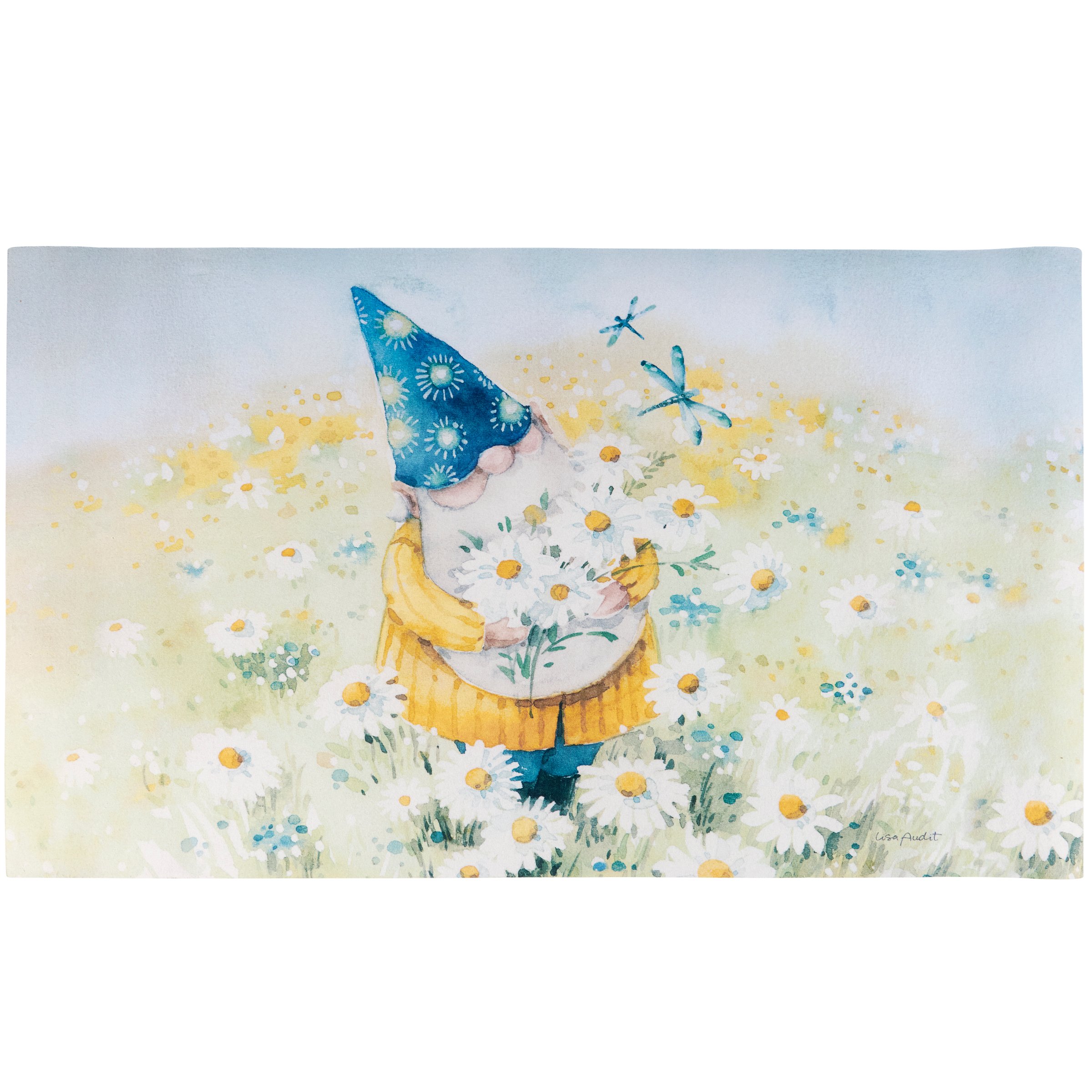 A polyester rug from our Garden Collection displaying of a scene of a cheerful gnome gathering daisies and looking at blue dragonflies. Design is replicated from original art hand painted in a delicate watercolor style. Rug can be used indoor or outdoor and features skid-resistant backing to help stay in place. Spot cleaning recommended. Our Daisy Gnome rug comes packaged neatly rolled with tag displaying full rug design. A charming daisy-themed home accent that adds functional style.