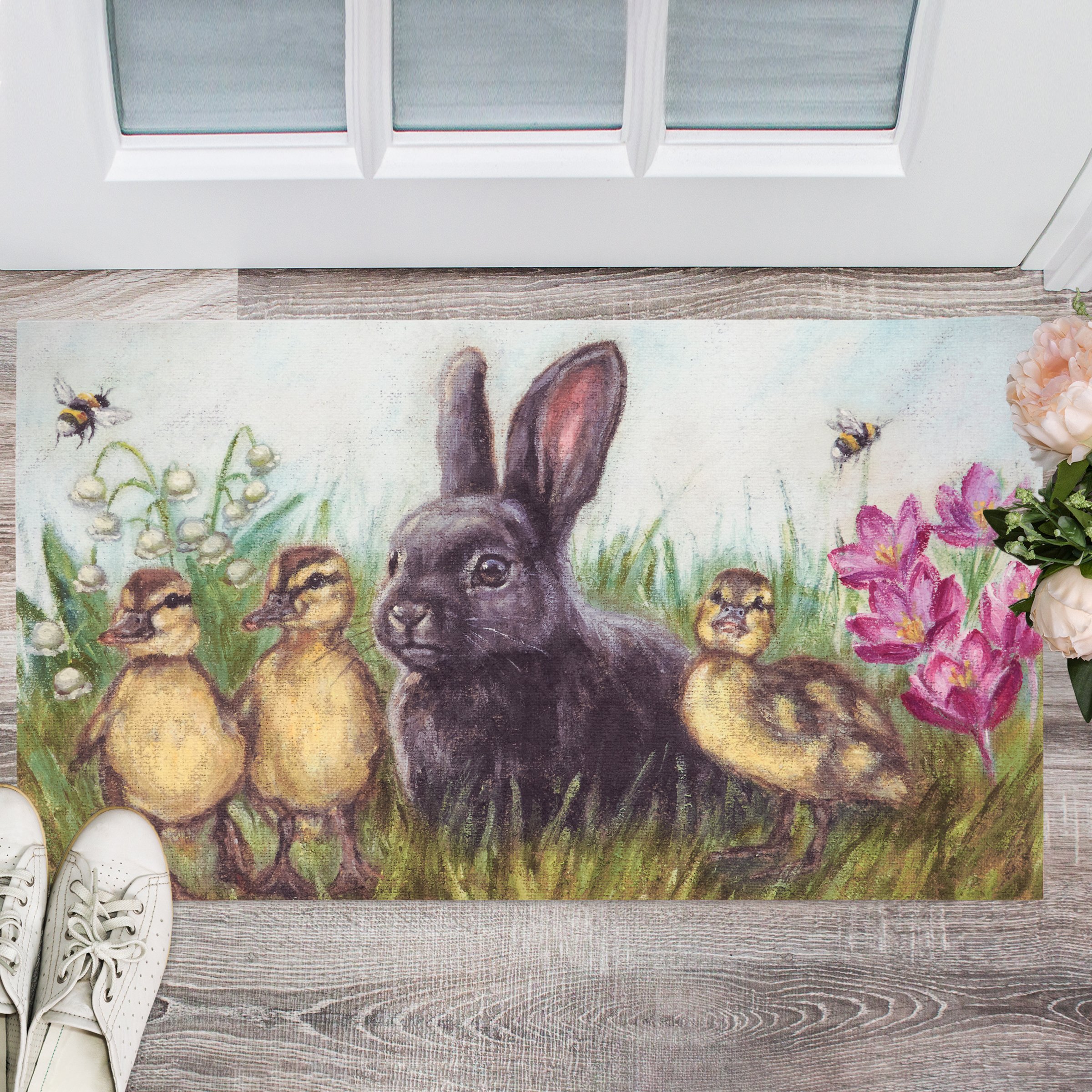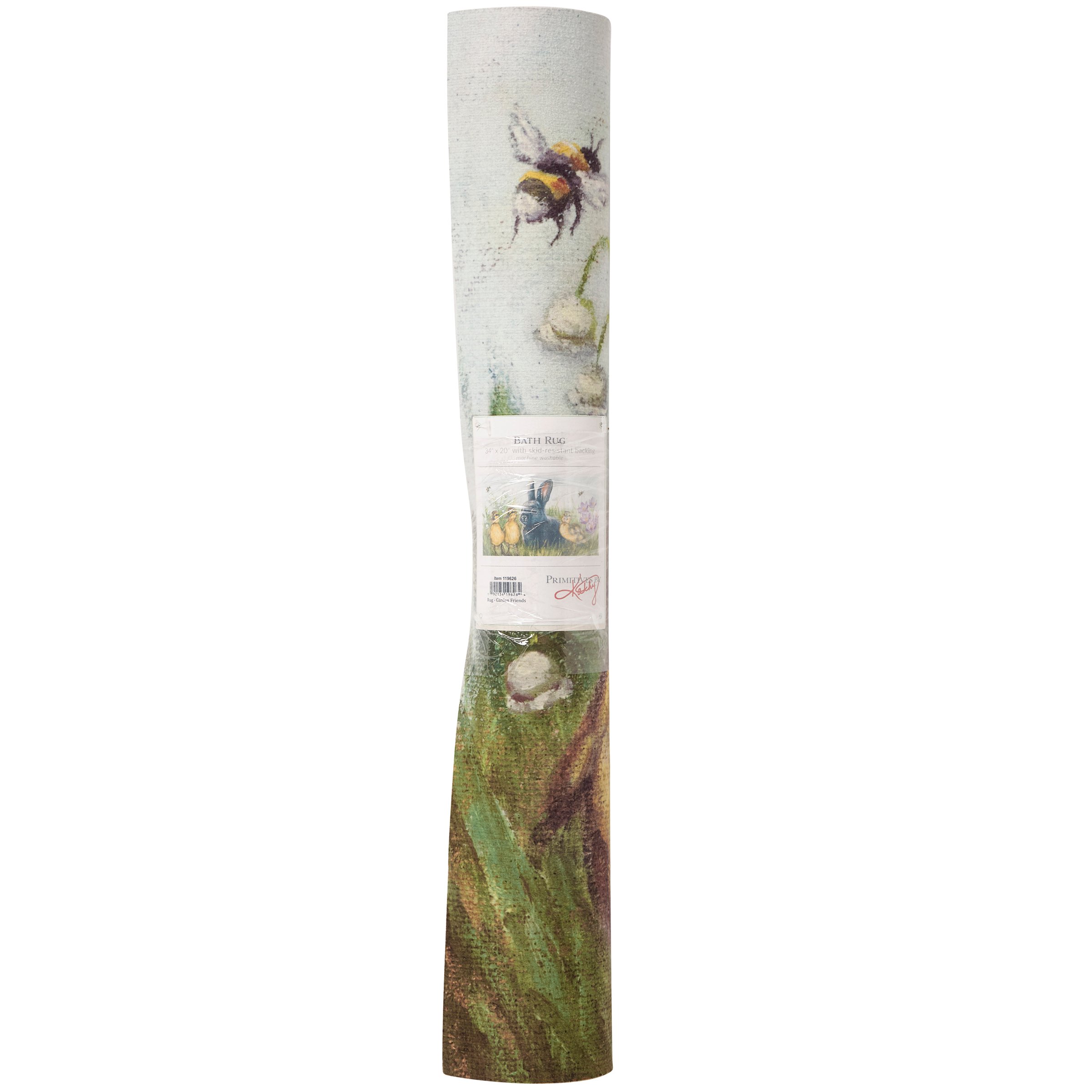 A polyester rug from our Easter & Spring Collection displaying a comforting scene of a bunny with ducklings in a garden of spring flowers and bees. Design is replicated from original artwork painted onto burlap canvas, giving the art a unique depth and texture. Rug can be used indoor or outdoor and features skid-resistant backing to help stay in place. Spot cleaning recommended. Our Garden Friends rug comes packaged neatly rolled with tag displaying full rug design. A charming seasonal home accent that adds functional style.